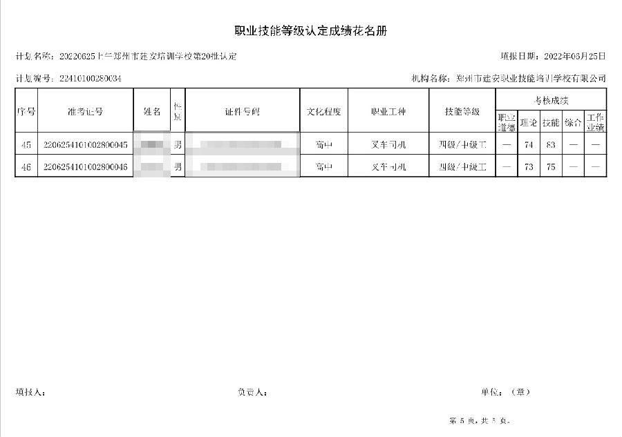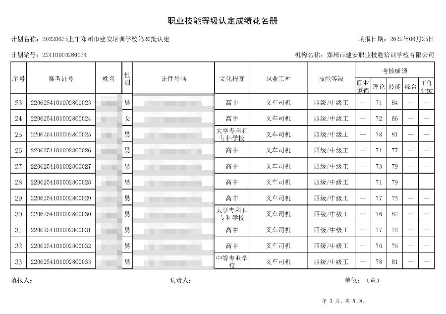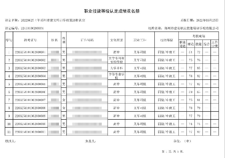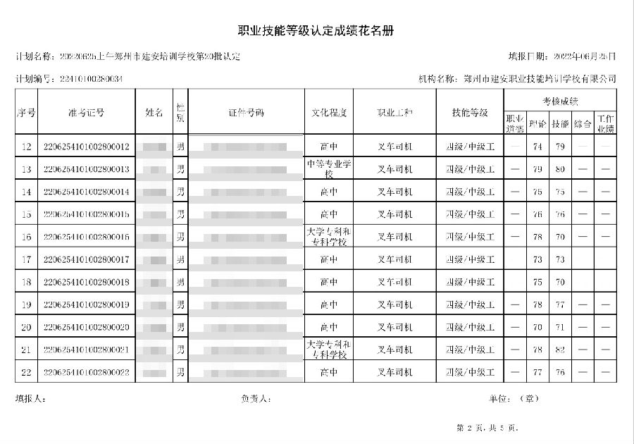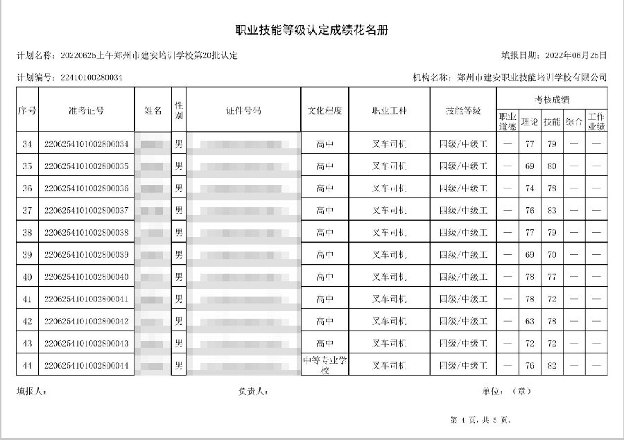 2022年6月25日上午,在郑州市建安技能培训学校进行的【叉车司机 四级/中级工】职业技能等级认定考试,阅卷工作已结束,现将各位考生成绩予以公示,公示期为7天,公示期限为:2022年6月28日至2022年7月5日。