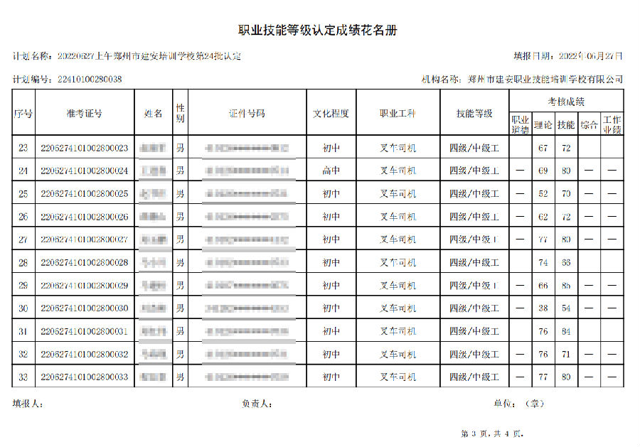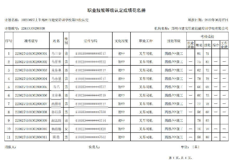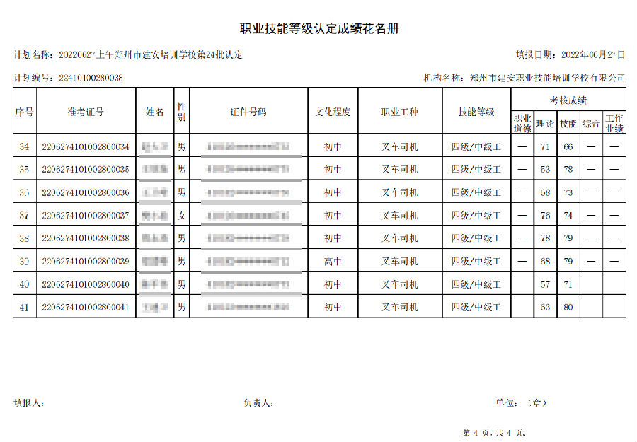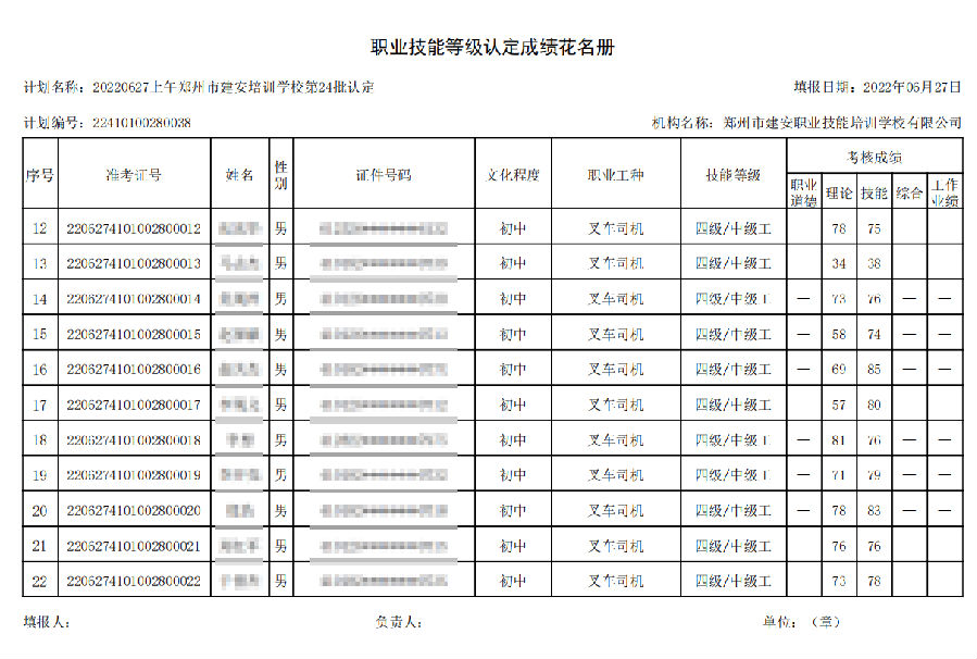2022年6月27日上午,在郑州市建安技能培训学校进行的【叉车司机 五级/中级工】职业技能等级认定考试,阅卷工作已结束,现将各位考生成绩予以公示,公示期为7天,公示期限为:2022年6月29日至2022年7月6日。