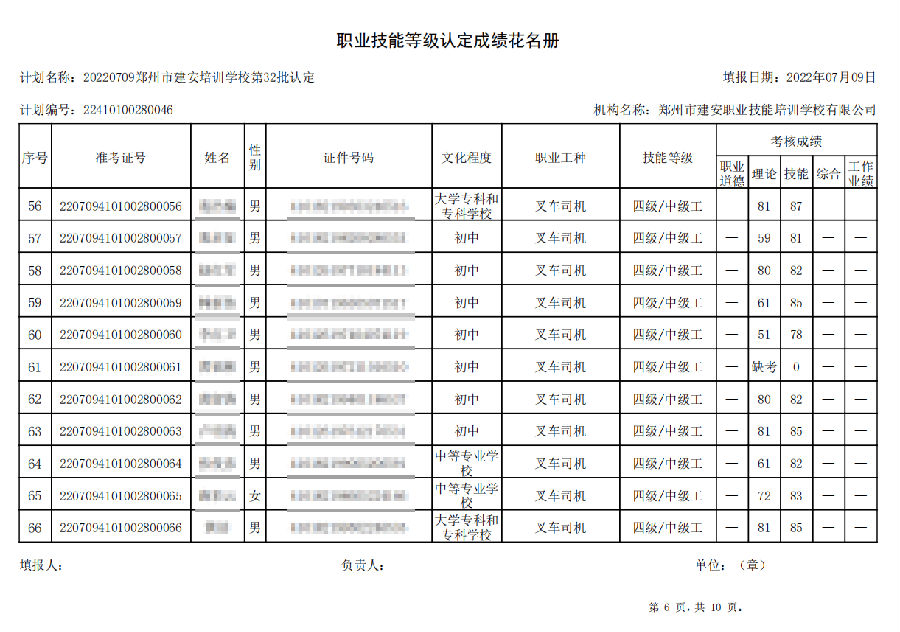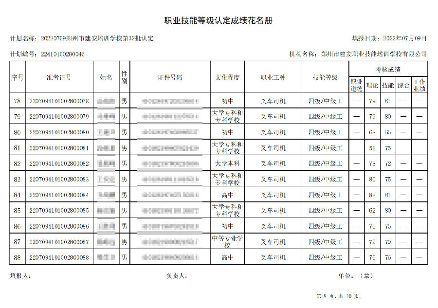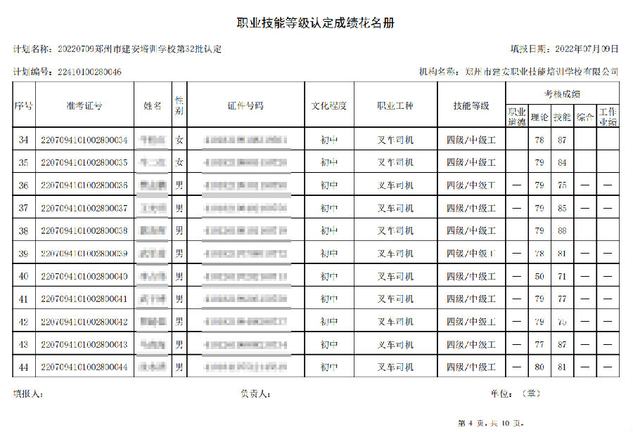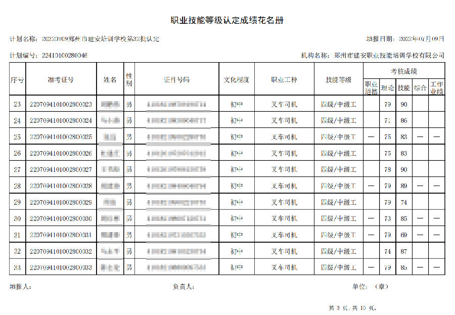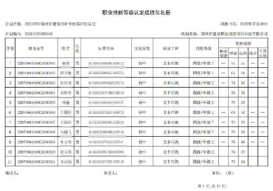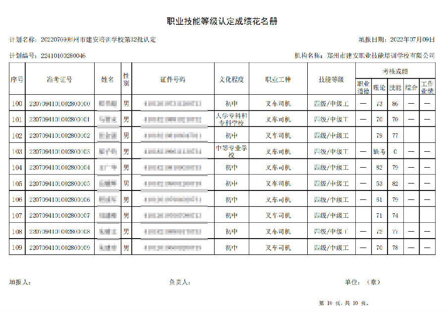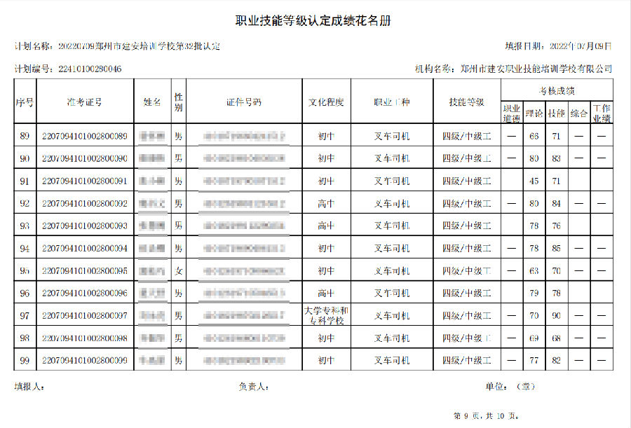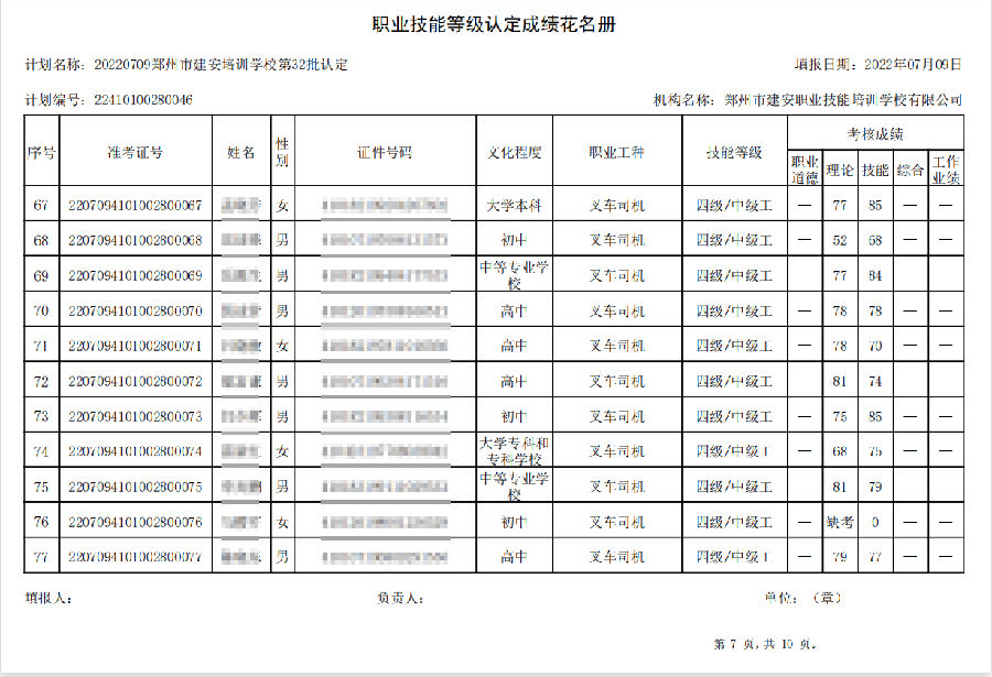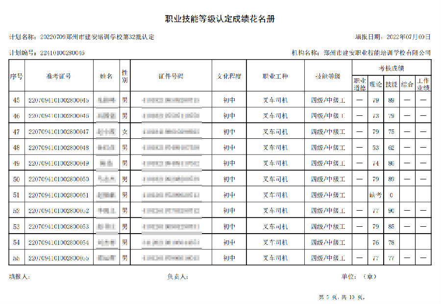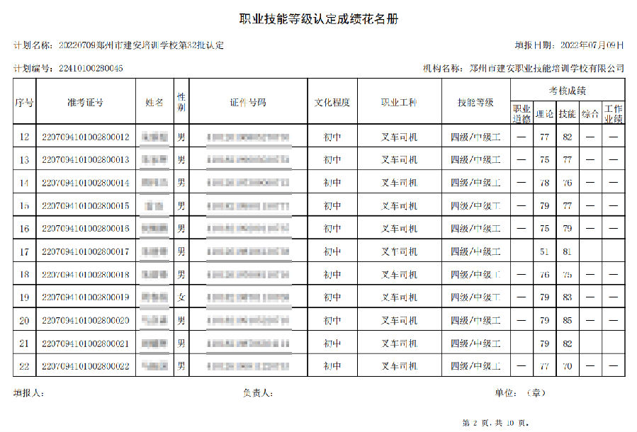 2022年7月9日,在郑州市建安技能培训学校进行的【叉车司机 五级/中级工】职业技能等级认定考试,阅卷工作已结束,现将各位考生成绩予以公示,公示期为7天,公示期限为:2022年7月12日至2022年7月19日。