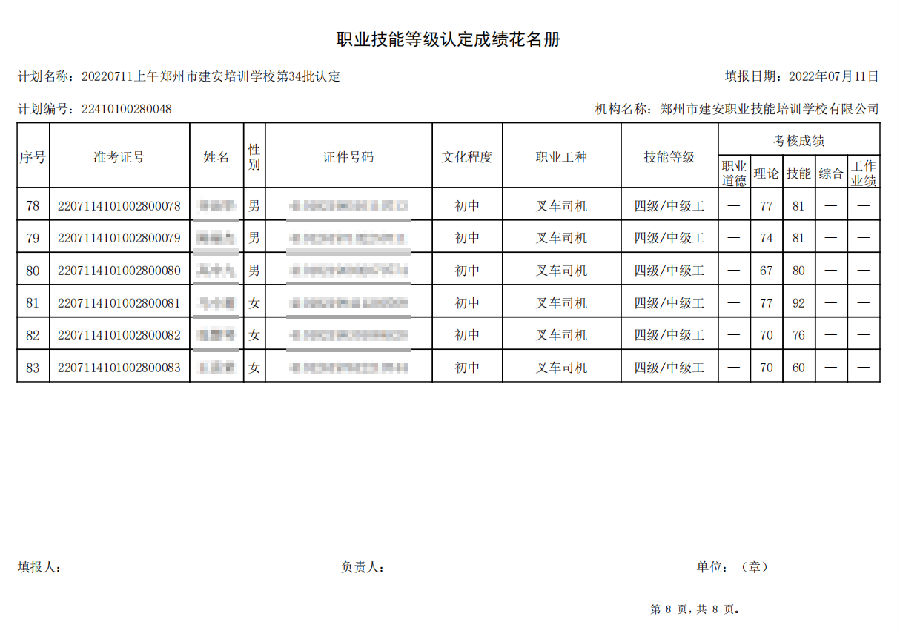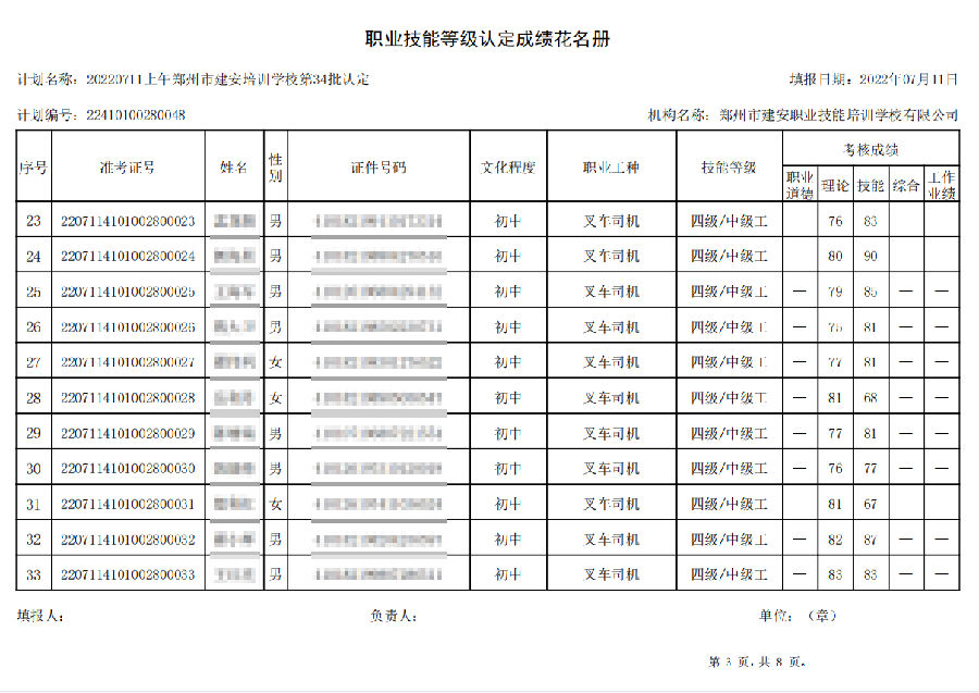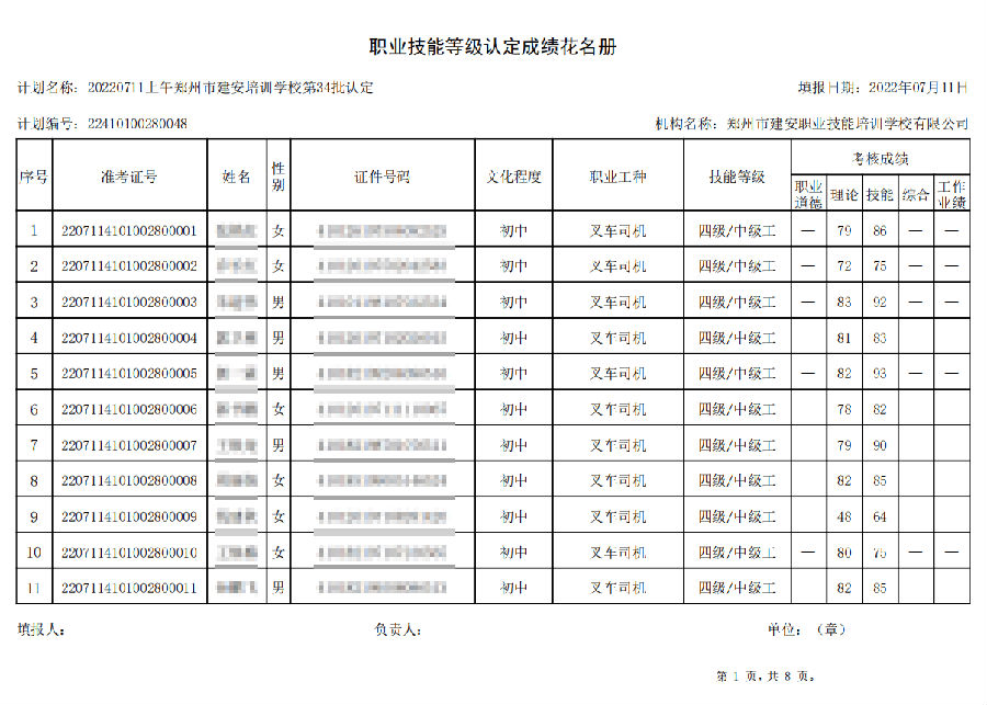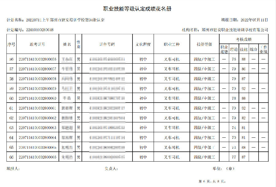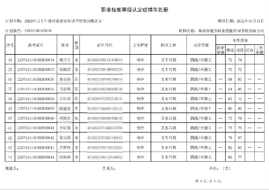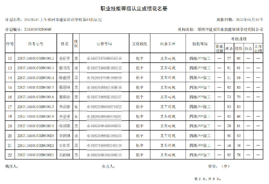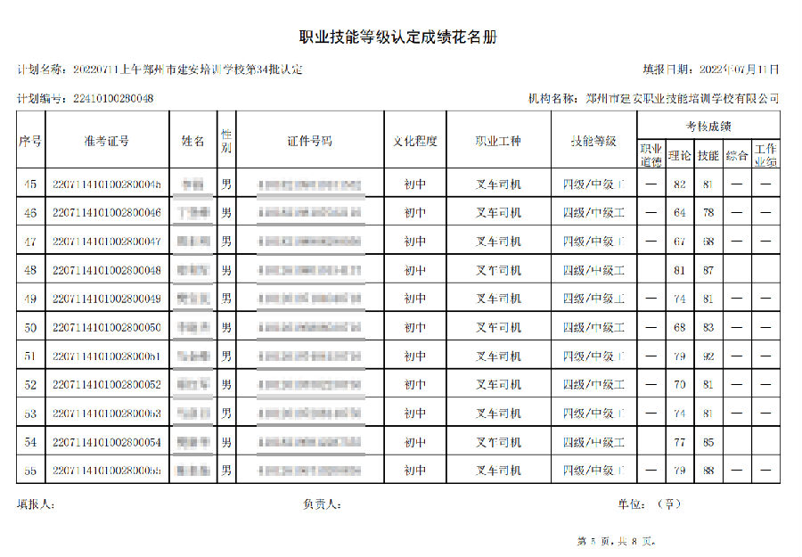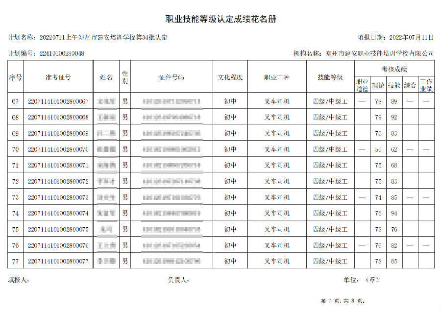 2022年7月11日上午,在郑州市建安技能培训学校进行的【叉车司机 五级/中级工】职业技能等级认定考试,阅卷工作已结束,现将各位考生成绩予以公示,公示期为7天,公示期限为:2022年7月12日至2022年7月19日。