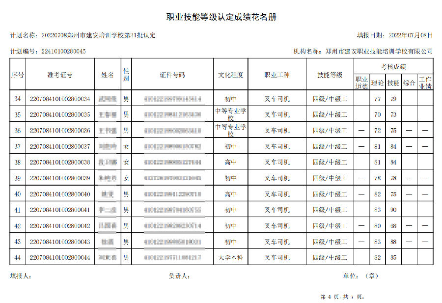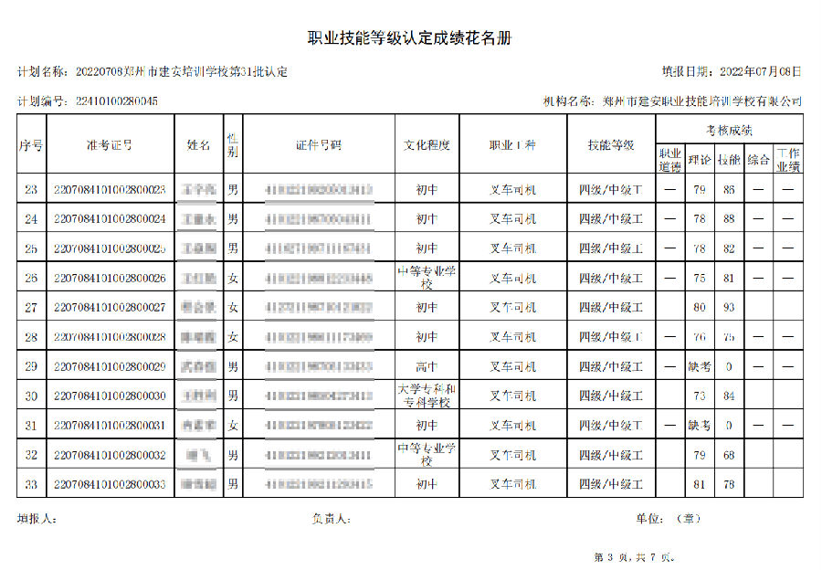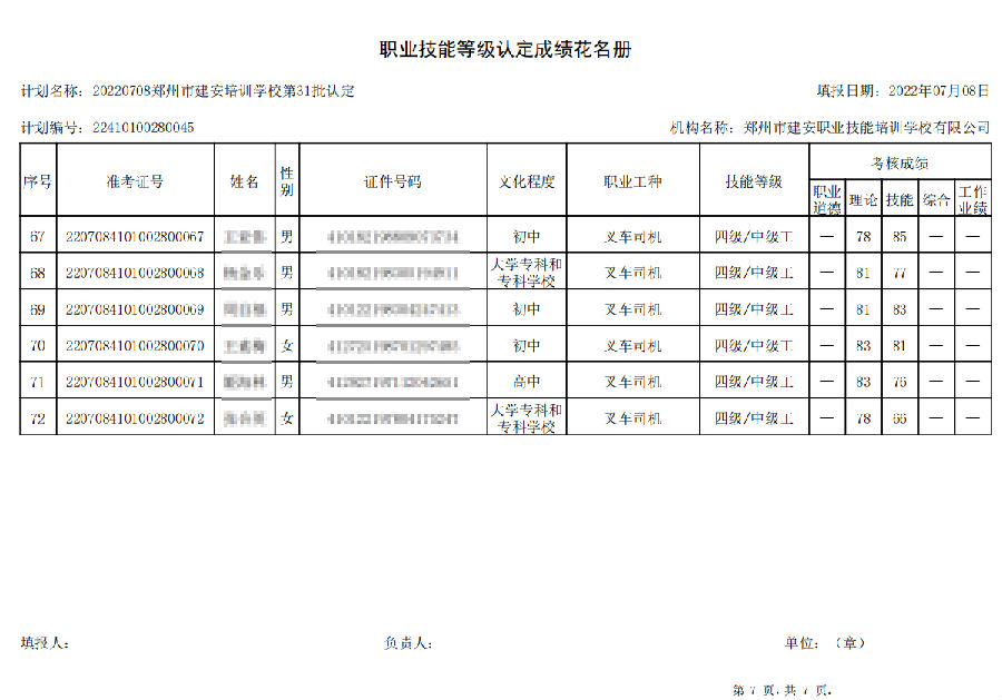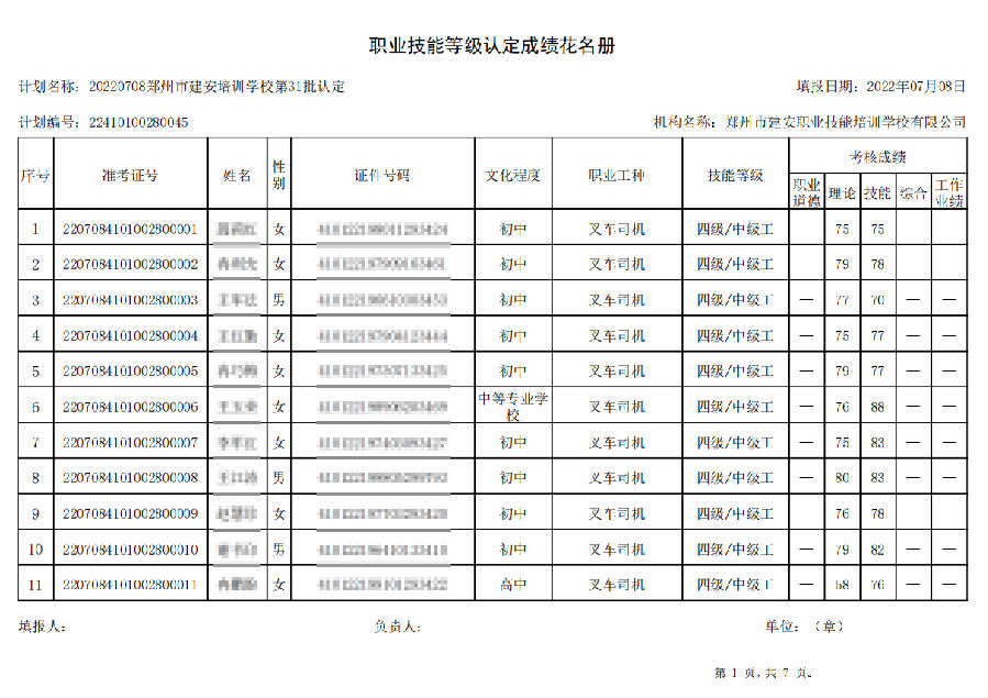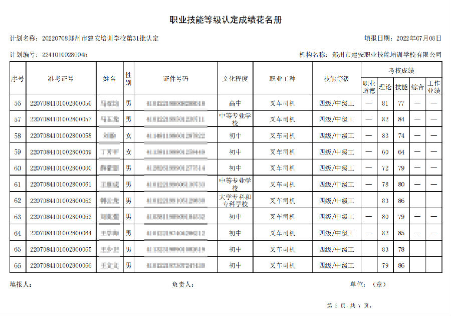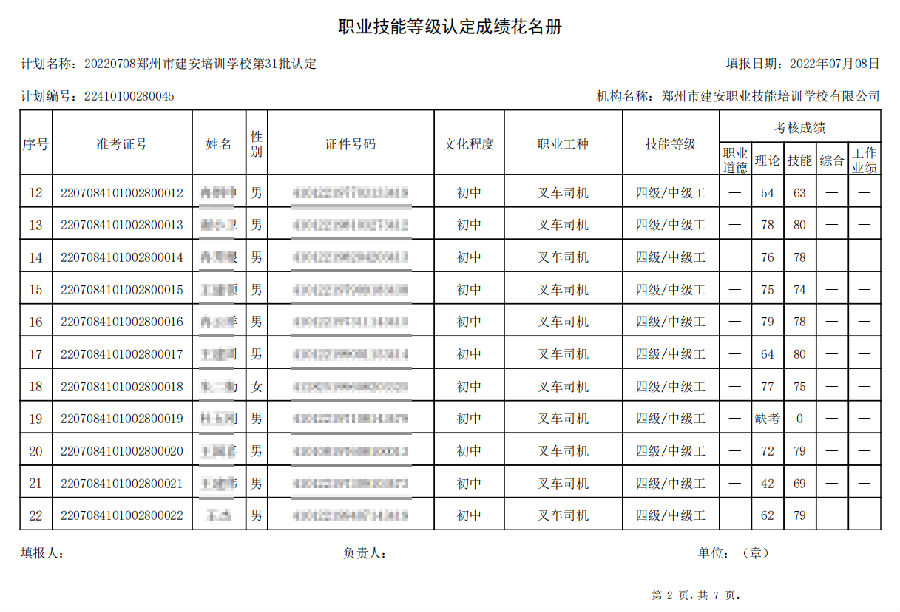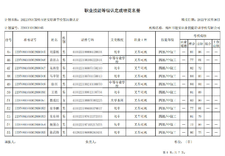 2022年7月8日,在郑州市建安技能培训学校进行的【叉车司机 五级/中级工】职业技能等级认定考试,阅卷工作已结束,现将各位考生成绩予以公示,公示期为7天,公示期限为:2022年7月12日至2022年7月19日。