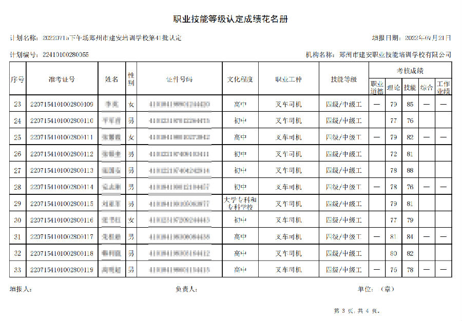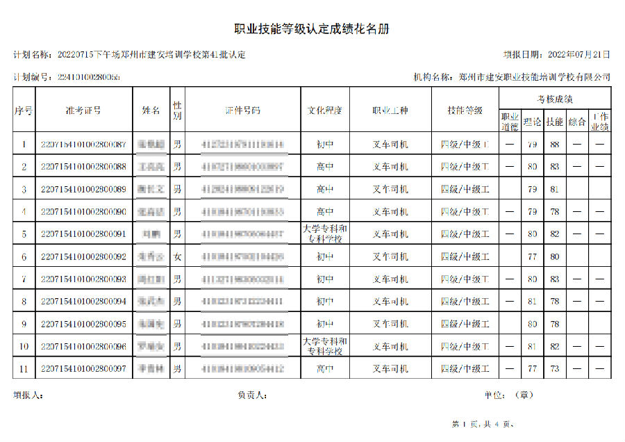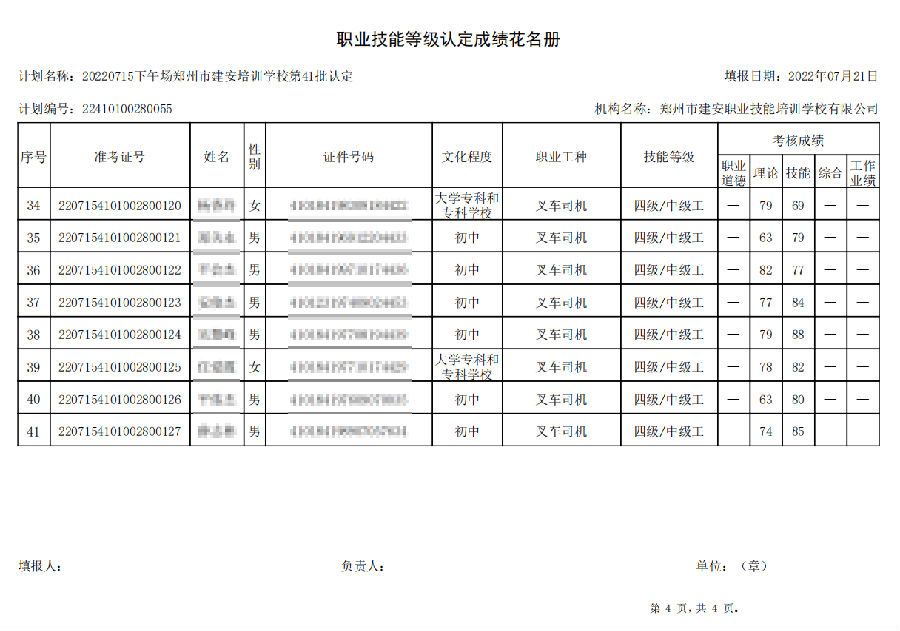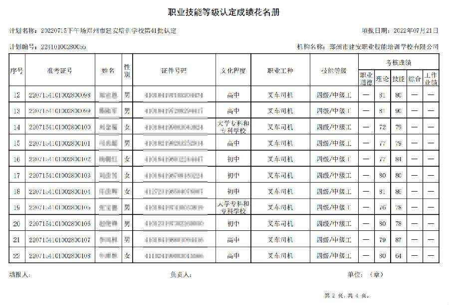 2022年7月15日下午,在郑州市建安技能培训学校进行的【叉车司机 五级/中级工】职业技能等级认定考试,阅卷工作已结束,现将各位考生成绩予以公示,公示期为7天,公示期限为:2022年7月22日至2022年7月29日。