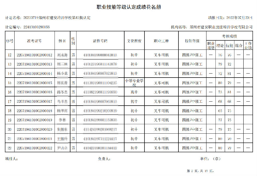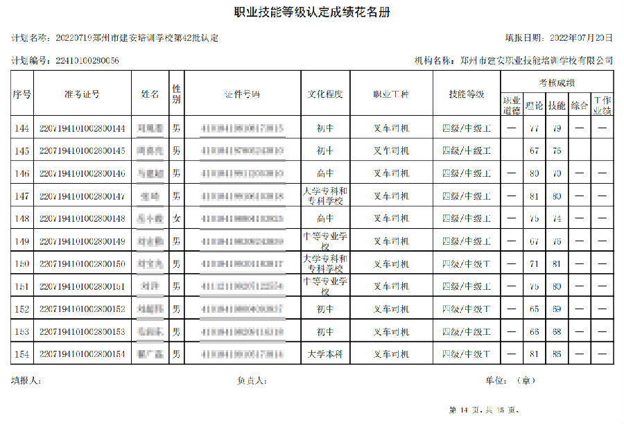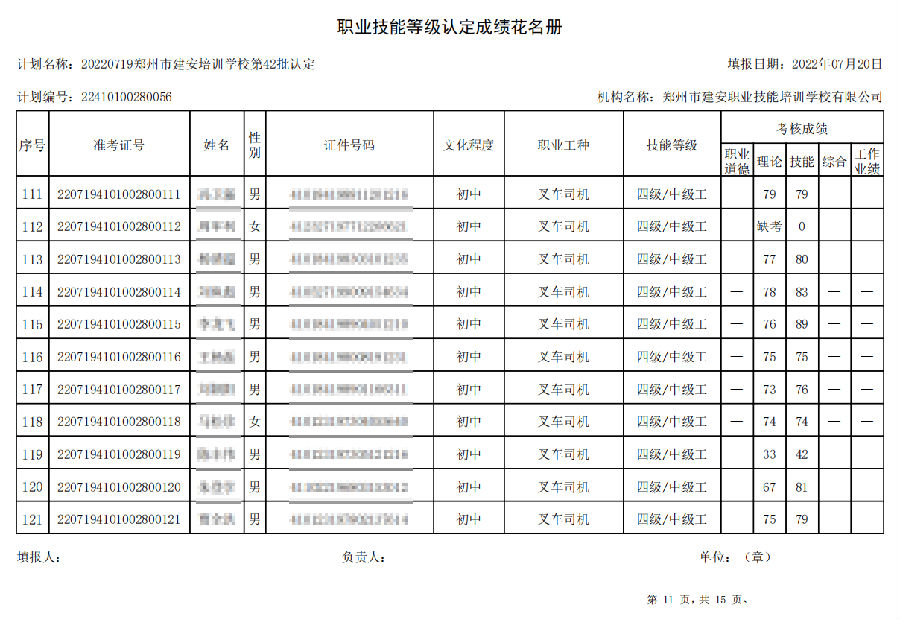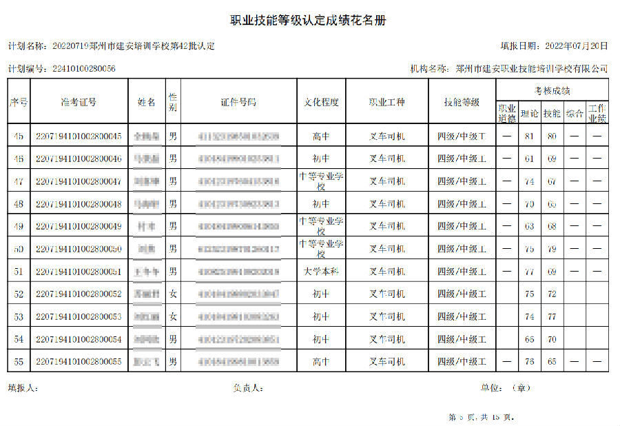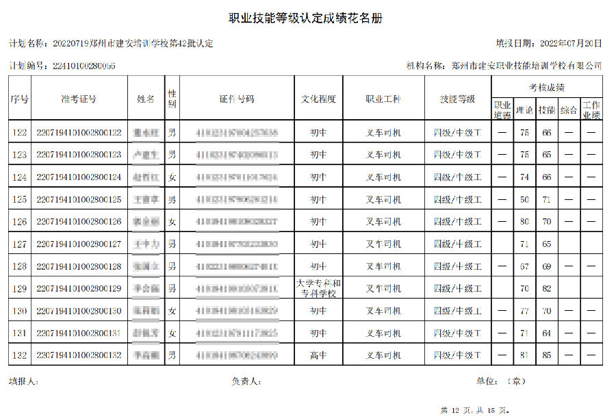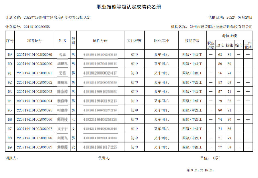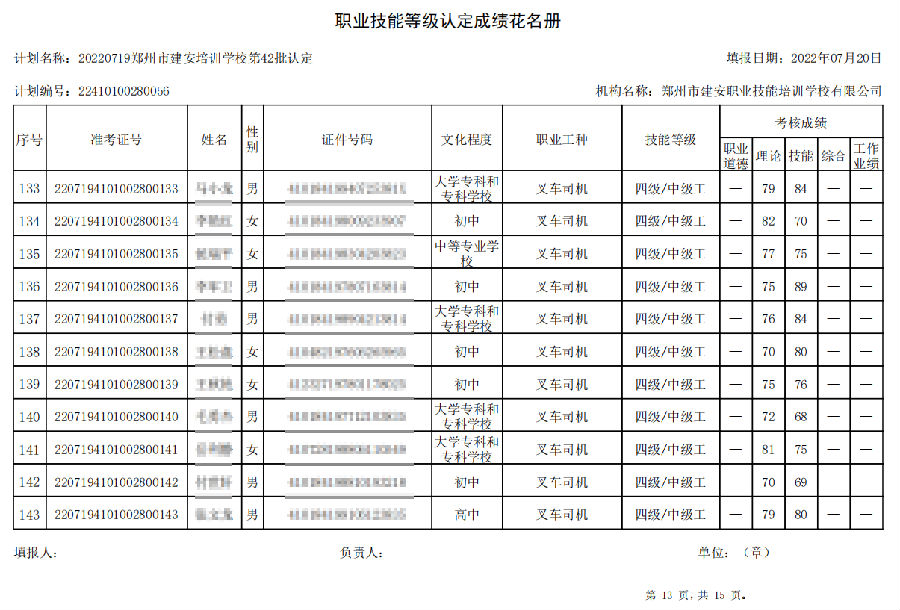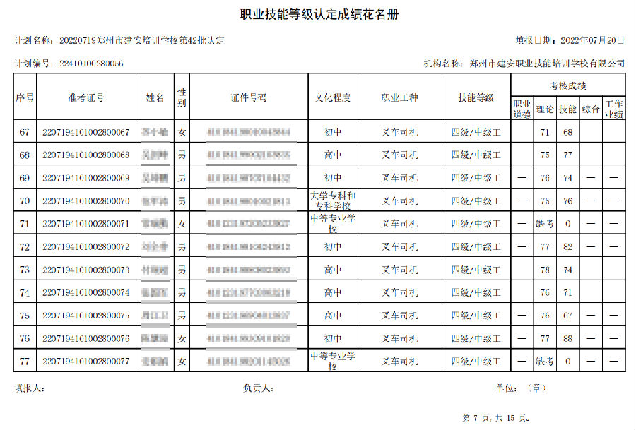 2022年7月19日,在郑州市建安技能培训学校进行的【叉车司机 五级/中级工】职业技能等级认定考试,阅卷工作已结束,现将各位考生成绩予以公示,公示期为7天,公示期限为:2022年7月22日至2022年7月29日。