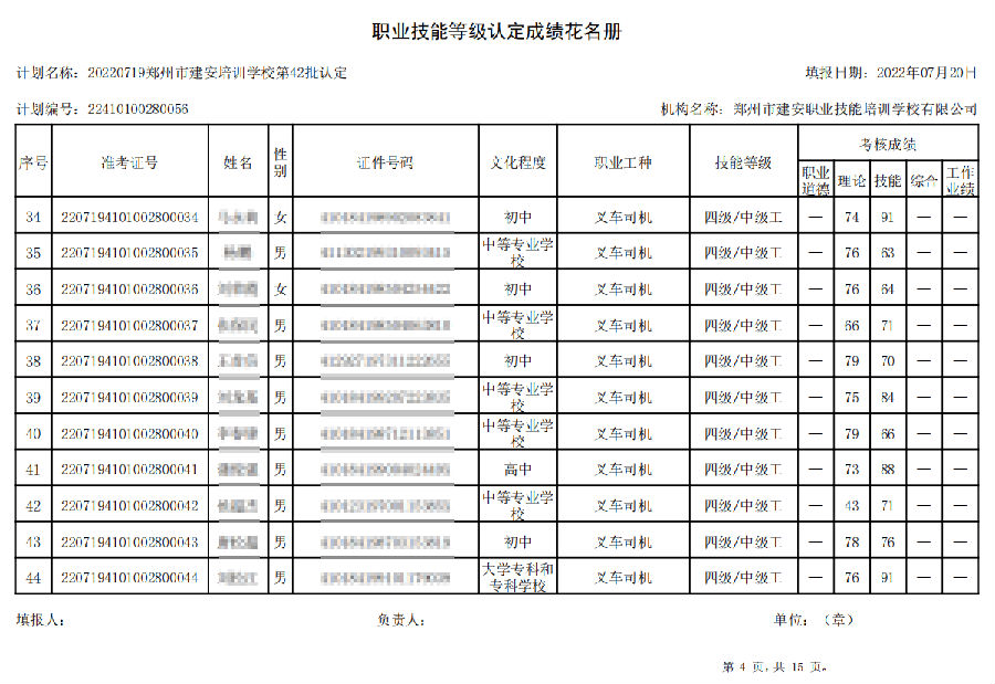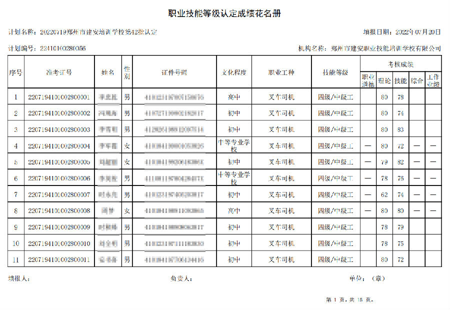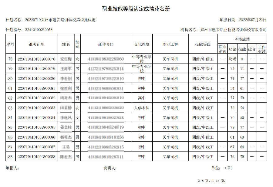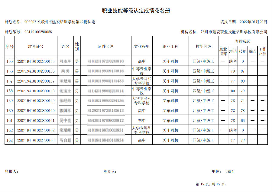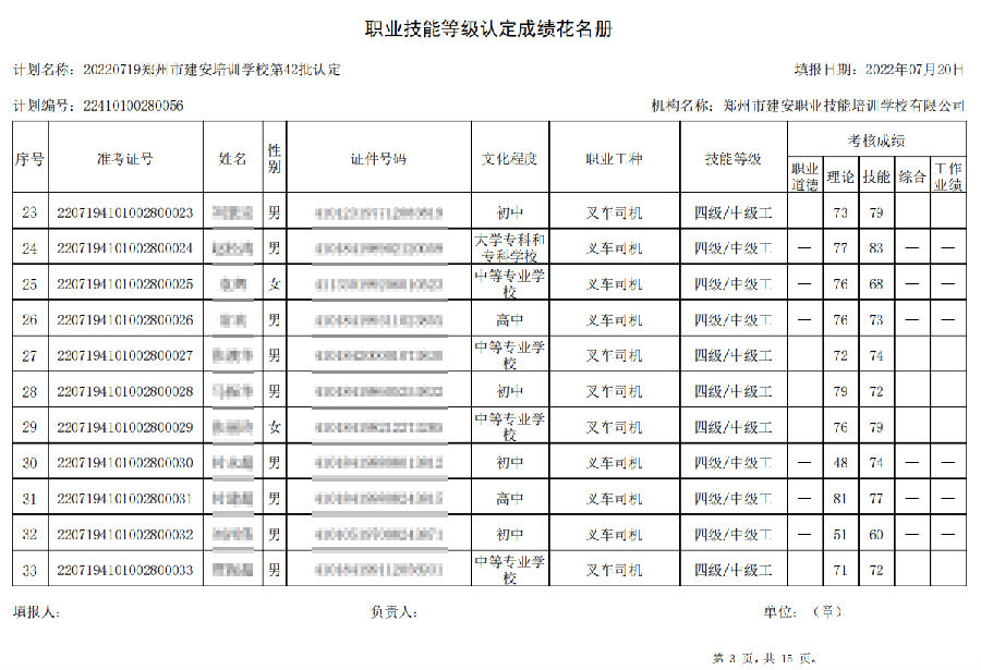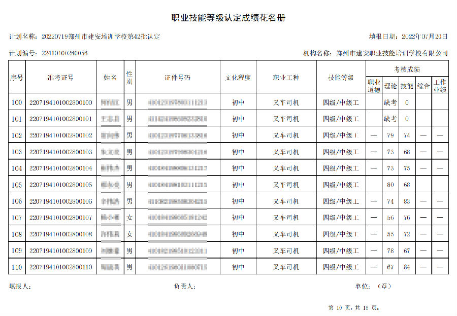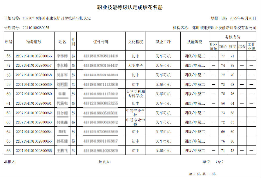 2022年7月19日,在郑州市建安技能培训学校进行的【叉车司机 五级/中级工】职业技能等级认定考试,阅卷工作已结束,现将各位考生成绩予以公示,公示期为7天,公示期限为:2022年7月22日至2022年7月29日。