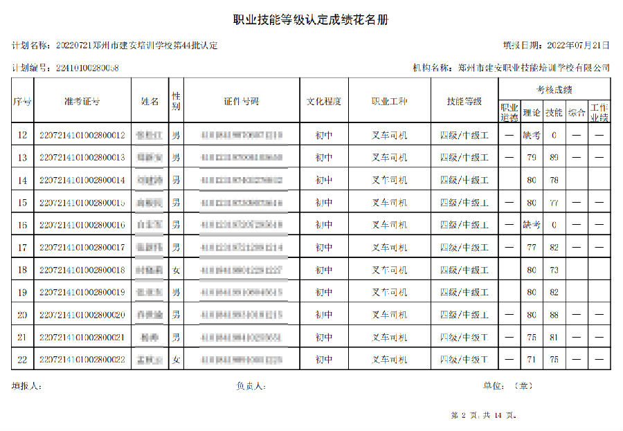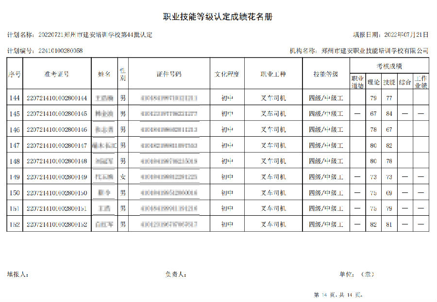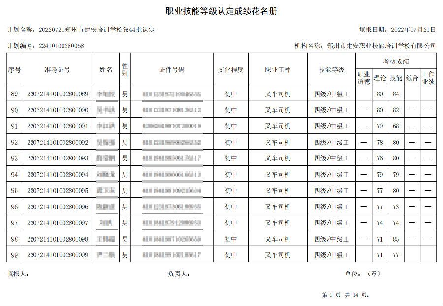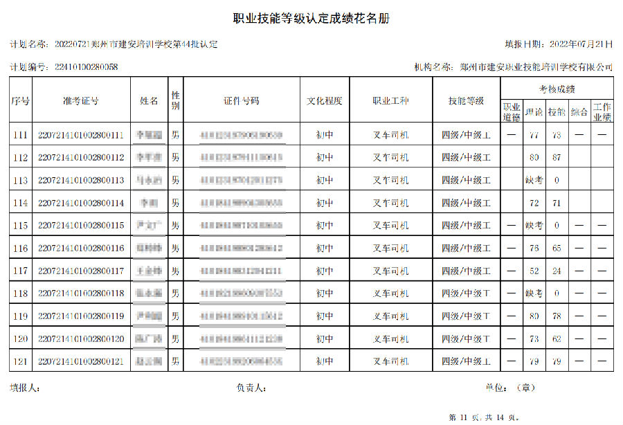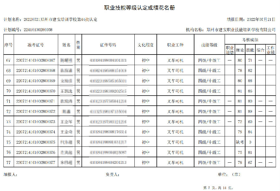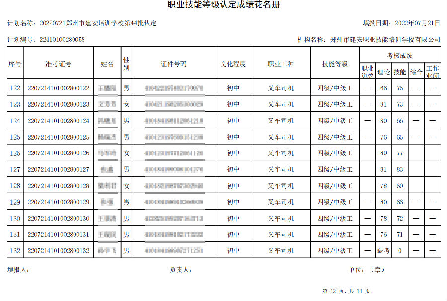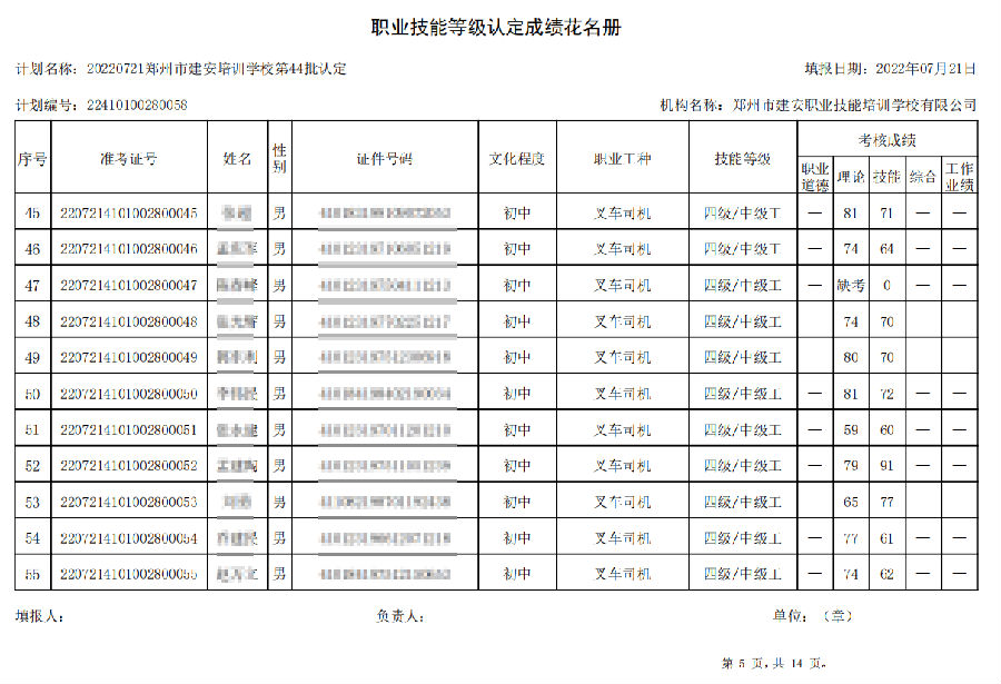 2022年7月21日,在郑州市建安技能培训学校进行的【叉车司机 五级/中级工】职业技能等级认定考试,阅卷工作已结束,现将各位考生成绩予以公示,公示期为7天,公示期限为:2022年7月22日至2022年7月29日。