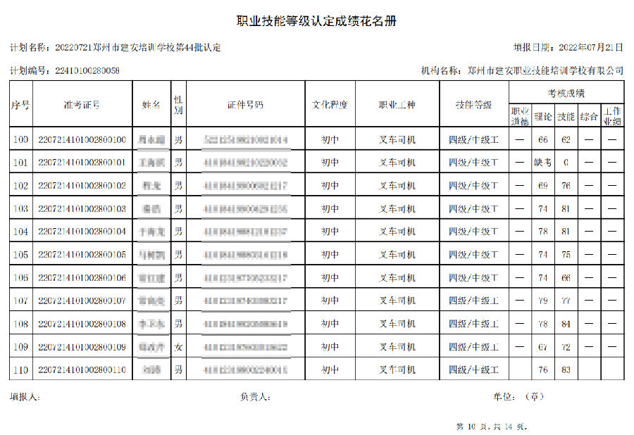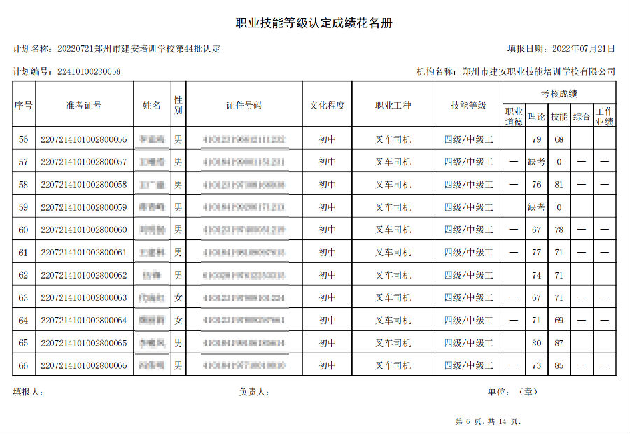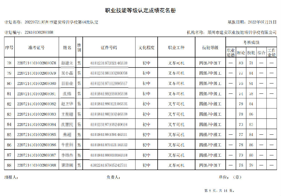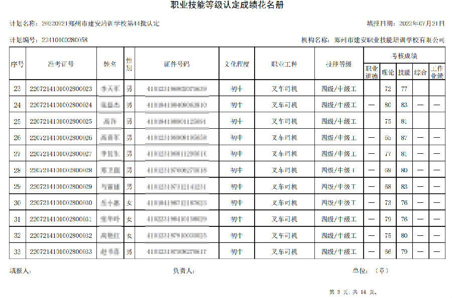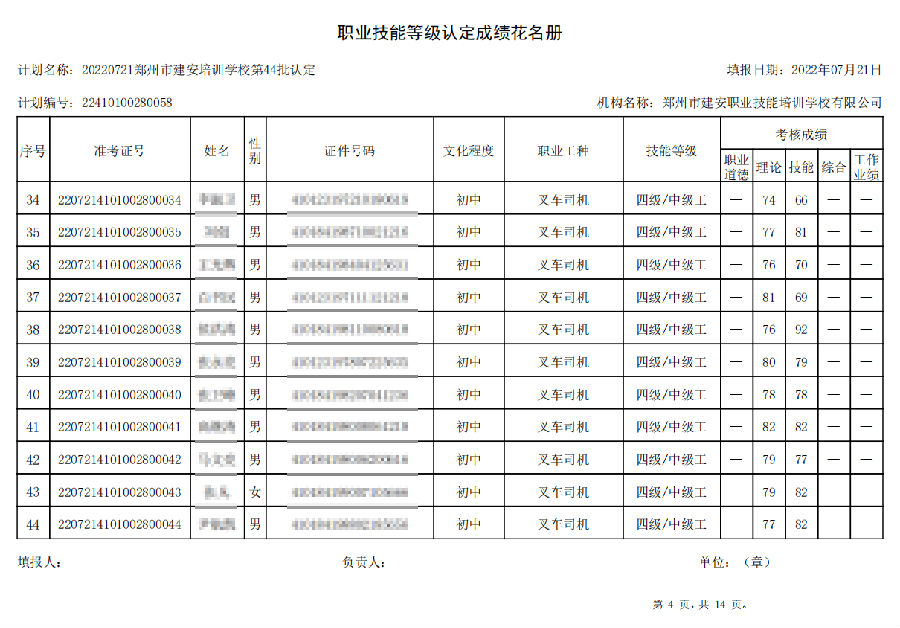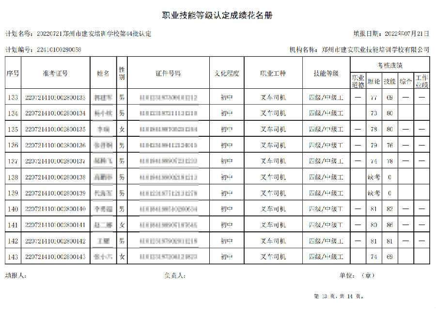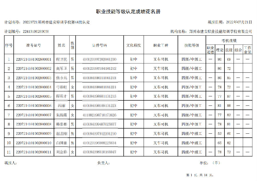 2022年7月21日,在郑州市建安技能培训学校进行的【叉车司机 五级/中级工】职业技能等级认定考试,阅卷工作已结束,现将各位考生成绩予以公示,公示期为7天,公示期限为:2022年7月22日至2022年7月29日。