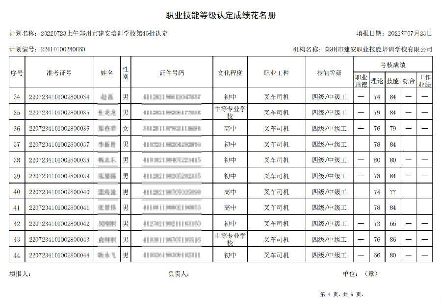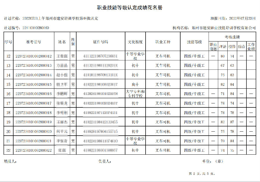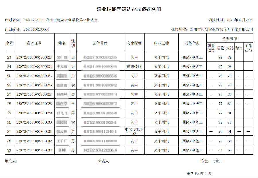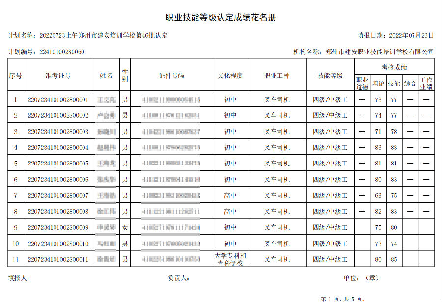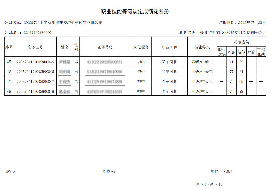 2022年7月23日上午,在郑州市建安技能培训学校进行的【叉车司机 四级/中级工】职业技能等级认定考试,阅卷工作已结束,现将各位考生成绩予以公示,公示期为7天,公示期限为:2022年7月28日至2022年8月4日。
