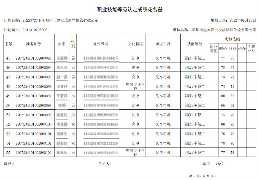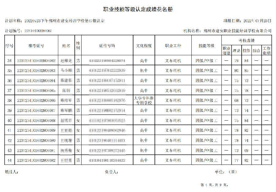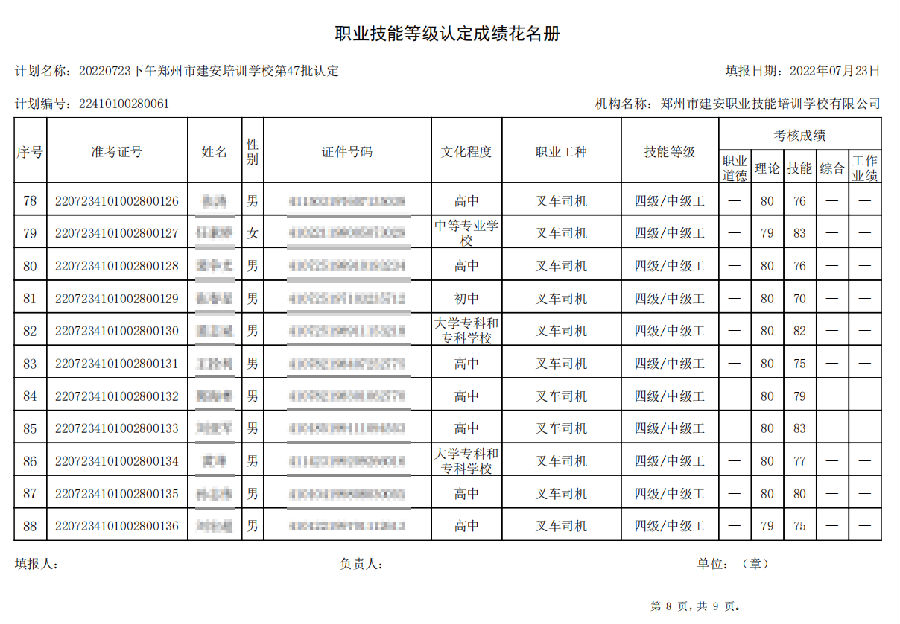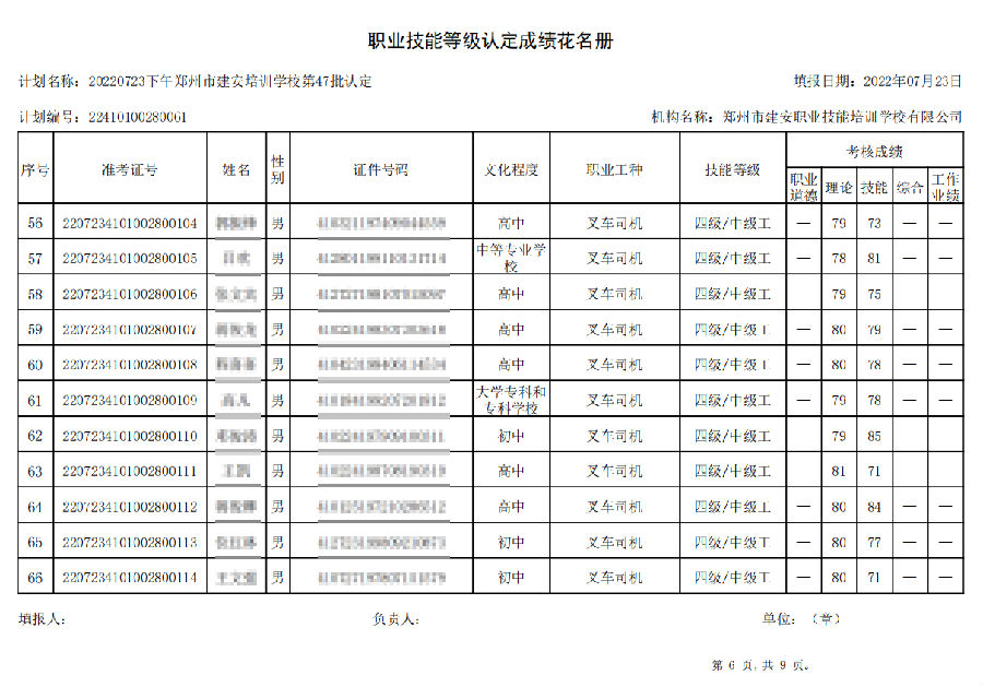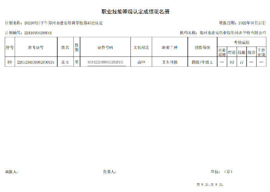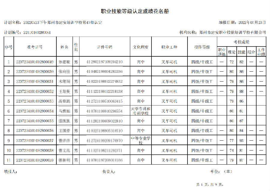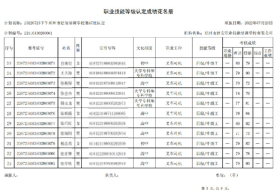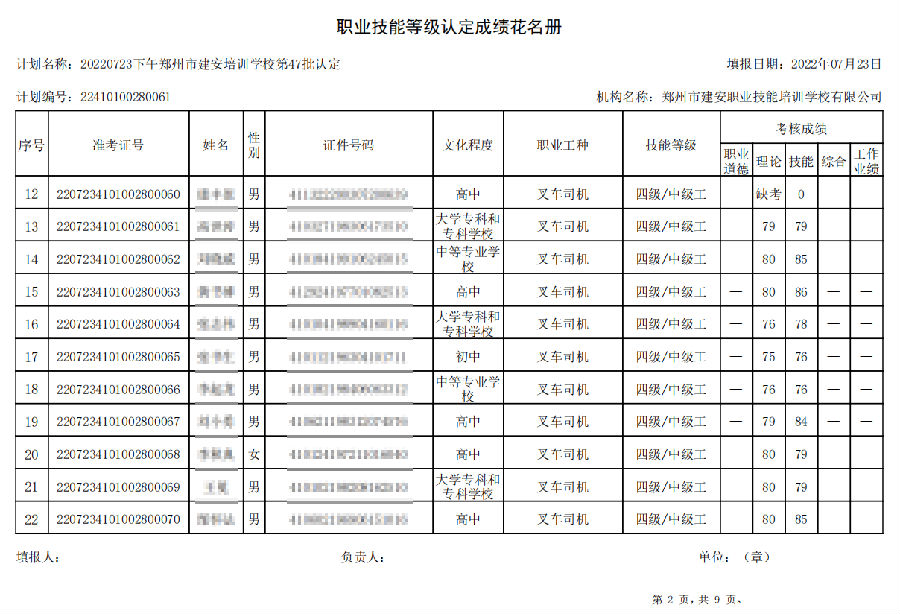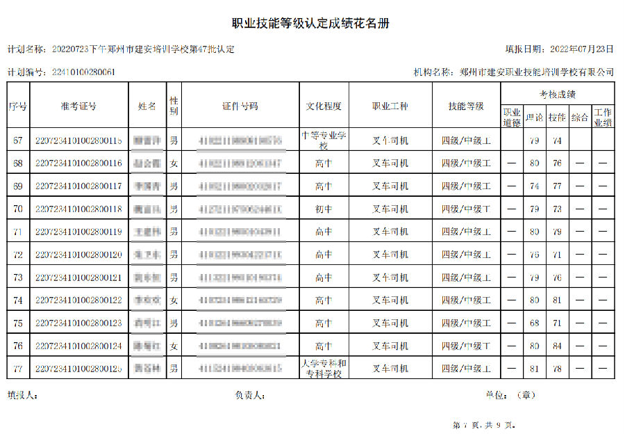 2022年7月23日下午,在郑州市建安技能培训学校进行的【叉车司机 四级/中级工】职业技能等级认定考试,阅卷工作已结束,现将各位考生成绩予以公示,公示期为7天,公示期限为:2022年7月28日至2022年8月4日。