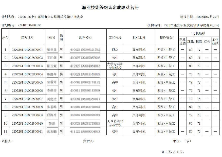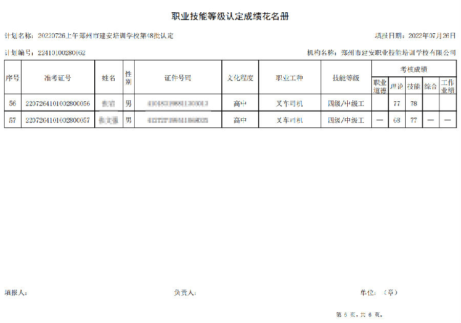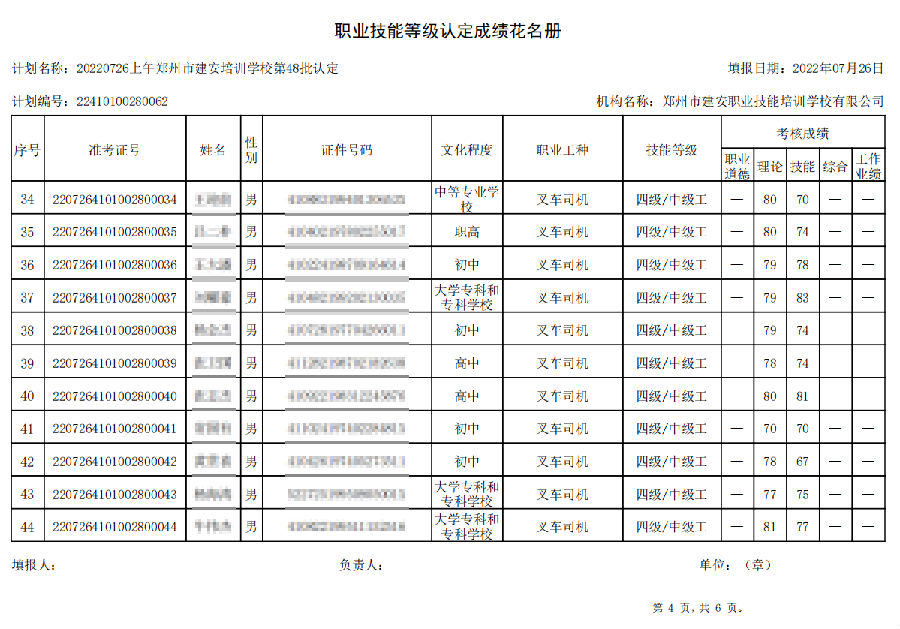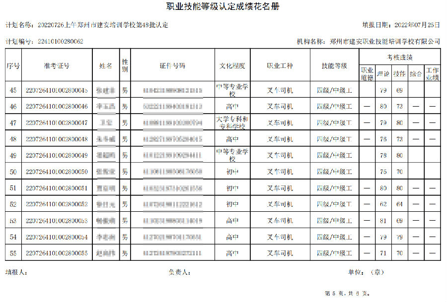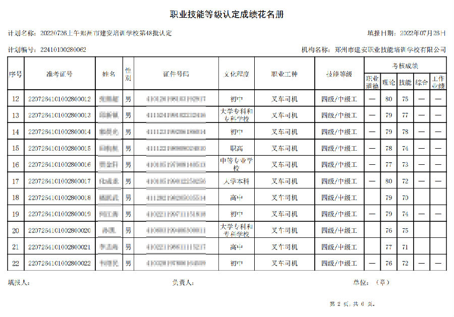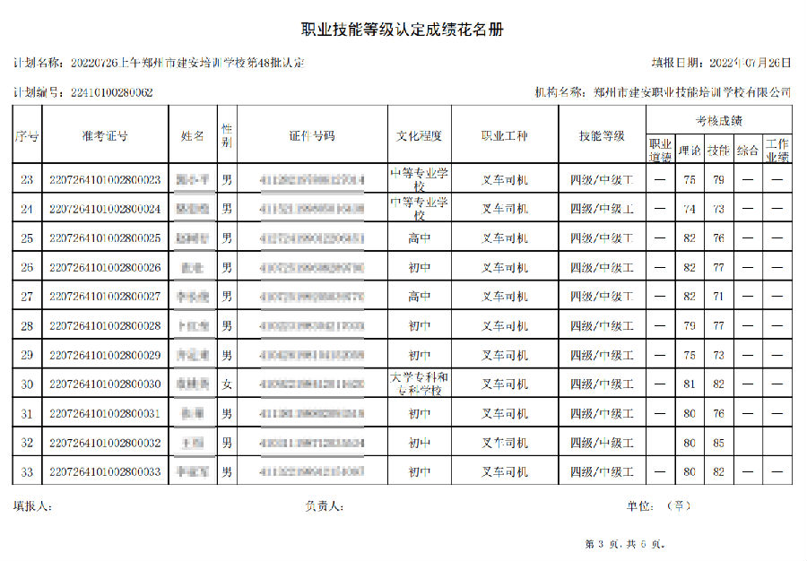2022年7月26日上午,在郑州市建安技能培训学校进行的【叉车司机 四级/中级工】职业技能等级认定考试,阅卷工作已结束,现将各位考生成绩予以公示,公示期为7天,公示期限为:2022年7月28日至2022年8月4日。