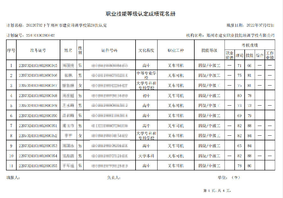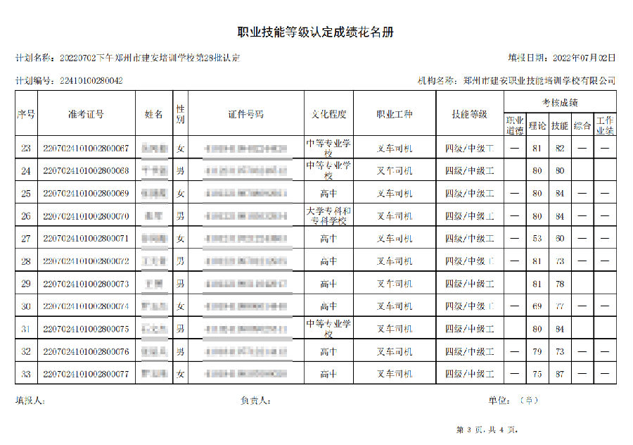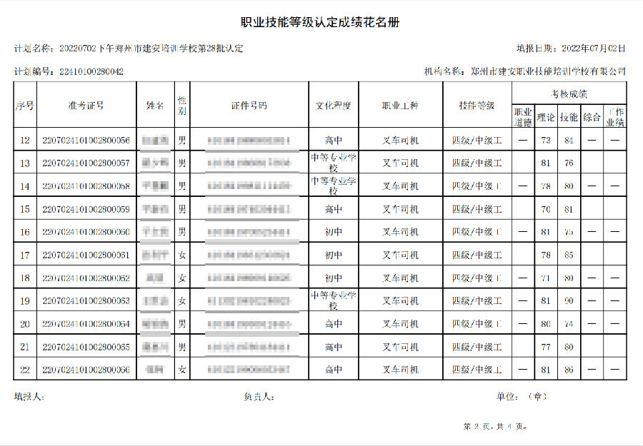 2022年7月2日下午,在郑州市建安技能培训学校进行的【叉车司机 五级/中级工】职业技能等级认定考试,阅卷工作已结束,现将各位考生成绩予以公示,公示期为7天,公示期限为:2022年7月5日至2022年7月12日。