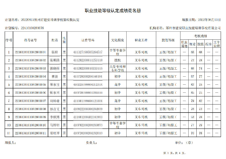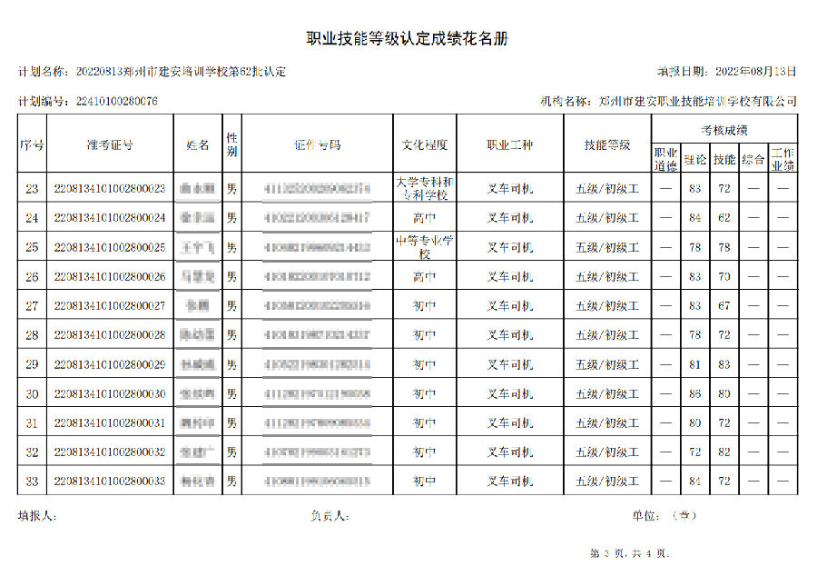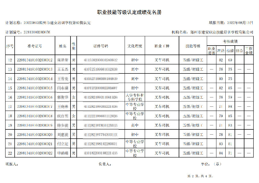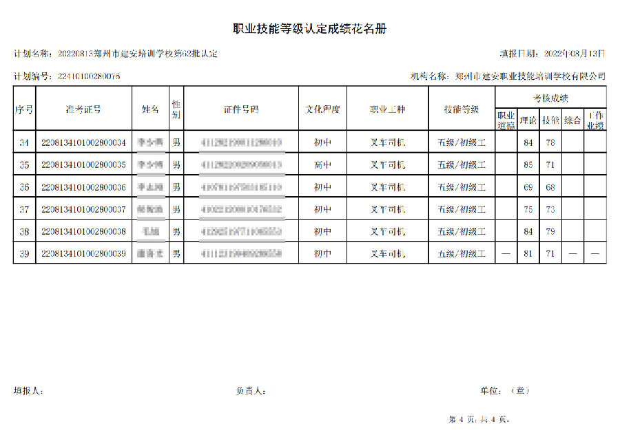2022年8月13日,在郑州市建安技能培训学校进行的【叉车司机 五级/初级工】职业技能等级认定考试,阅卷工作已结束,现将各位考生成绩予以公示,公示期为7天,公示期限为:2022年8月15日至2022年8月22日。