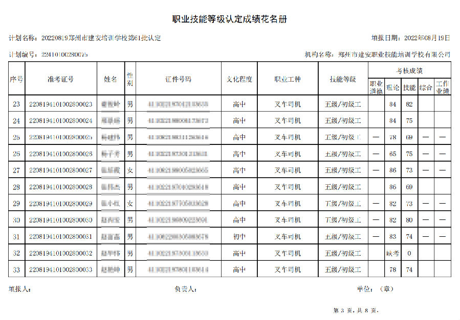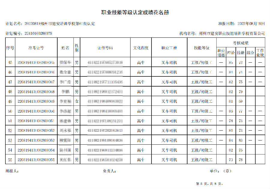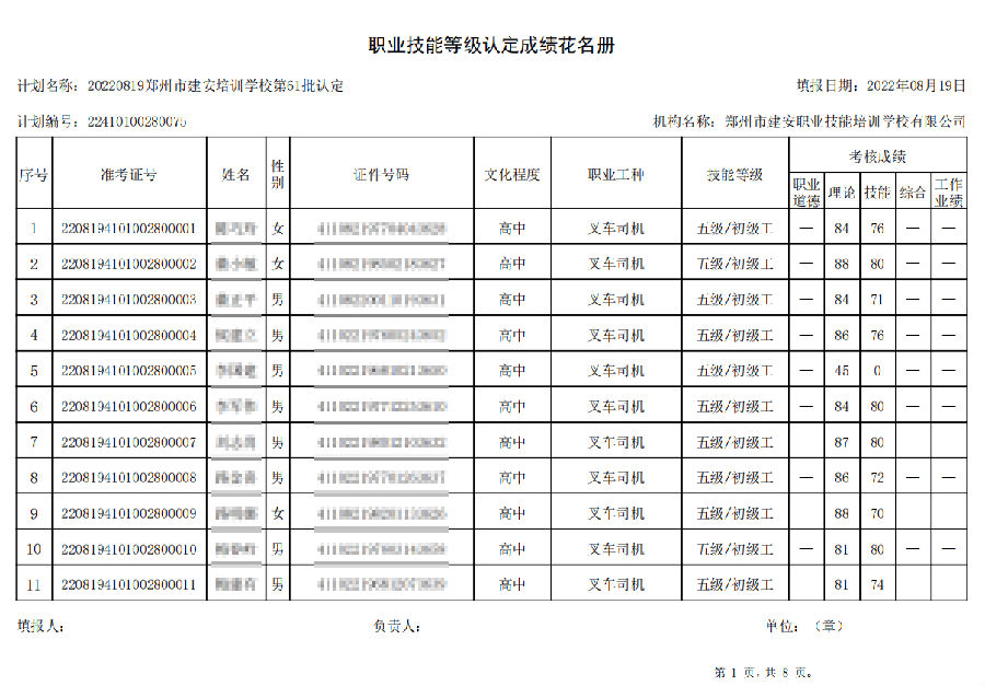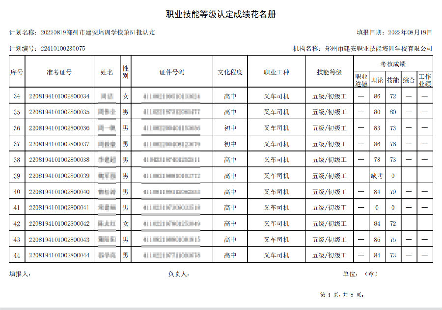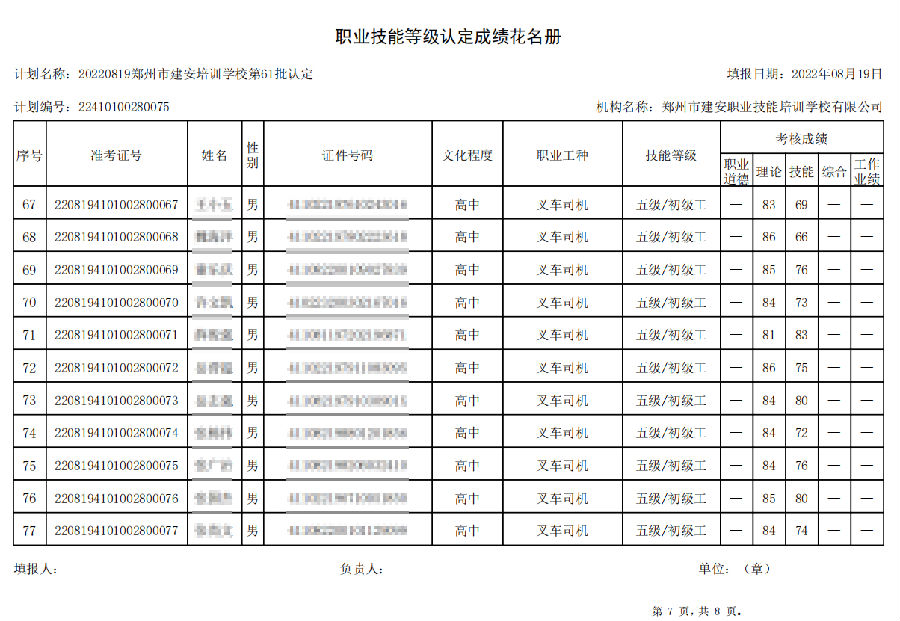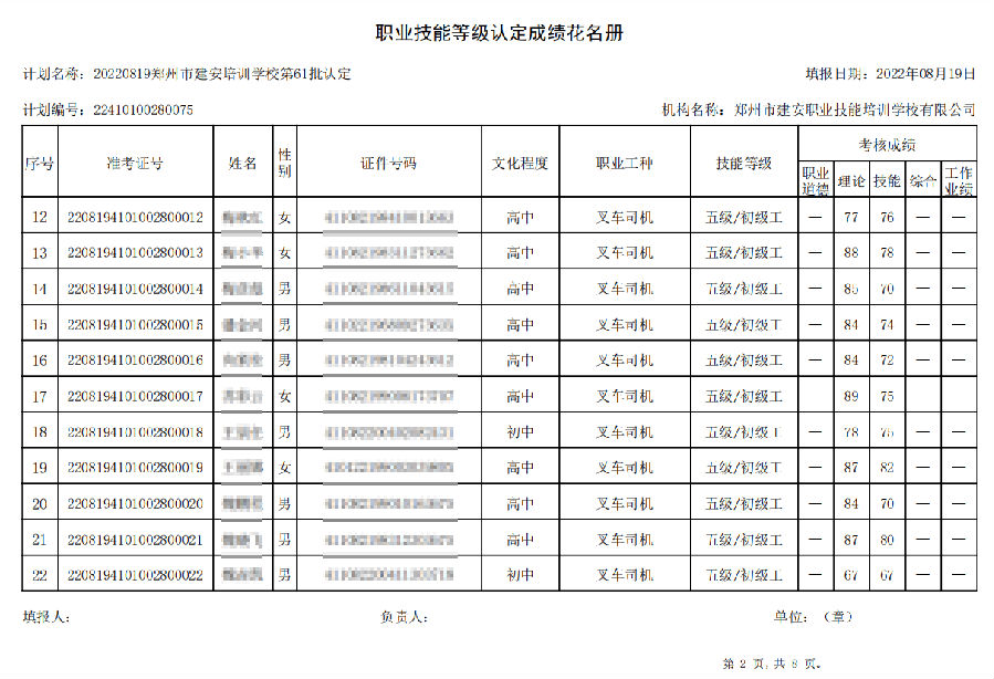 2022年8月19日,在郑州市建安技能培训学校进行的【叉车司机 五级/初级工】职业技能等级认定考试,阅卷工作已结束,现将各位考生成绩予以公示,公示期为7天,公示期限为:2022年8月24日至2022年8月31日。