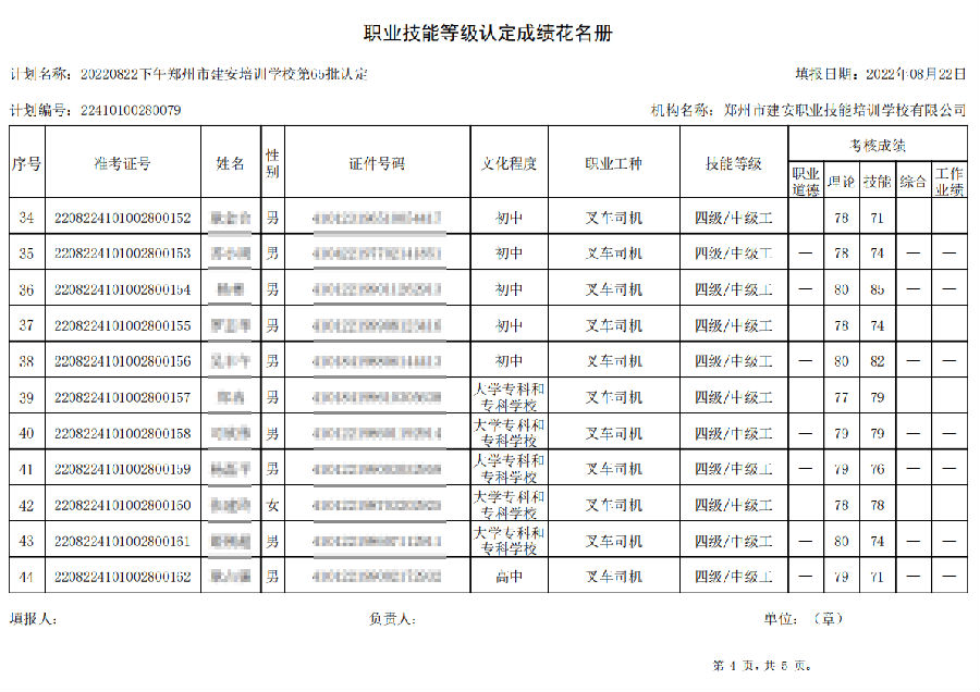 2022年8月22日下午,在郑州市建安技能培训学校进行的【叉车司机 四级/中级工】职业技能等级认定考试,阅卷工作已结束,现将各位考生成绩予以公示,公示期为7天,公示期限为:2022年8月24日至2022年8月31日。