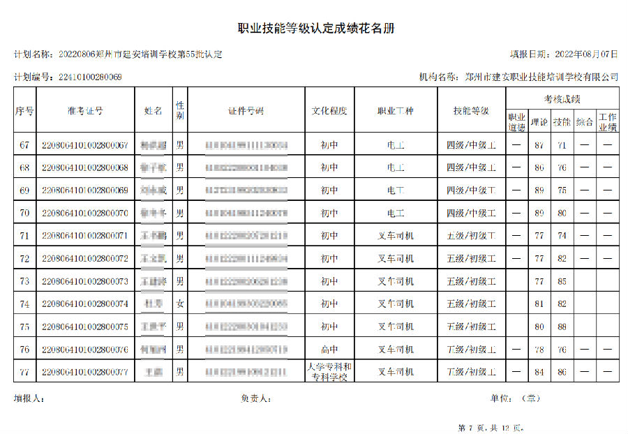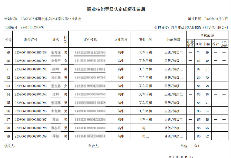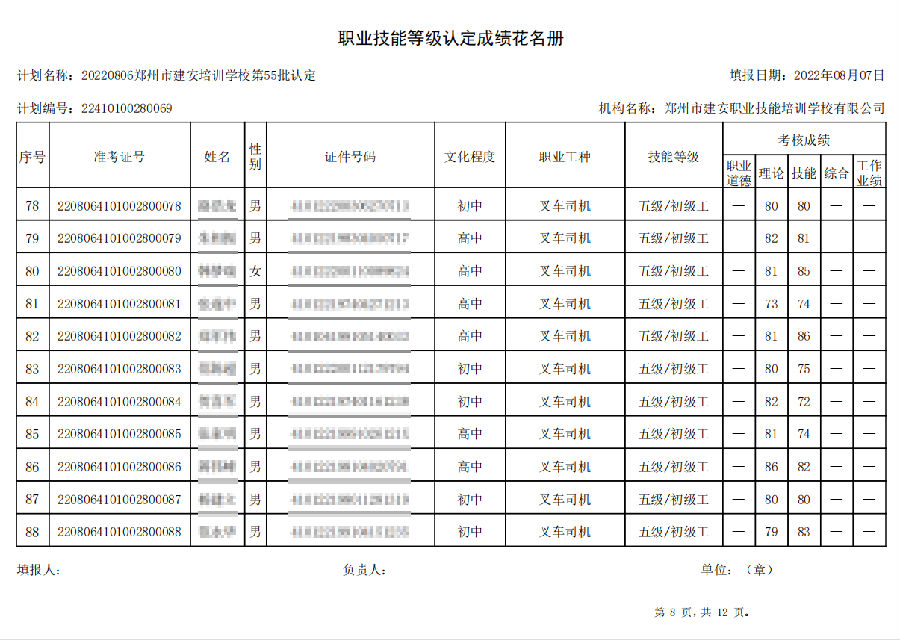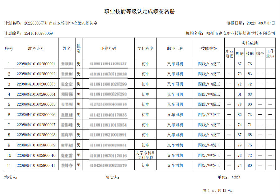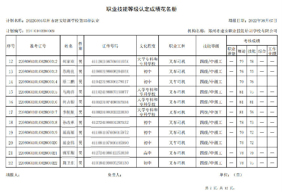 2022年8月6日,在郑州市建安技能培训学校进行的【叉车司机 四级/中级工】【电工 四级/中级工】职业技能等级认定考试,阅卷工作已结束,现将各位考生成绩予以公示,公示期为7天,公示期限为:2022年8月9日至2022年8月16日。
