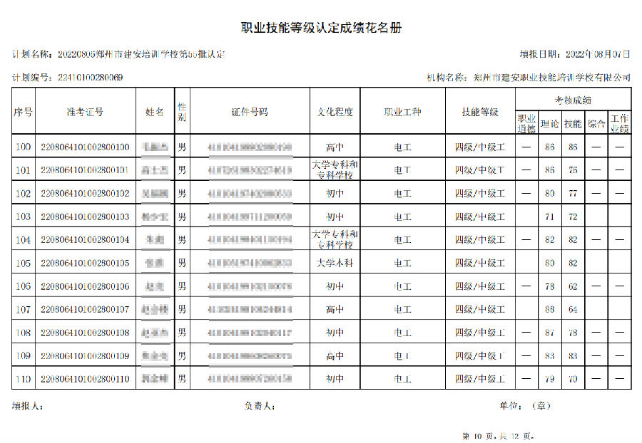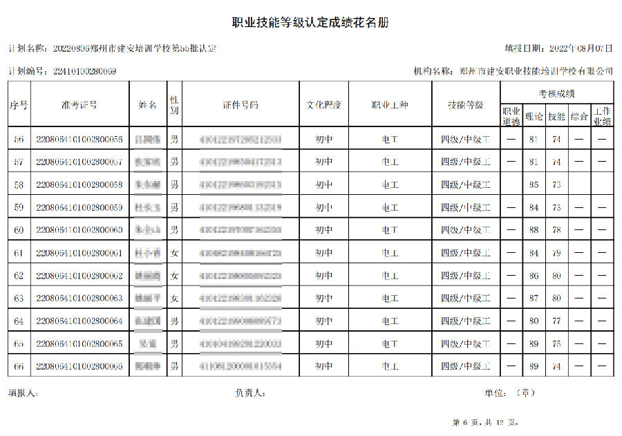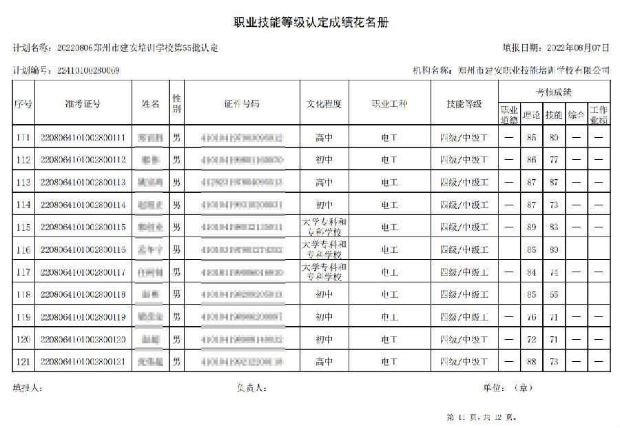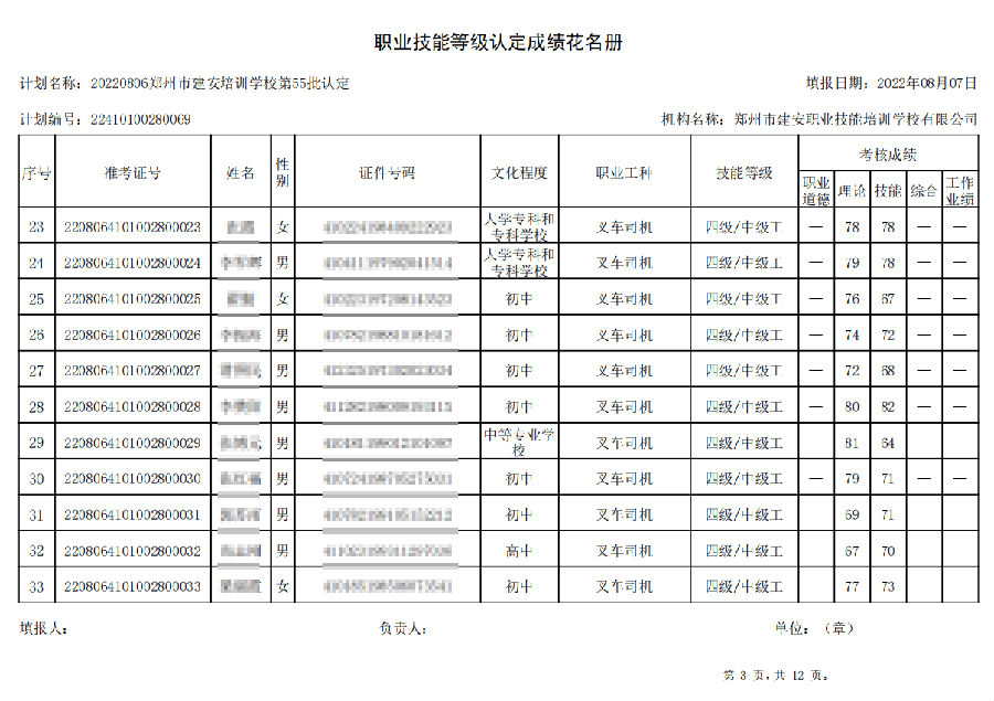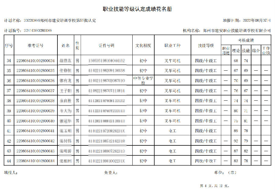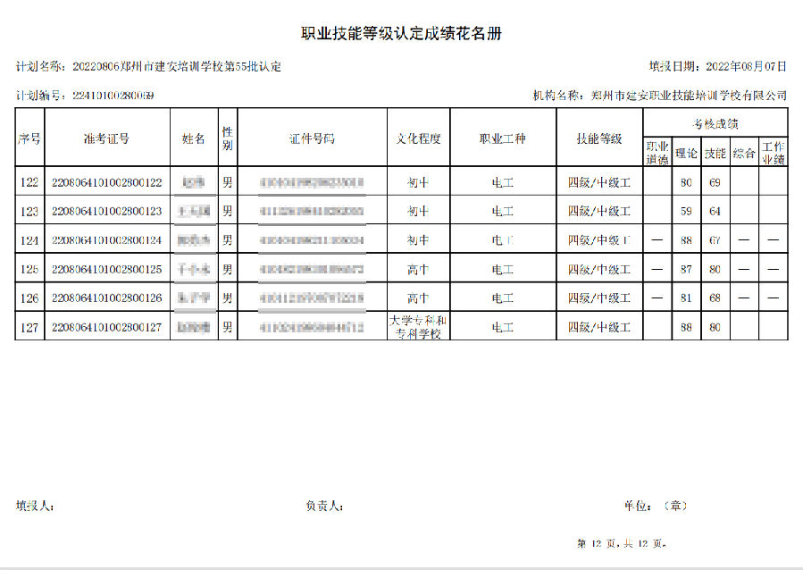 2022年8月6日,在郑州市建安技能培训学校进行的【叉车司机 四级/中级工】【电工 四级/中级工】职业技能等级认定考试,阅卷工作已结束,现将各位考生成绩予以公示,公示期为7天,公示期限为:2022年8月9日至2022年8月16日。
