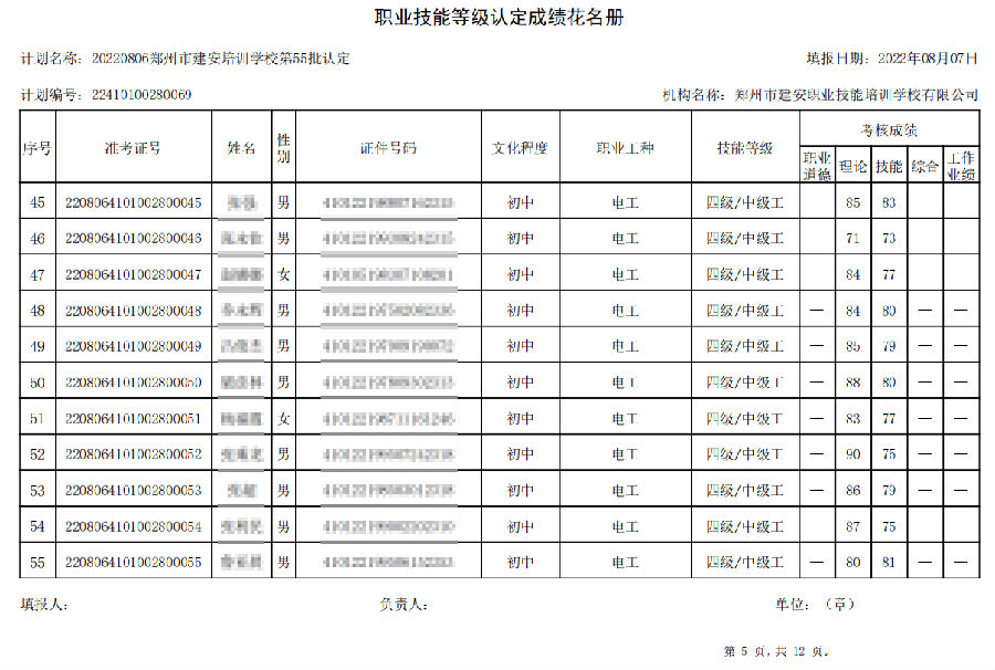 建安职业技能培训学校-第55批职业技能等级认定考试成绩公示