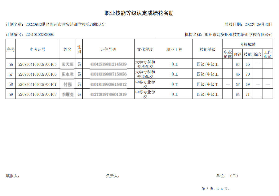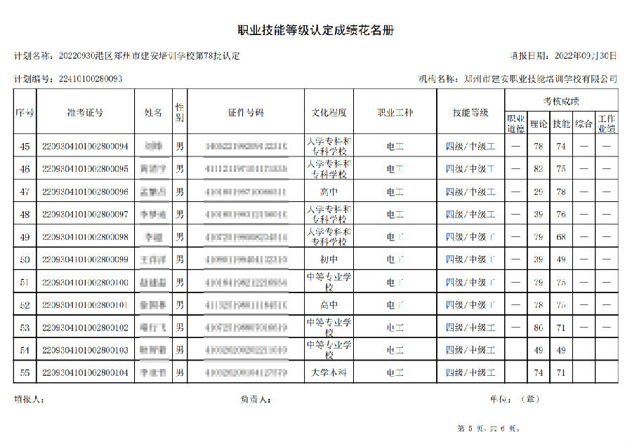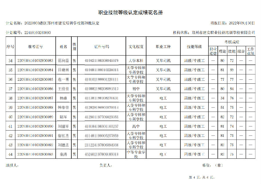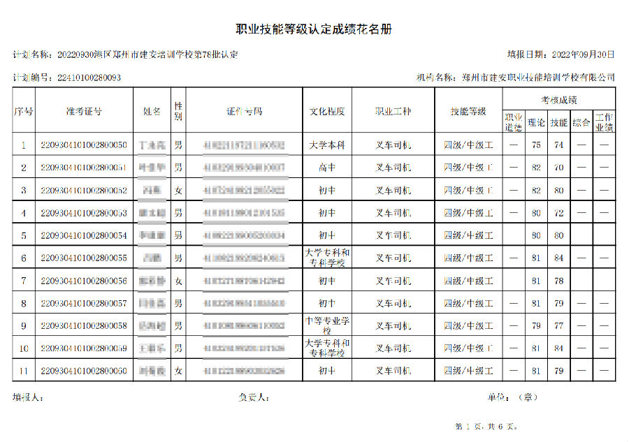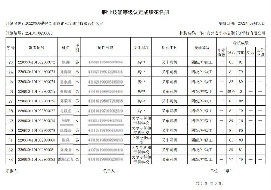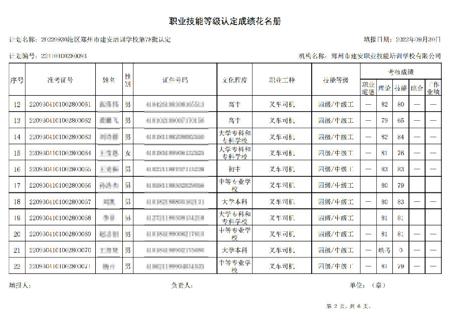 2022年9月30日,在港区郑州市建安技能培训学校进行的【叉车司机 四级/中级工】职业技能等级认定考试,阅卷工作已结束,现将各位考生成绩予以公示,公示期为7天,公示期限为:2022年9月30日至2022年10月7日。