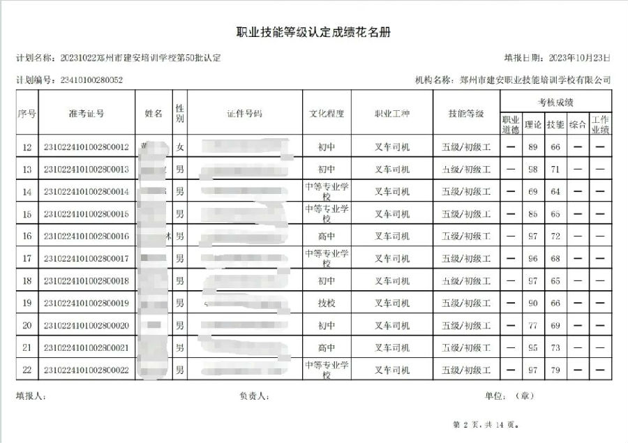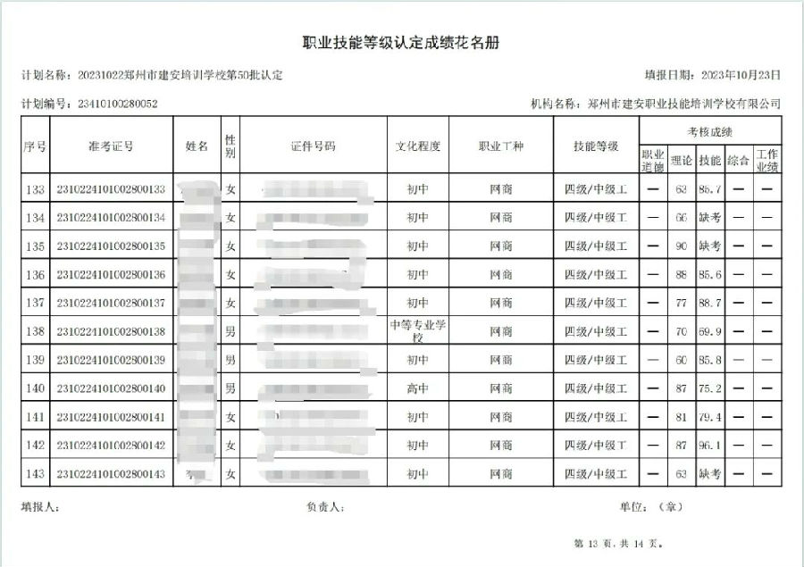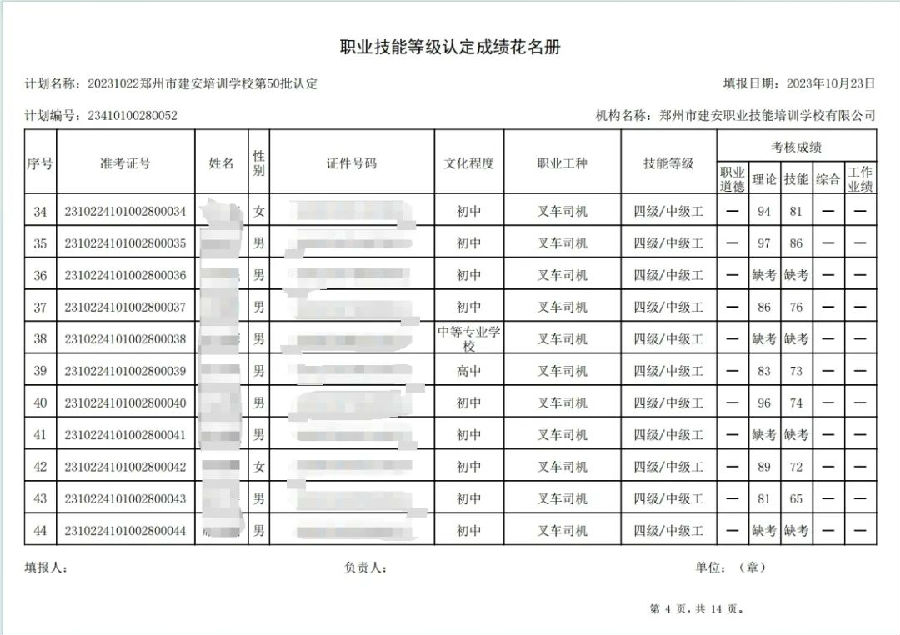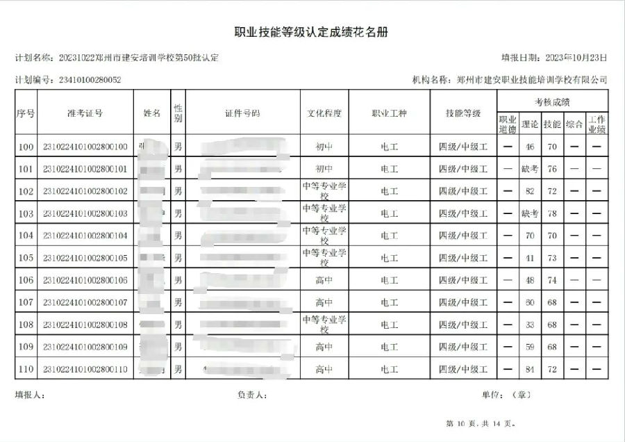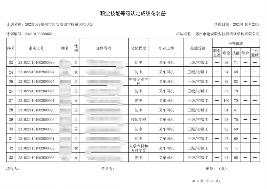 2023年10月22日,在郑州市建安职业技能培训学校进行的第50批次【电工】【网商】【叉车司机】职业技能等级认定考试,阅卷工作已结束,现将各位考生成绩予以公示,公示期为3天,公示期限为:2023年10月24日至2023年10月26日。