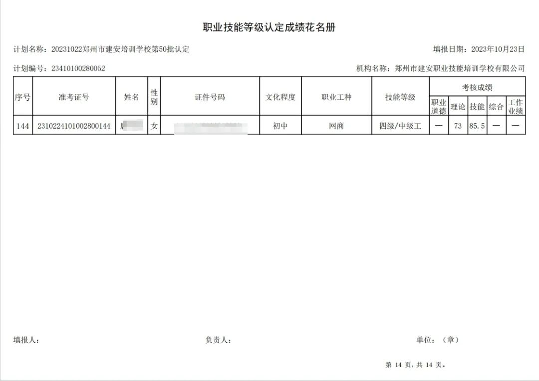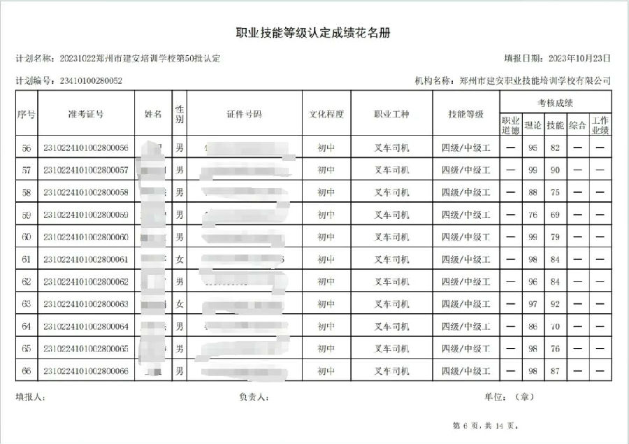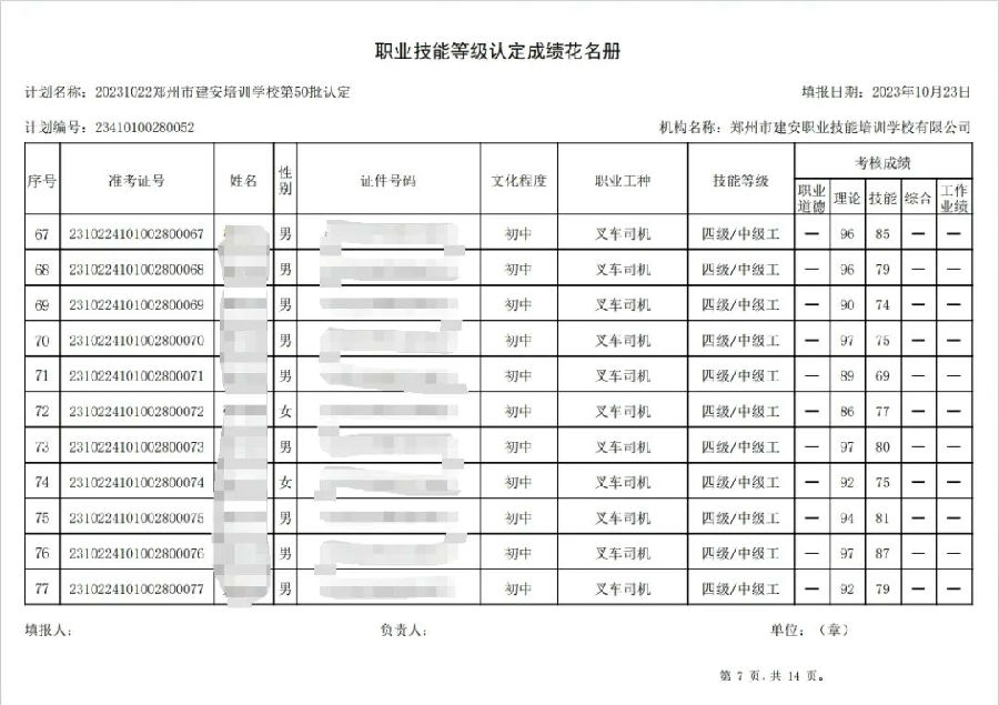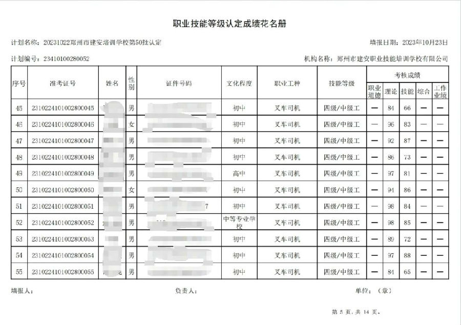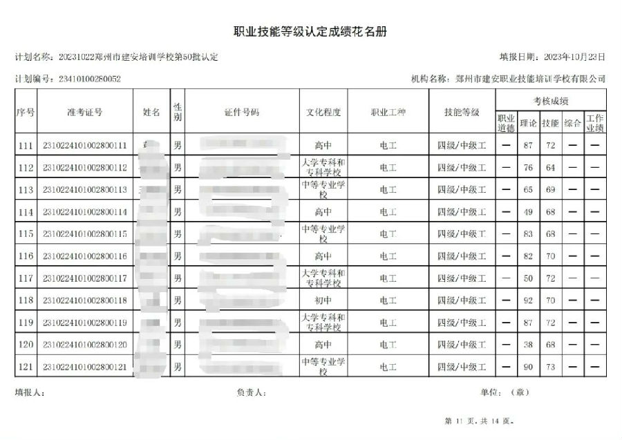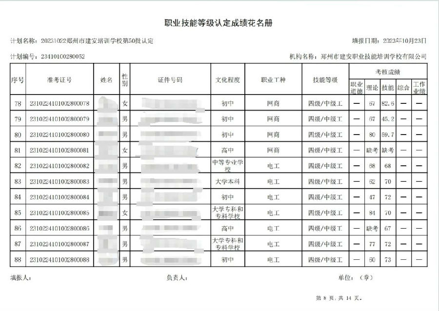 2023年10月22日,在郑州市建安职业技能培训学校进行的第50批次【电工】【网商】【叉车司机】职业技能等级认定考试,阅卷工作已结束,现将各位考生成绩予以公示,公示期为3天,公示期限为:2023年10月24日至2023年10月26日。