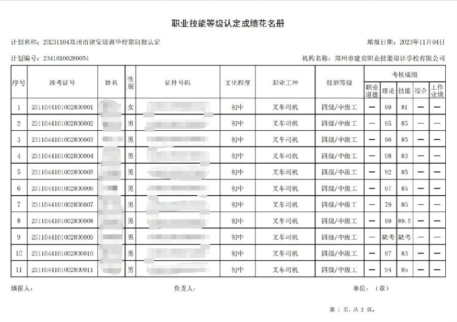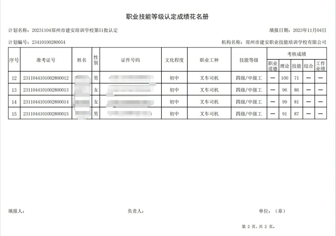 2023年11月4日,在郑州市建安职业技能培训学校进行的第51批次【叉车司机】职业技能等级认定考试,阅卷工作已结束,现将各位考生成绩予以公示,公示期为3天,公示期限为:2023年11月7日至2023年11月9日。
