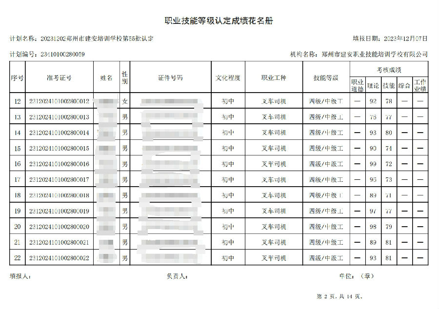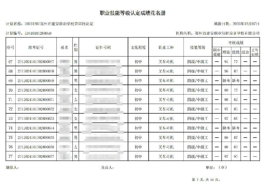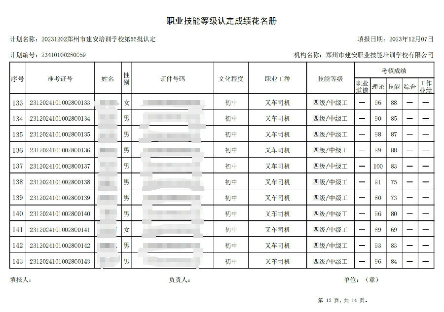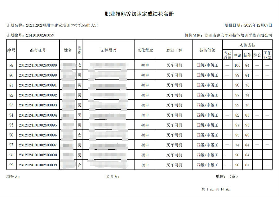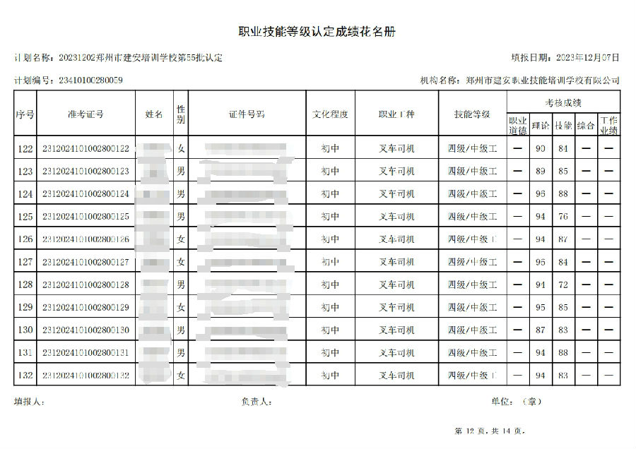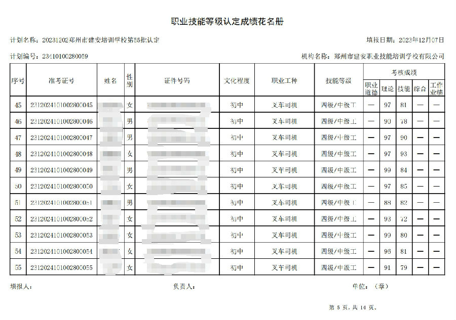 2023年12月2日,在郑州市建安职业技能培训学校进行的第55批次【叉车司机】职业技能等级认定考试,阅卷工作已结束,现将各位考生成绩予以公示,公示期为3天,公示期限为:2023年12月8日至2023年12月10日。