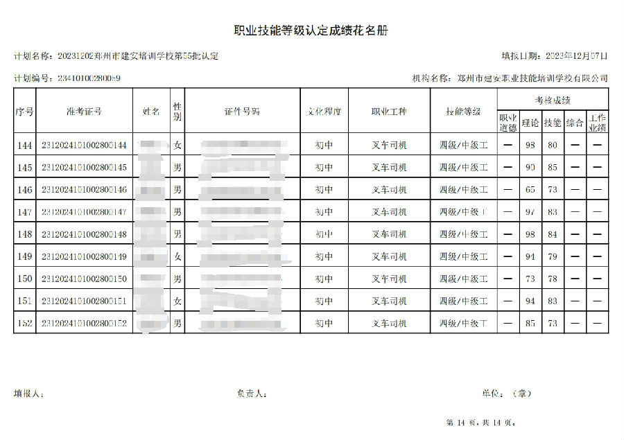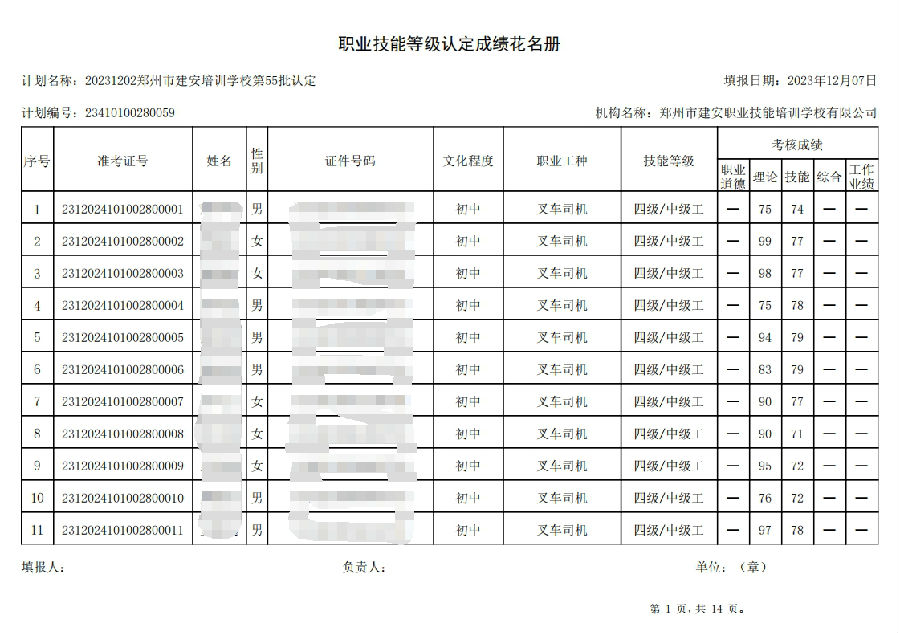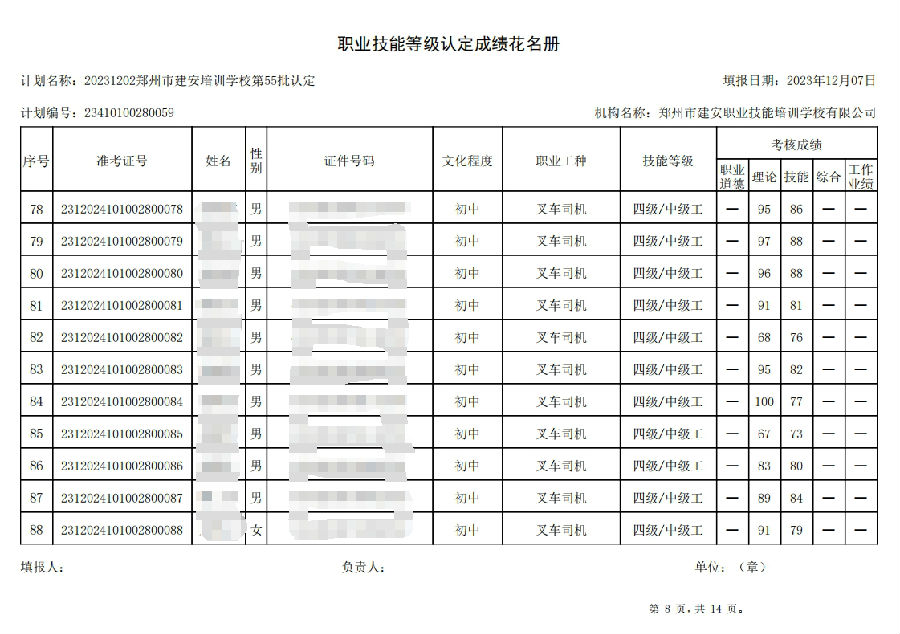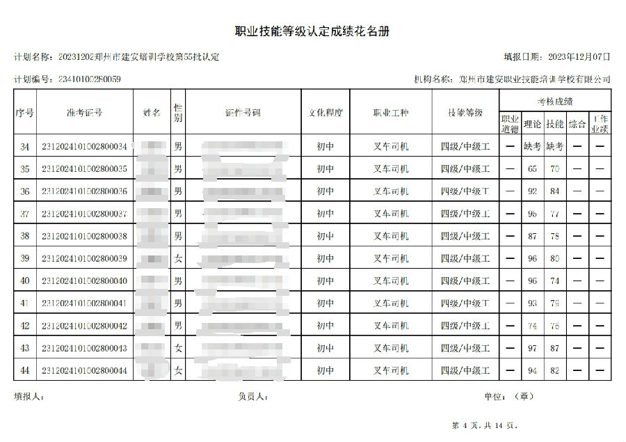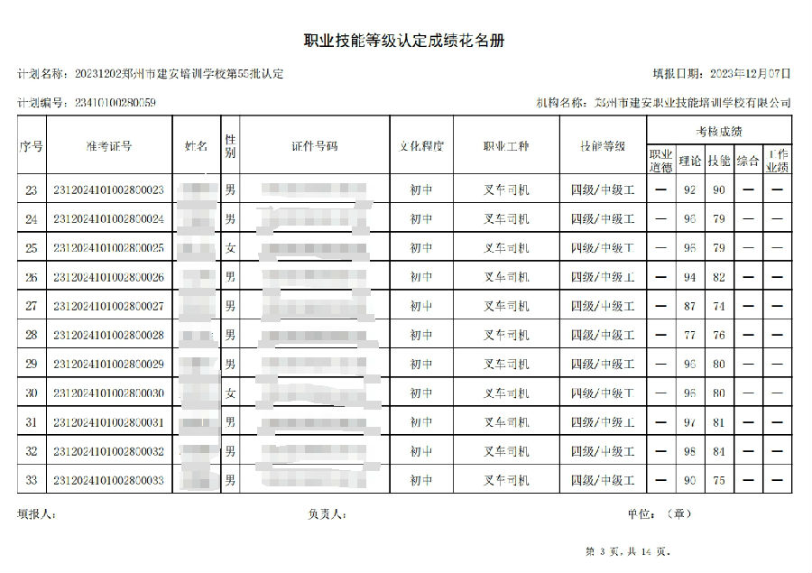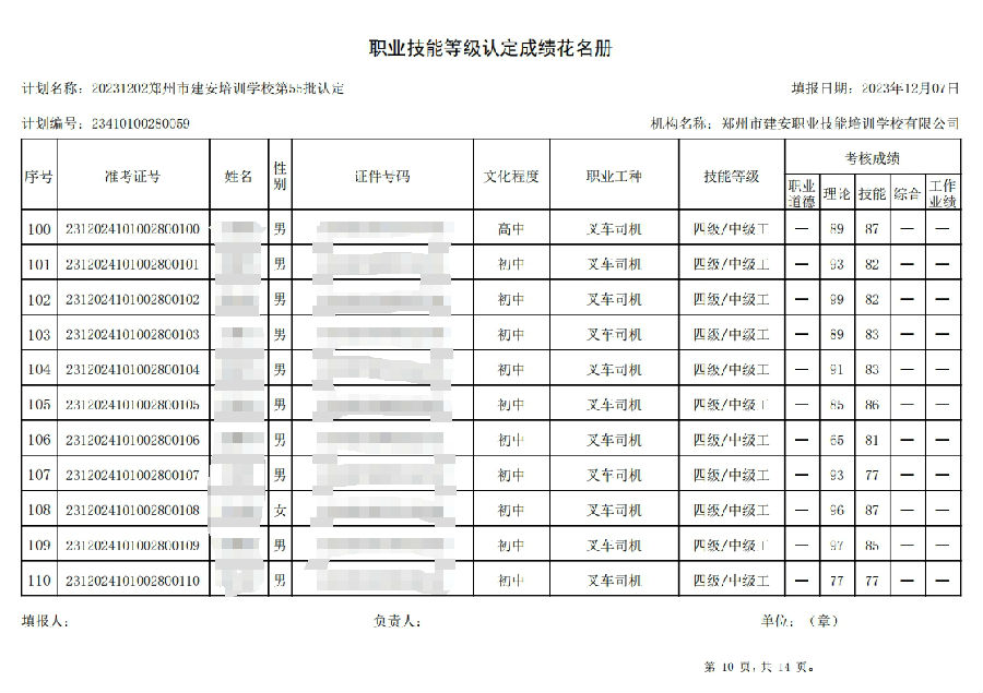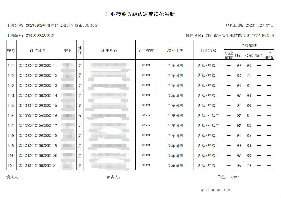 2023年12月2日,在郑州市建安职业技能培训学校进行的第55批次【叉车司机】职业技能等级认定考试,阅卷工作已结束,现将各位考生成绩予以公示,公示期为3天,公示期限为:2023年12月8日至2023年12月10日。