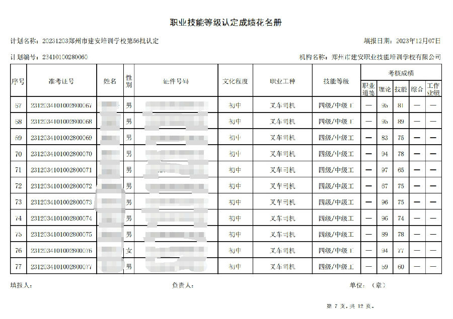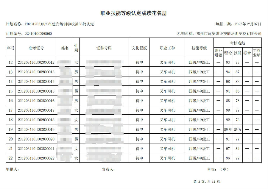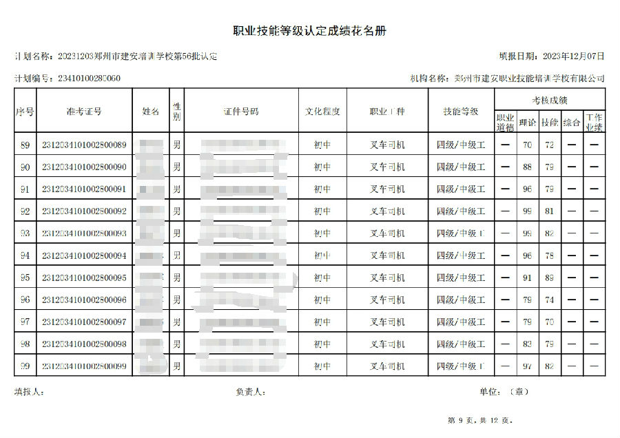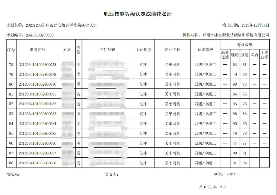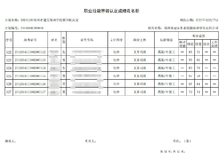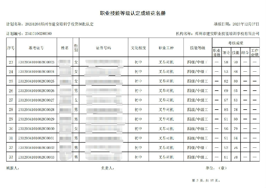 2023年12月3日,在郑州市建安职业技能培训学校进行的第56批次【叉车司机】职业技能等级认定考试,阅卷工作已结束,现将各位考生成绩予以公示,公示期为3天,公示期限为:2023年12月8日至2023年12月10日。