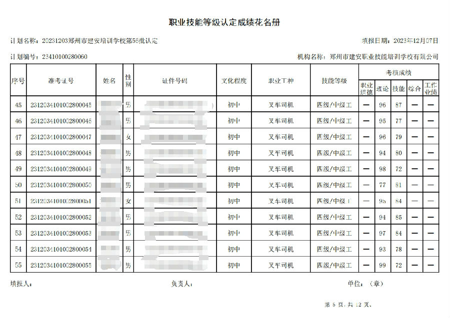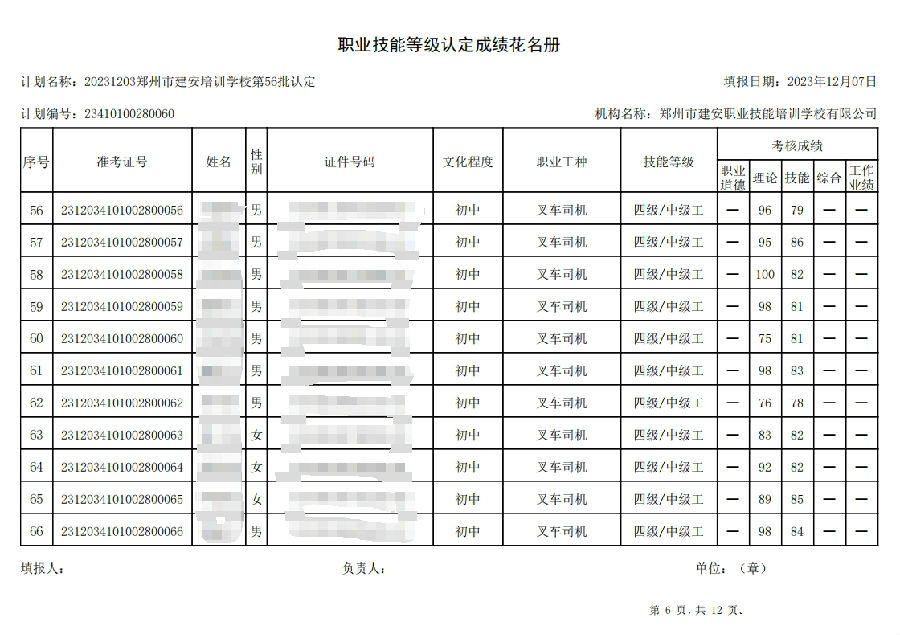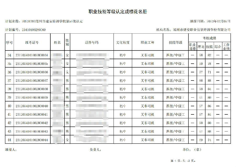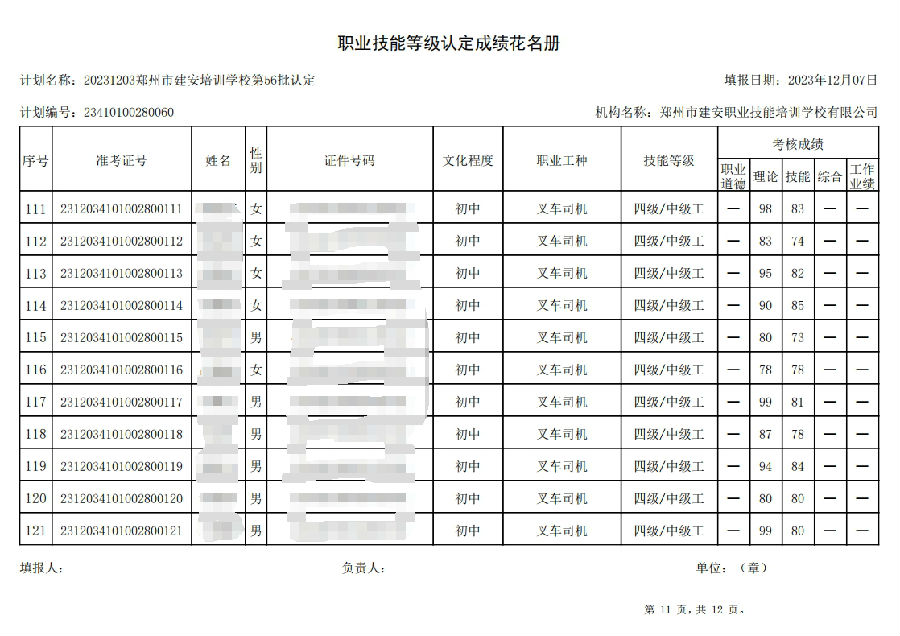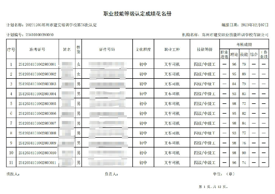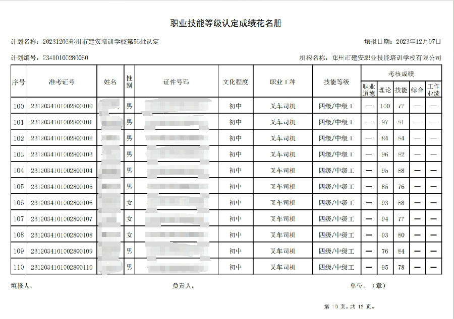 2023年12月3日,在郑州市建安职业技能培训学校进行的第56批次【叉车司机】职业技能等级认定考试,阅卷工作已结束,现将各位考生成绩予以公示,公示期为3天,公示期限为:2023年12月8日至2023年12月10日。