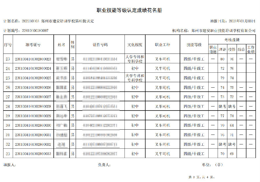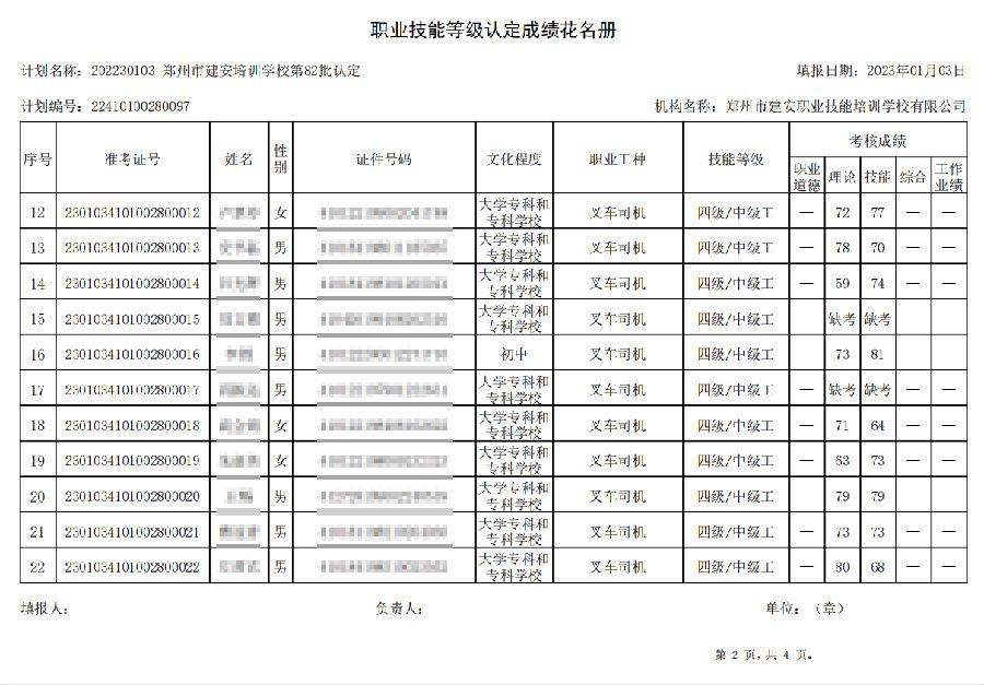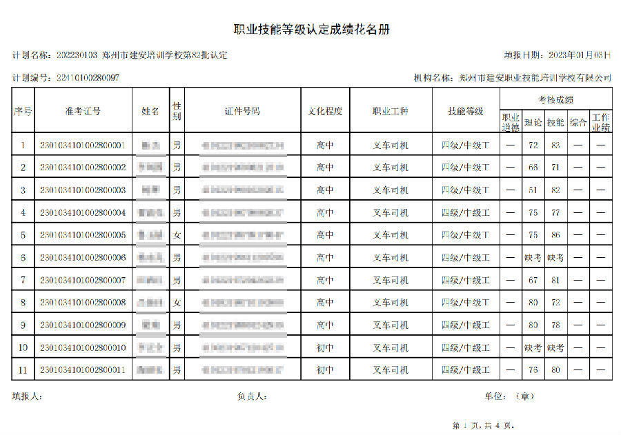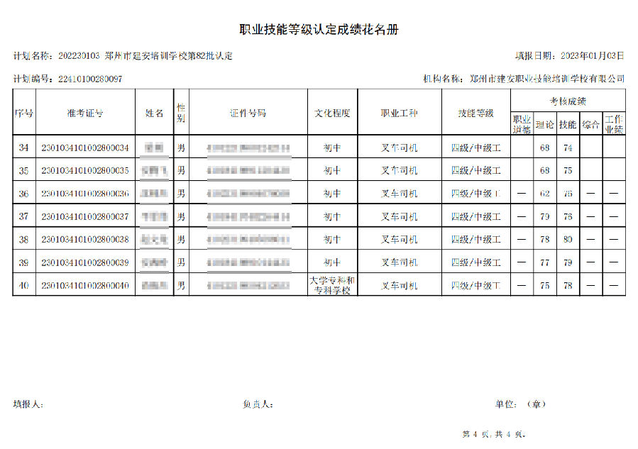 2023年01月03日,在郑州市建安技能培训学校进行的【叉车司机 四级/中级工】职业技能等级认定考试,阅卷工作已结束,现将各位考生成绩予以公示,公示期为7天,公示期限为:2023年01月05日至2023年01月12日。