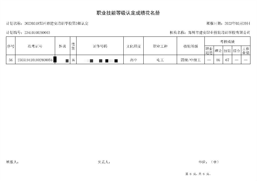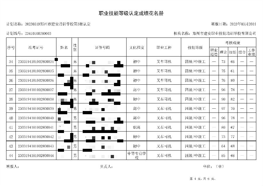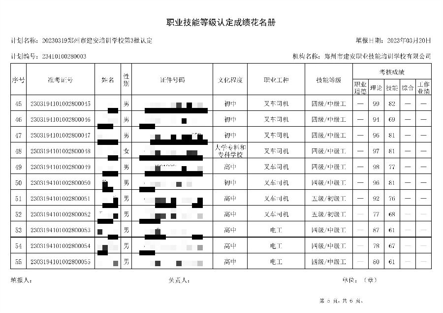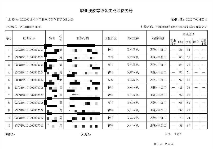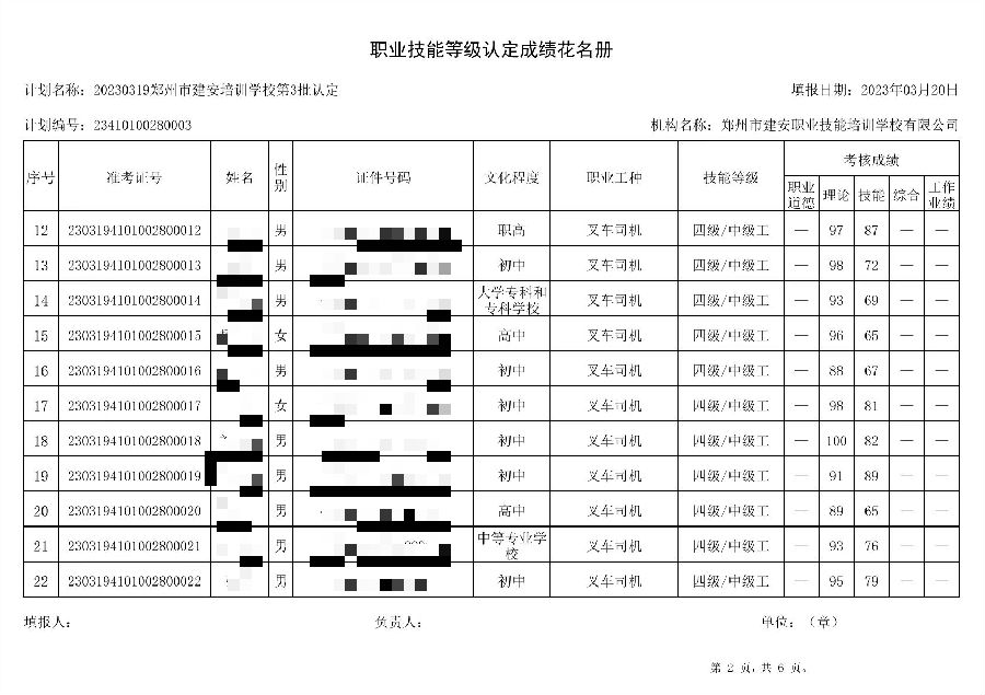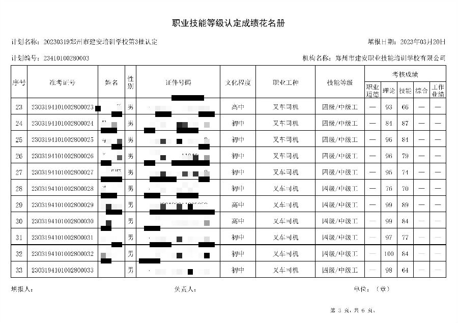 2023年3月19日,在郑州市建安技能培训学校进行的第3批次【叉车司机】【电工】职业技能等级认定考试,阅卷工作已结束,现将各位考生成绩予以公示,公示期为3天,公示期限为:2023年3月20日至2023年3月23日。