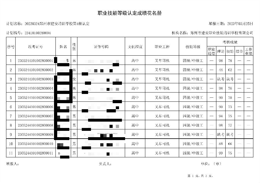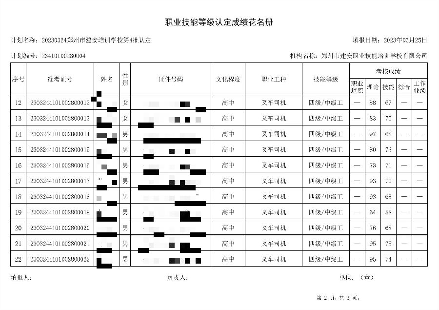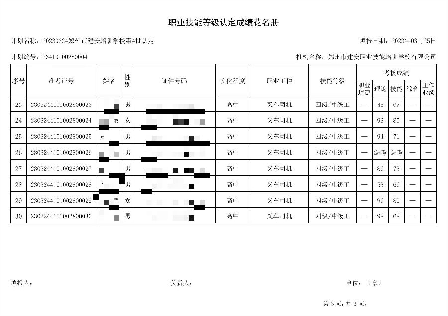 2023年3月24日,在郑州市建安技能培训学校进行的第4批次【叉车司机】职业技能等级认定考试,阅卷工作已结束,现将各位考生成绩予以公示,公示期为3天,公示期限为:2023年3月25日至2023年3月28日。