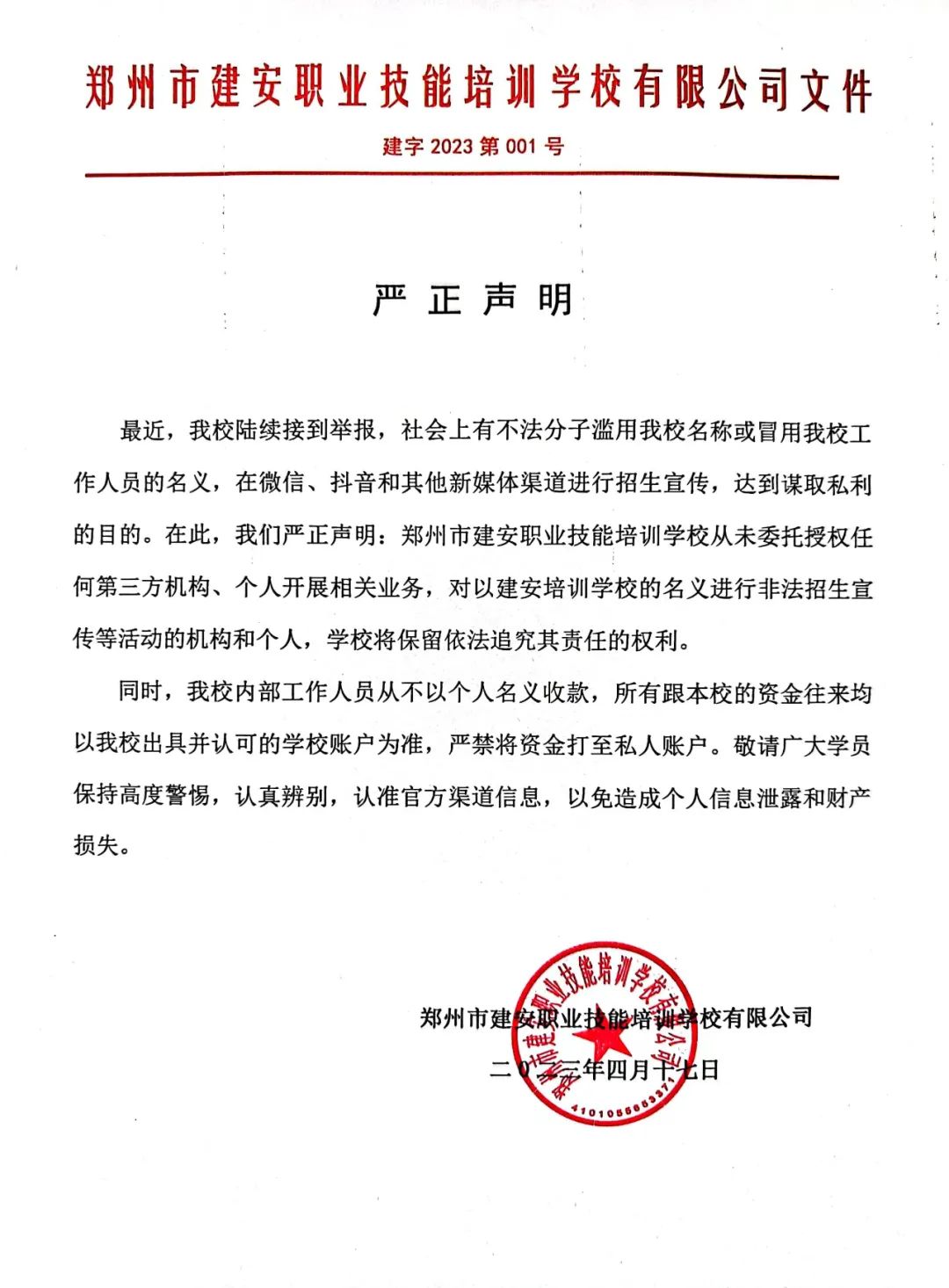 最近,我校陆续接到举报,社会上有不法分子滥用我校名称或冒用我校工作人员的名义,在微信、抖音和其他新媒体渠道进行招生宣传,达到谋取利益的目的。在此,我们严正声明:郑州市建安职业技能培训学校从未委托授权任何第三方机构、个人开展相关业务,对以建安培训学校的名义进行非法招生宣传等活动的机构和个人,学校将保留依法追究其责任的权利。同时,我校内部工作人员从不以个人名义收款,所有跟本校的资金往来均以我校出具并认可的账户为准,严禁将资金打至私人账户。敬请广大学员保持高度警惕,认真辨别,认准官方渠道信息,以免造成个人信息泄露和财产损失。
