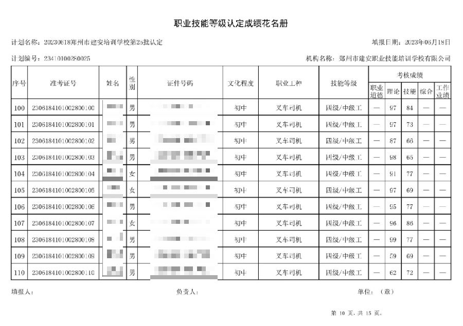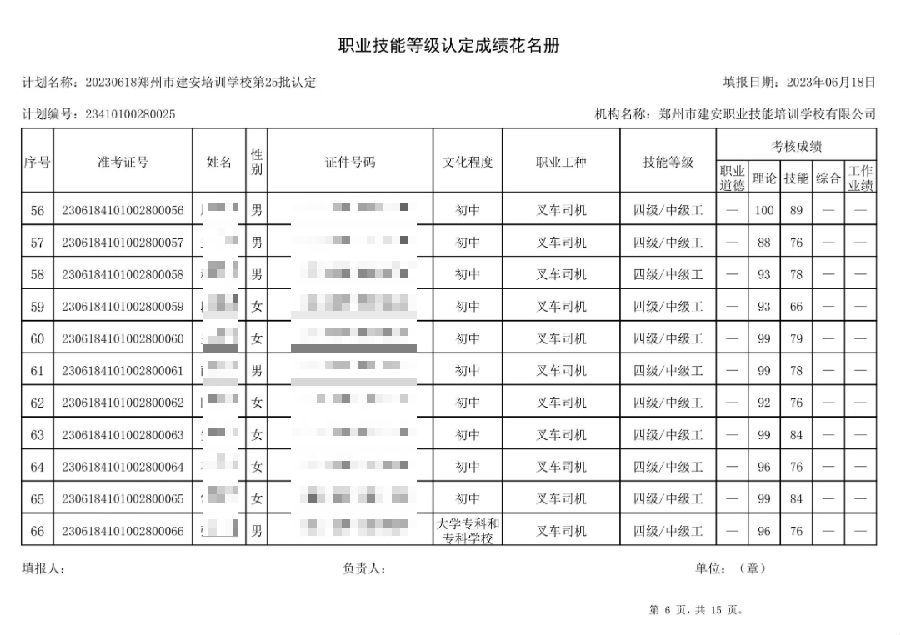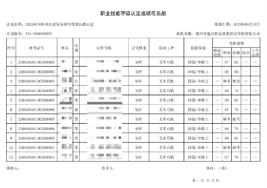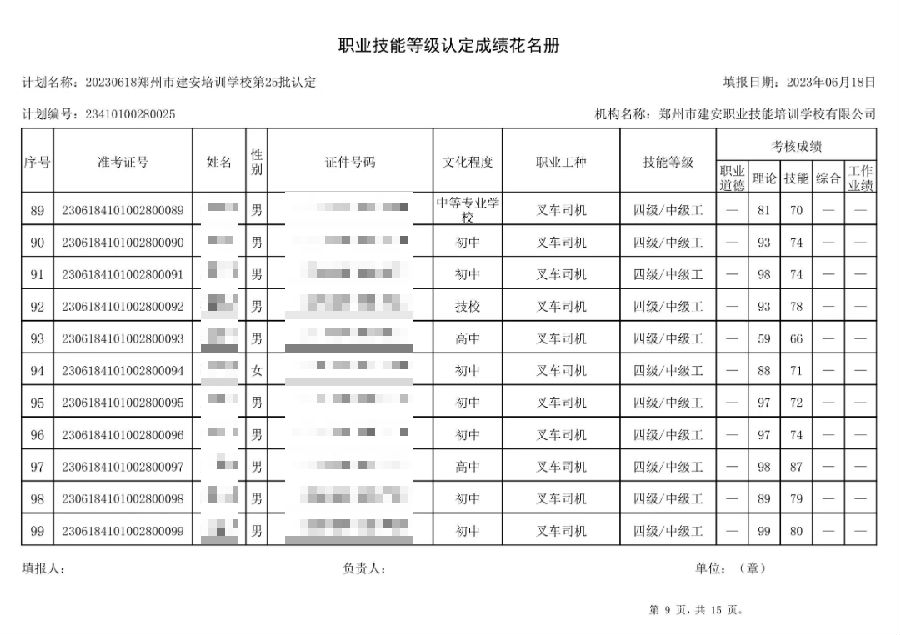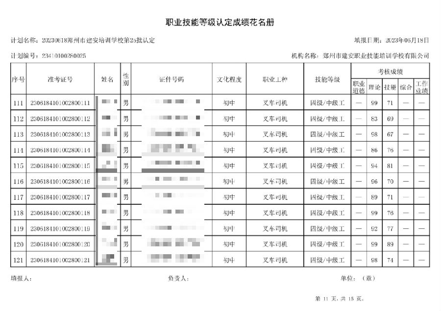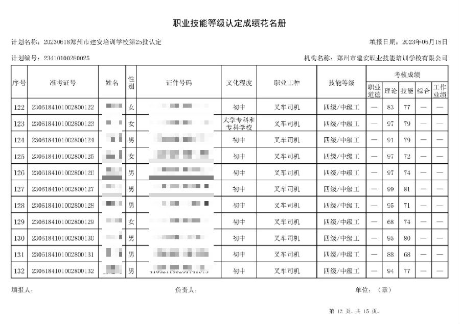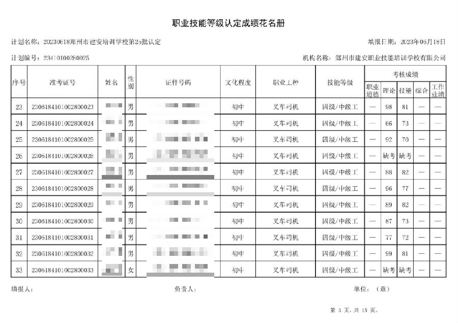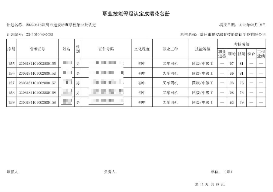 2023年6月18日,在郑州市建安技能培训学校进行的第25批次【叉车司机】【电工】职业技能等级认定考试,阅卷工作已结束,现将各位考生成绩予以公示,公示期为3天,公示期限为:2023年6月19日至2023年6月22日。
