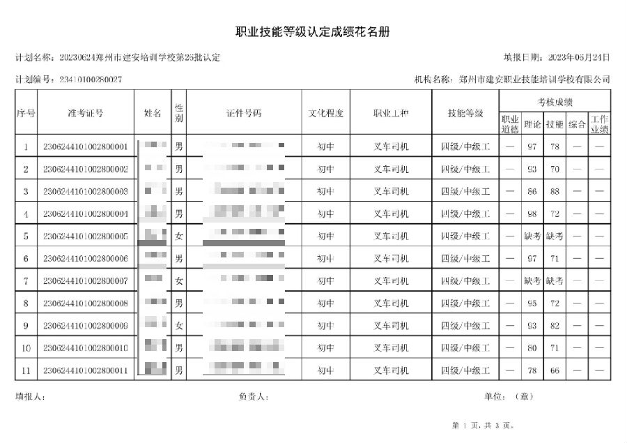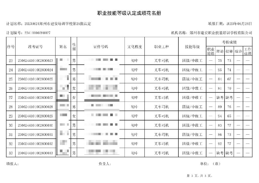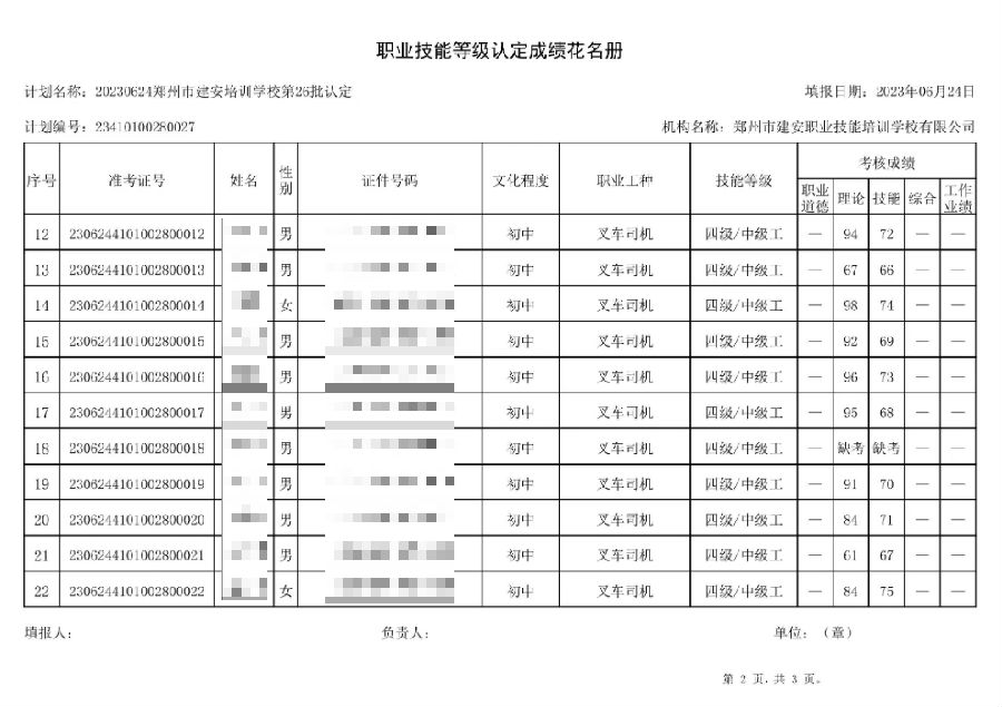 2023年6月24日,在郑州市建安技能培训学校进行的第26批次【叉车司机】职业技能等级认定考试,阅卷工作已结束,现将各位考生成绩予以公示,公示期为3天,公示期限为:2023年6月25日至2023年6月28日。