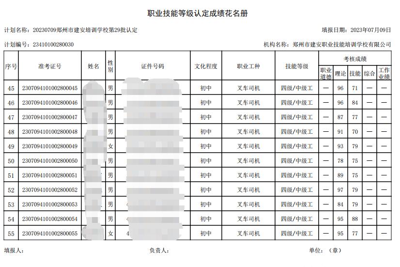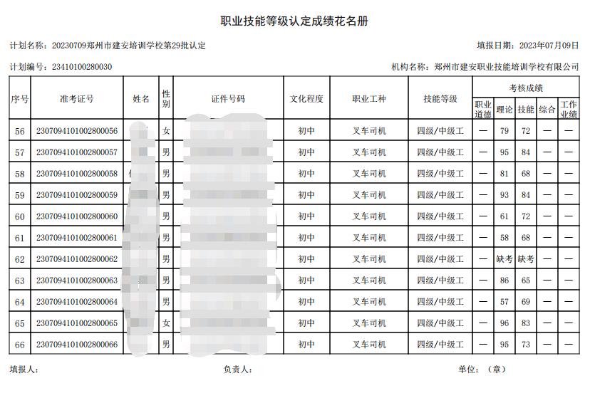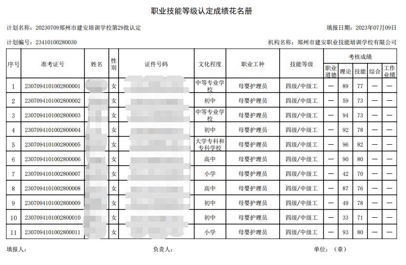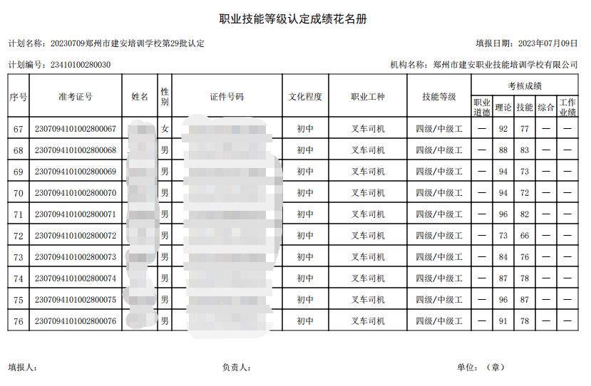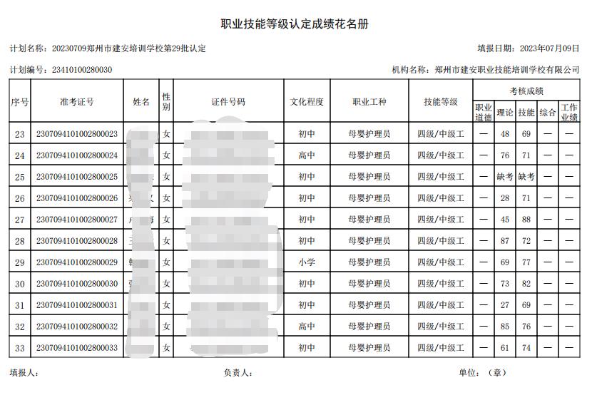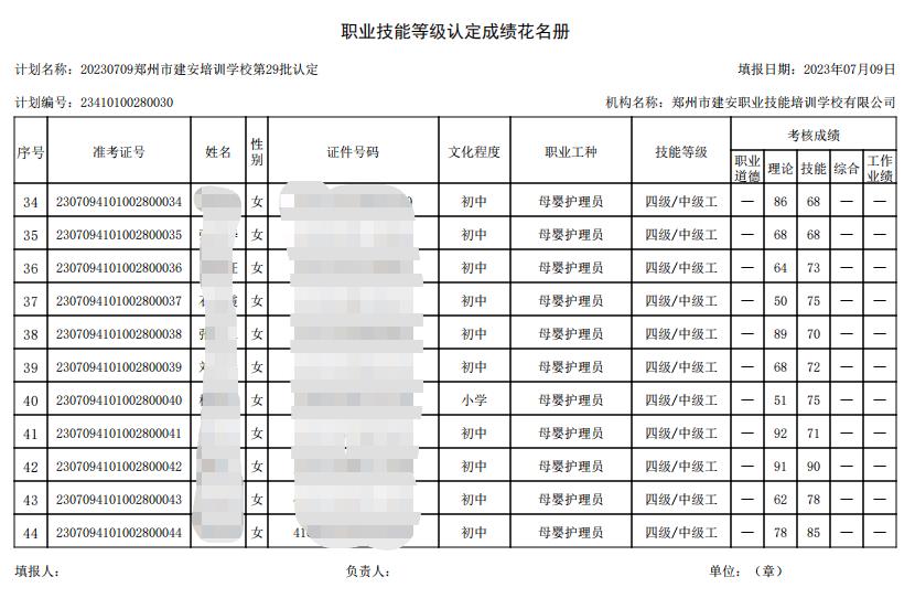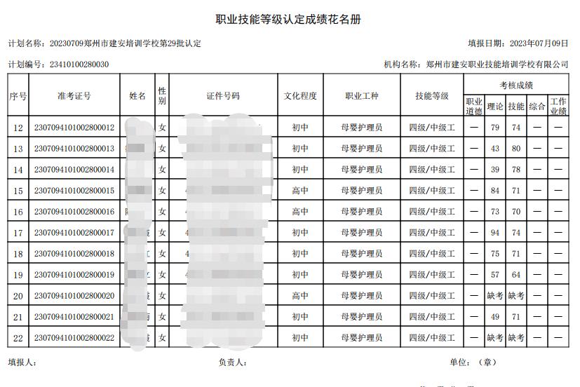 2023年7月9日,在郑州市建安技能培训学校进行的第29批次【母婴护理员】【叉车司机】职业技能等级认定考试,阅卷工作已结束,现将各位考生成绩予以公示,公示期为3天,公示期限为:2023年7月10日至2023年7月13日。