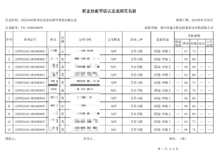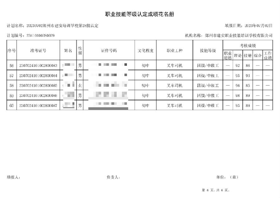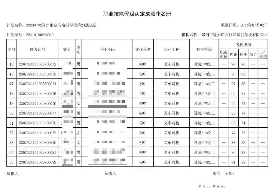 2023年7月2日,在郑州市建安技能培训学校进行的第28批次【叉车司机】职业技能等级认定考试,阅卷工作已结束,现将各位考生成绩予以公示,公示期为3天,公示期限为:2023年7月3日至2023年7月6日。