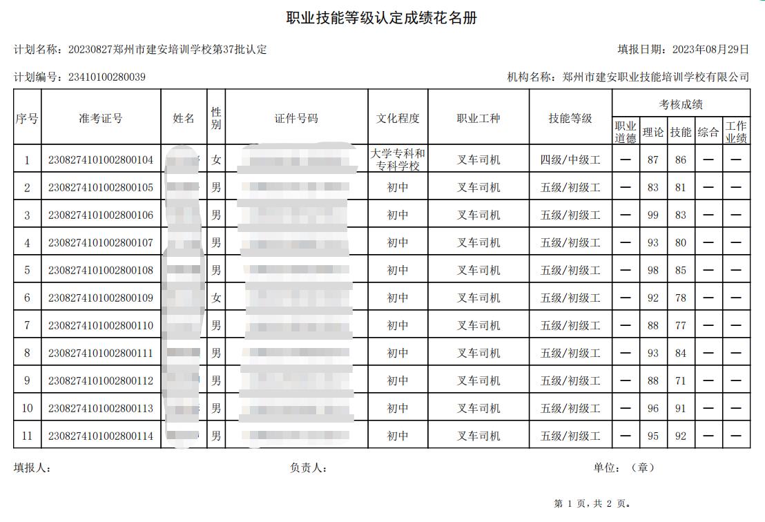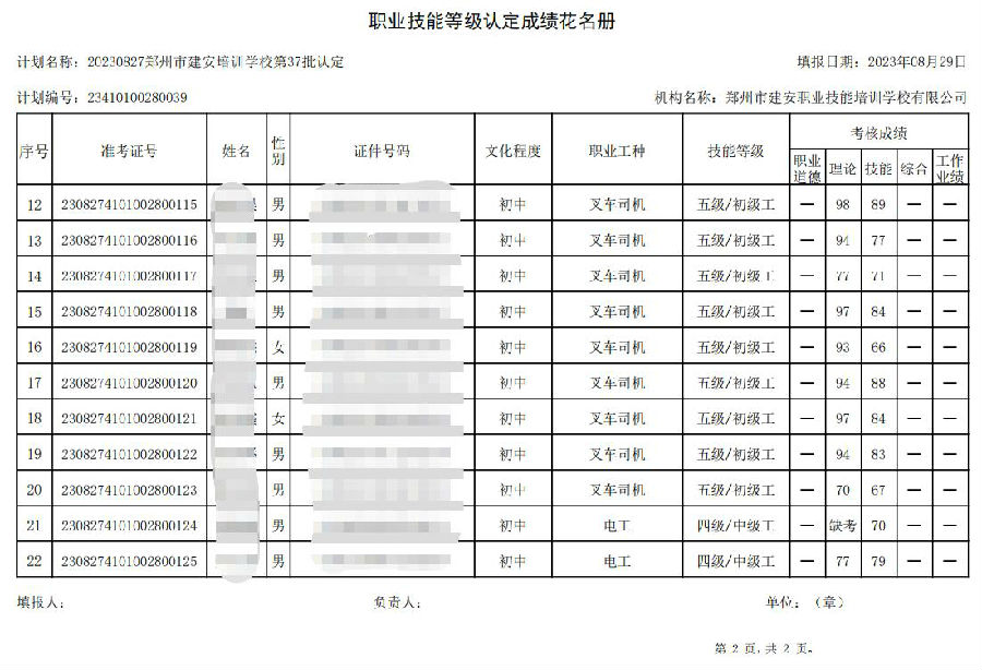 2023年8月27日,在郑州市建安职业技能培训学校进行的第37批次【叉车司机】【电工】职业技能等级认定考试,阅卷工作已结束,现将各位考生成绩予以公示,公示期为3天,公示期限为:2023年8月29日至2023年8月31日。若考生对自己的成绩有异议,请于公示期内(上午8:30至12点,下午13:30到18:00)携带本人身份证,到郑州市高新区玉兰街83号建安职业技能培训学校申请成绩复核。以上,逾期不再受理。