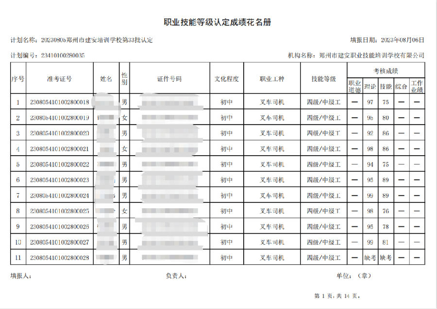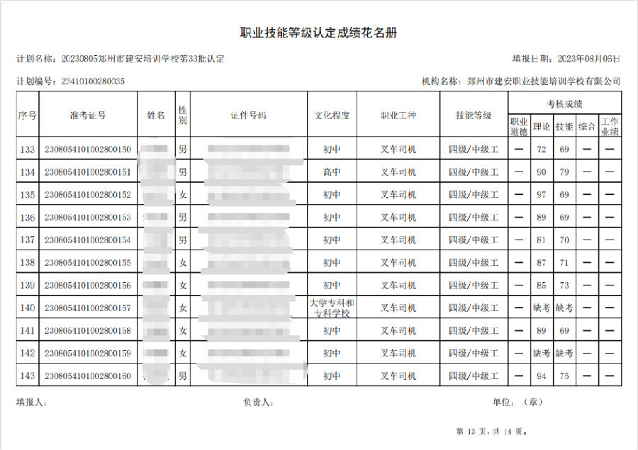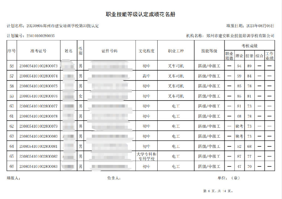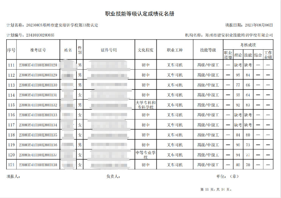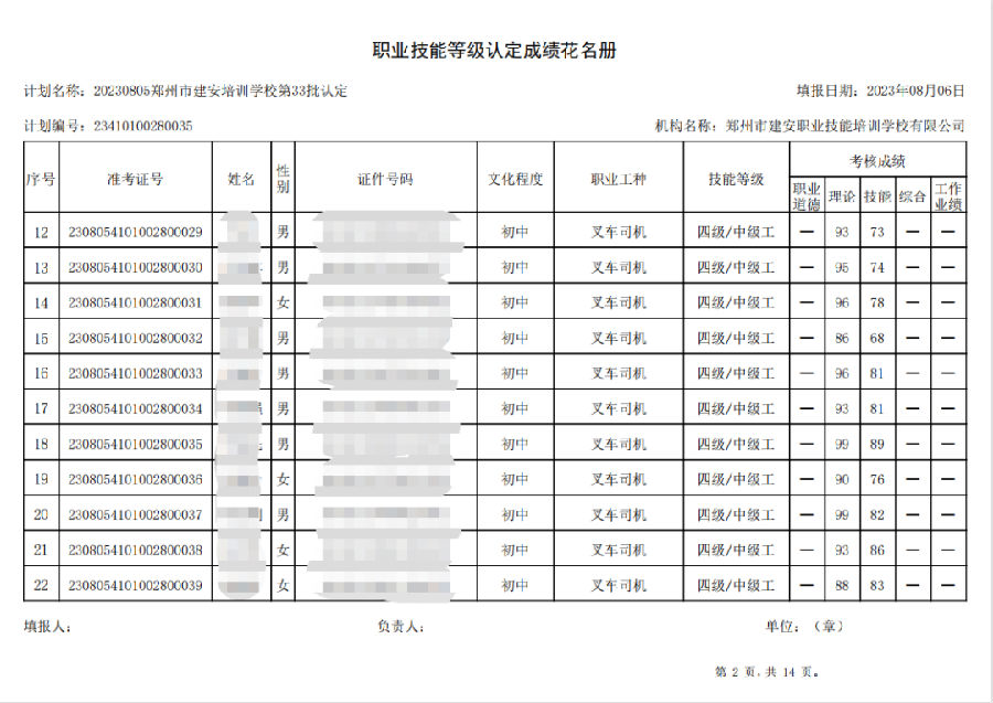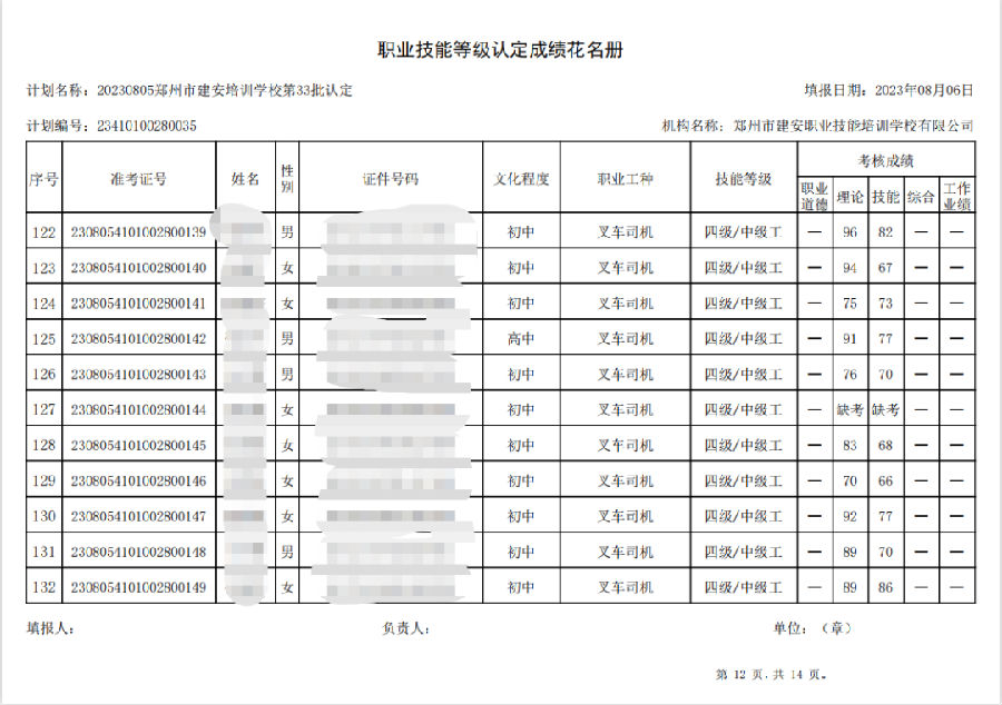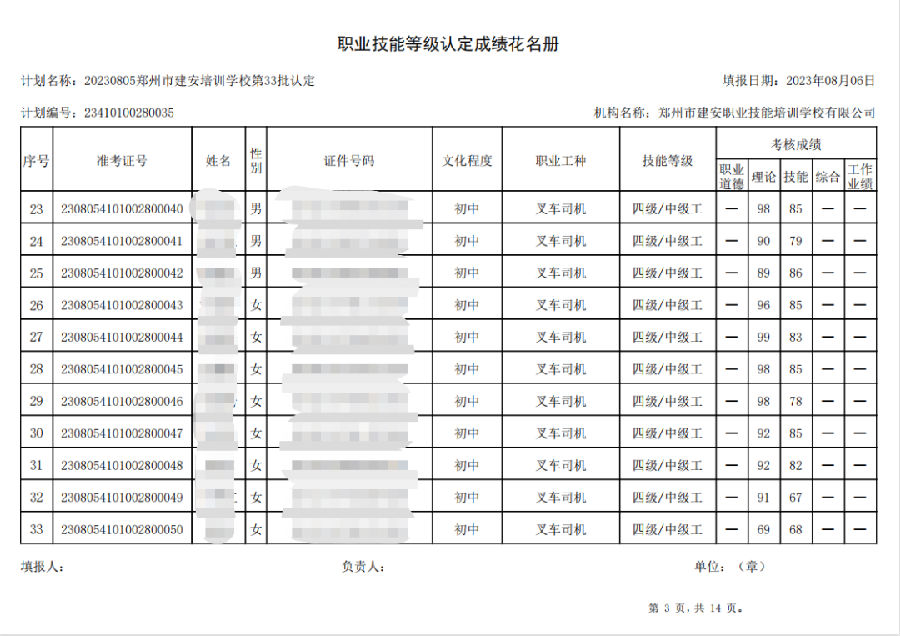 2023年8月5日,在郑州市建安职业技能培训学校进行的第33批次【叉车司机】【电工】职业技能等级认定考试,阅卷工作已结束,现将各位考生成绩予以公示,公示期为3天,公示期限为:2023年8月8日至2023年8月10日。若考生对自己的成绩有异议,请于公示期内(上午8:30至12点,下午13:30到18:00)携带本人身份证,到郑州市高新区玉兰街83号建安职业技能培训学校申请成绩复核。以上,逾期不再受理。