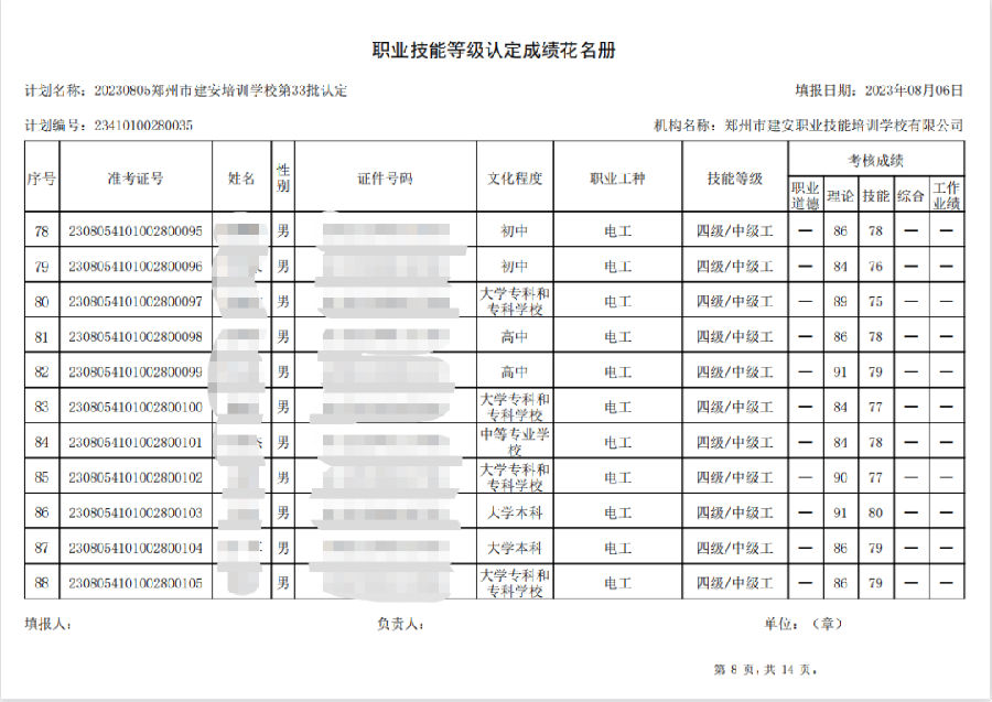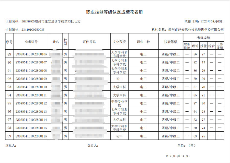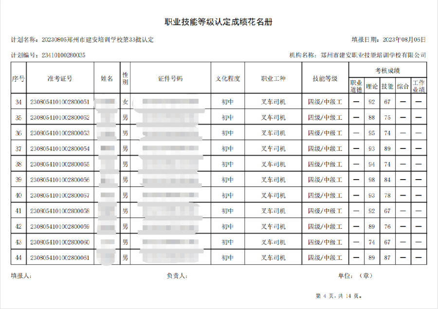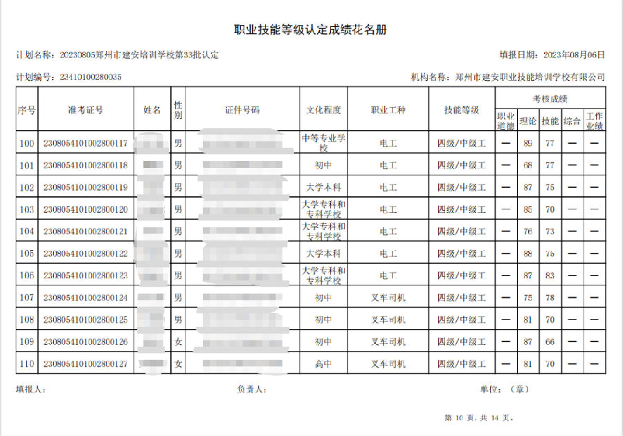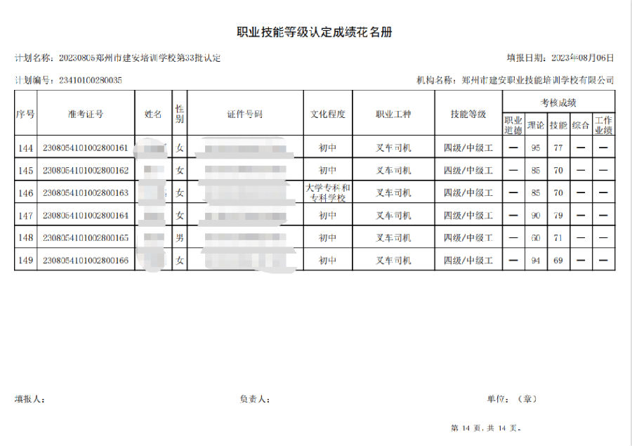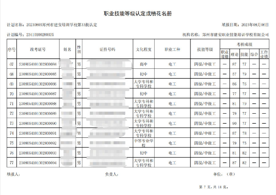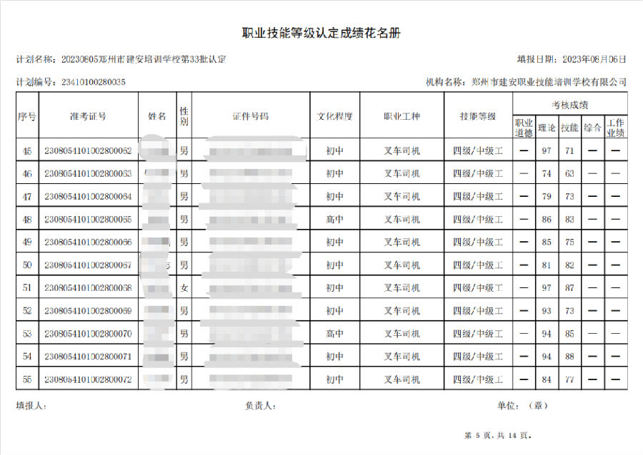 2023年8月5日,在郑州市建安职业技能培训学校进行的第33批次【叉车司机】【电工】职业技能等级认定考试,阅卷工作已结束,现将各位考生成绩予以公示,公示期为3天,公示期限为:2023年8月8日至2023年8月10日。若考生对自己的成绩有异议,请于公示期内(上午8:30至12点,下午13:30到18:00)携带本人身份证,到郑州市高新区玉兰街83号建安职业技能培训学校申请成绩复核。以上,逾期不再受理。