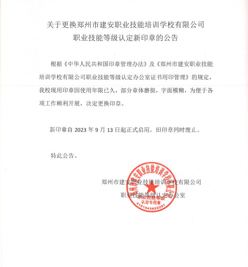 关于更换郑州市建安职业技能培训学校有限公司职业技能等级认定新印章的公告