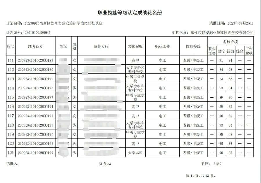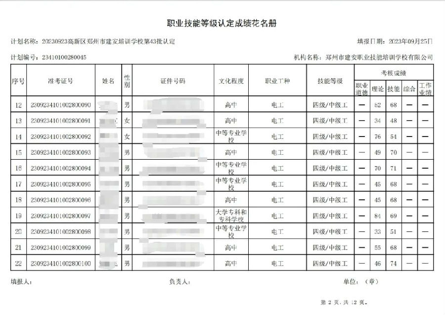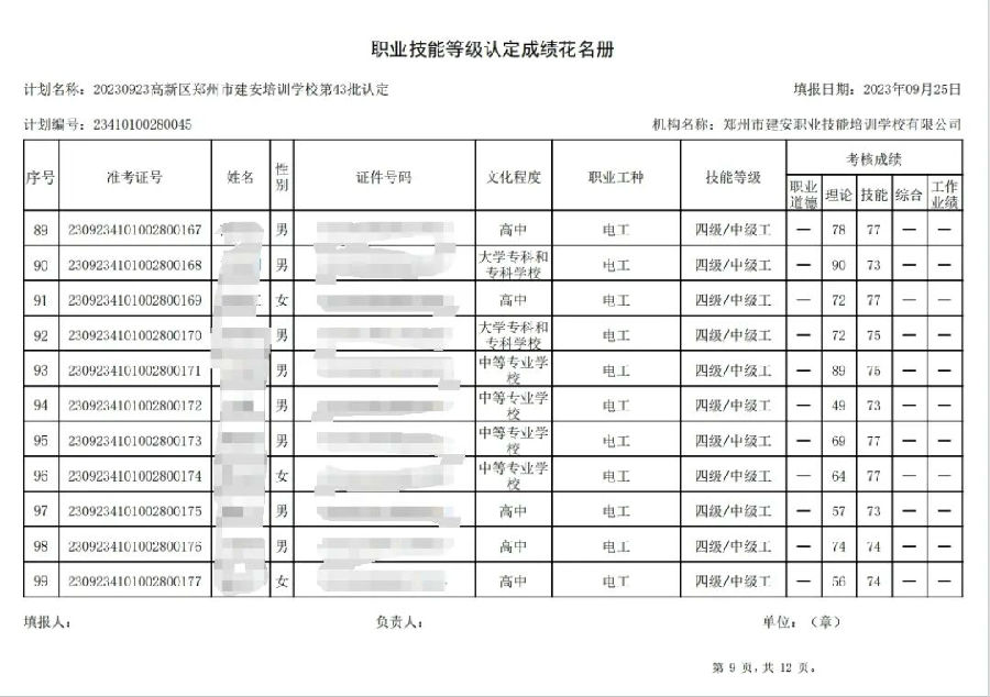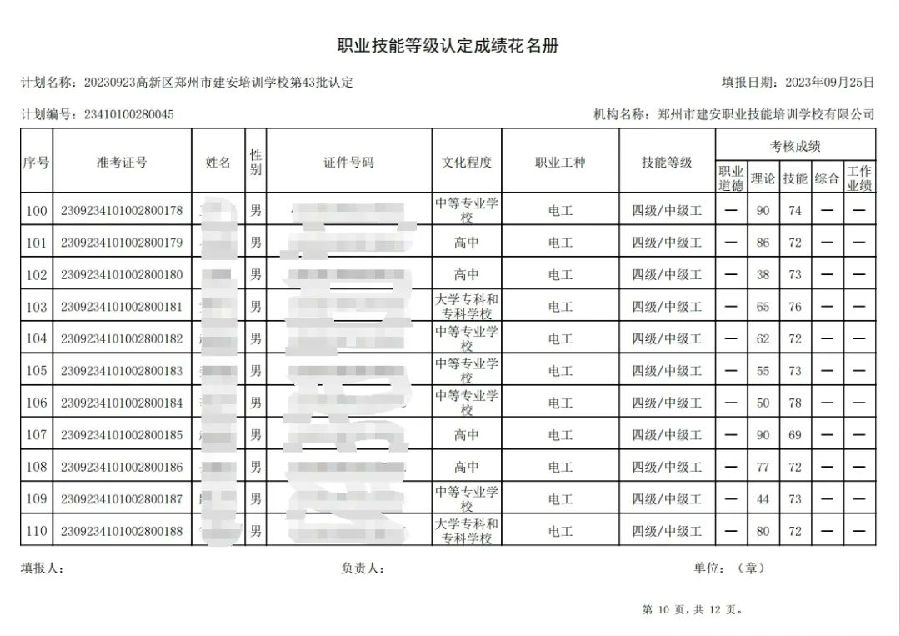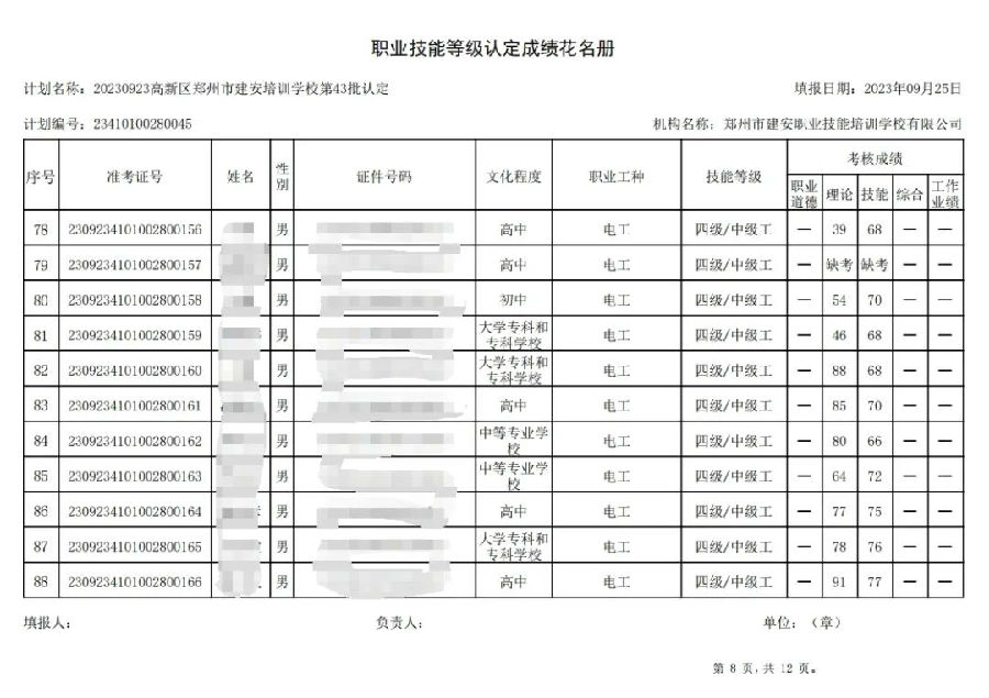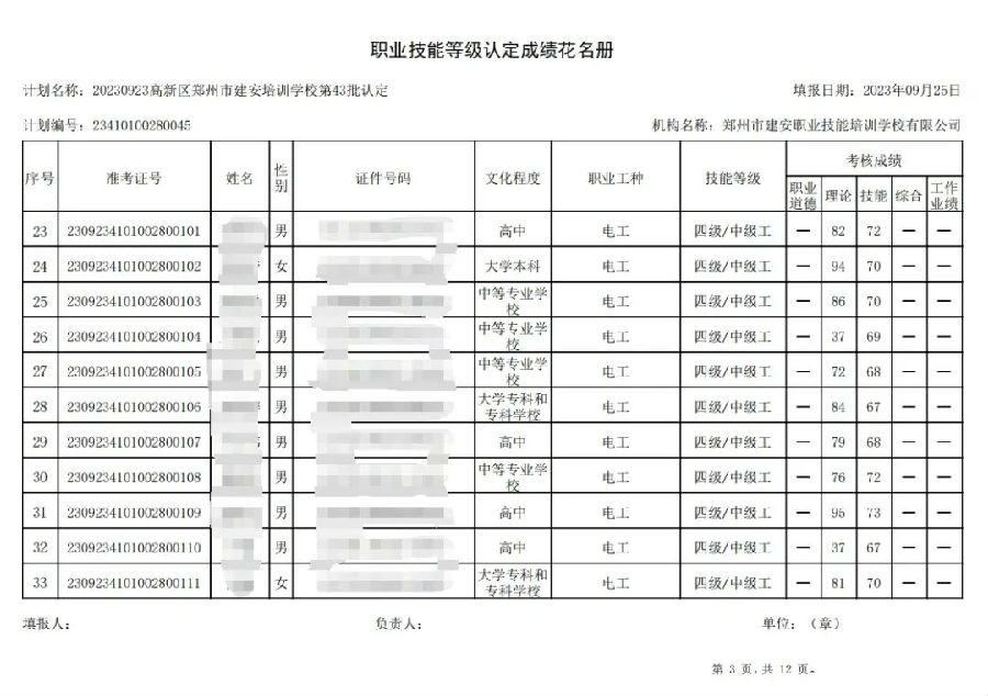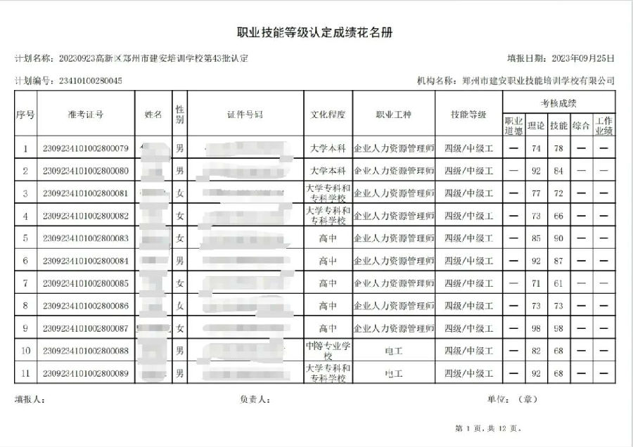 2023年9月23日,在郑州市建安职业技能培训学校进行的第43批次【企业人力资源管理师】【电工】职业技能等级认定考试,阅卷工作已结束,现将各位考生成绩予以公示,公示期为3天,公示期限为:2023年9月26日至2023年9月28日。若考生对自己的成绩有异议,请于公示期内(上午8:30至12点,下午13:30到18:00)携带本人身份证,到郑州市高新区玉兰街83号建安职业技能培训学校申请成绩复核。以上,逾期不再受理。