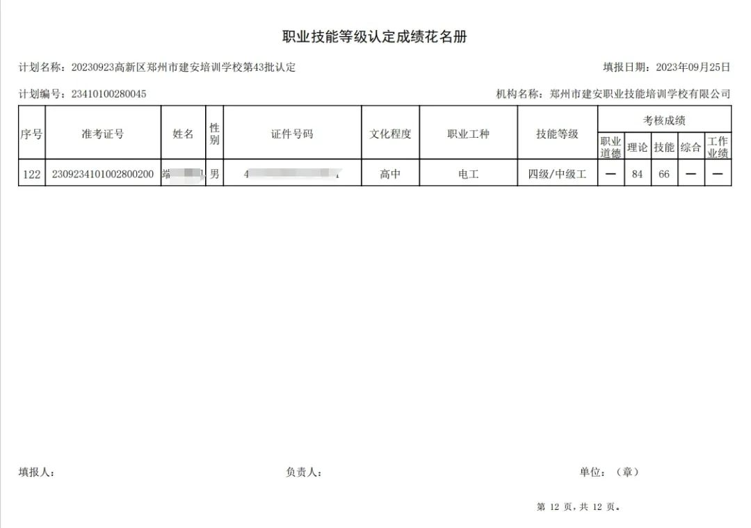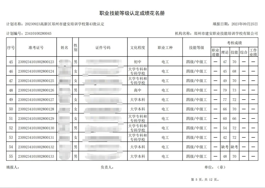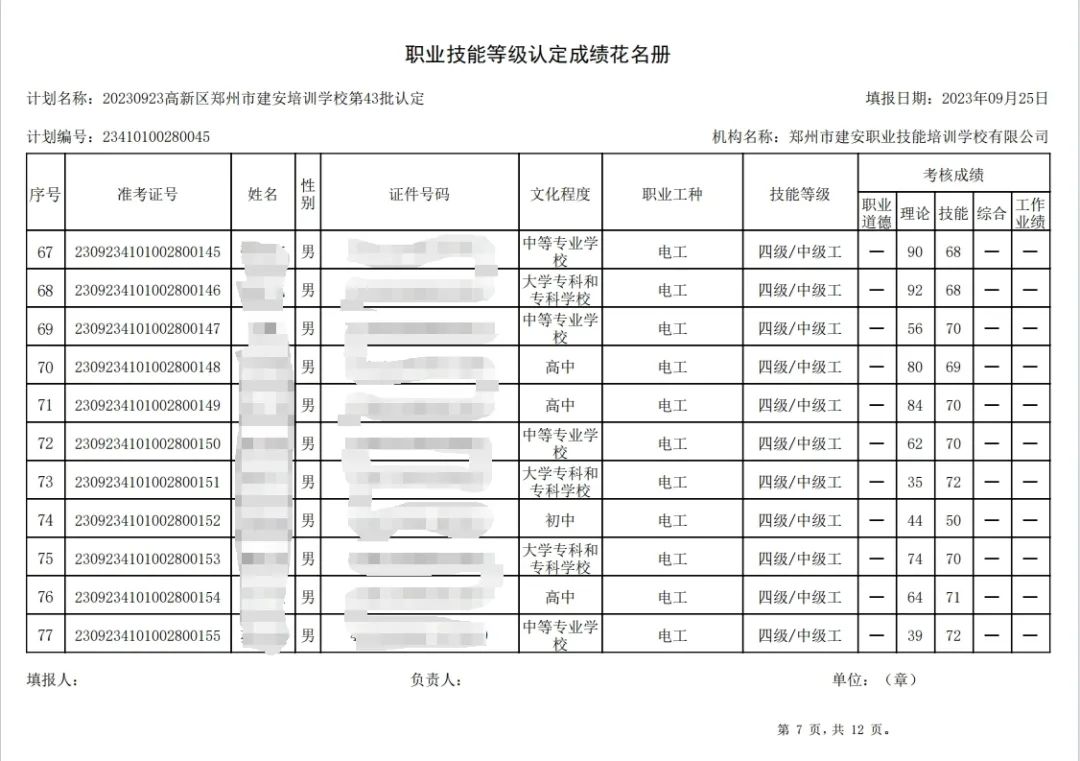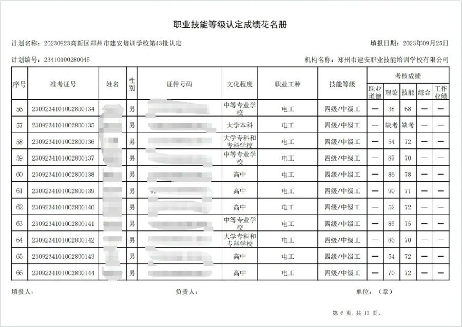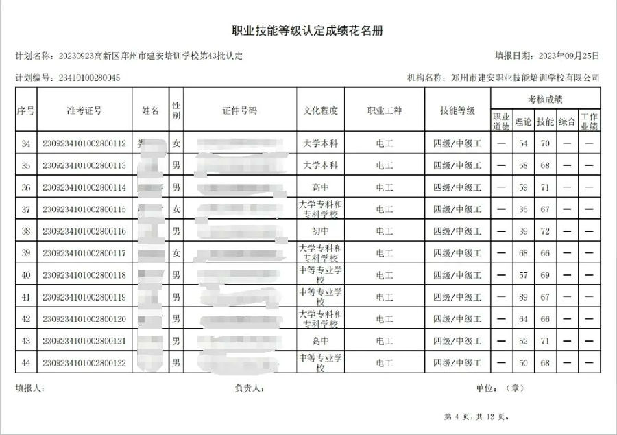 2023年9月23日,在郑州市建安职业技能培训学校进行的第43批次【企业人力资源管理师】【电工】职业技能等级认定考试,阅卷工作已结束,现将各位考生成绩予以公示,公示期为3天,公示期限为:2023年9月26日至2023年9月28日。若考生对自己的成绩有异议,请于公示期内(上午8:30至12点,下午13:30到18:00)携带本人身份证,到郑州市高新区玉兰街83号建安职业技能培训学校申请成绩复核。以上,逾期不再受理。