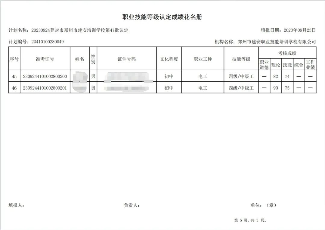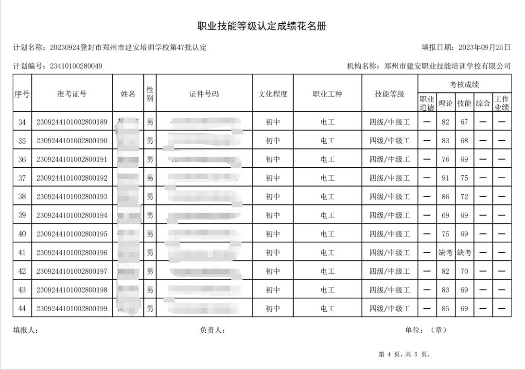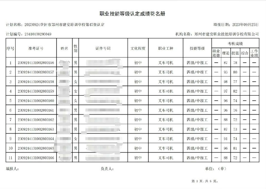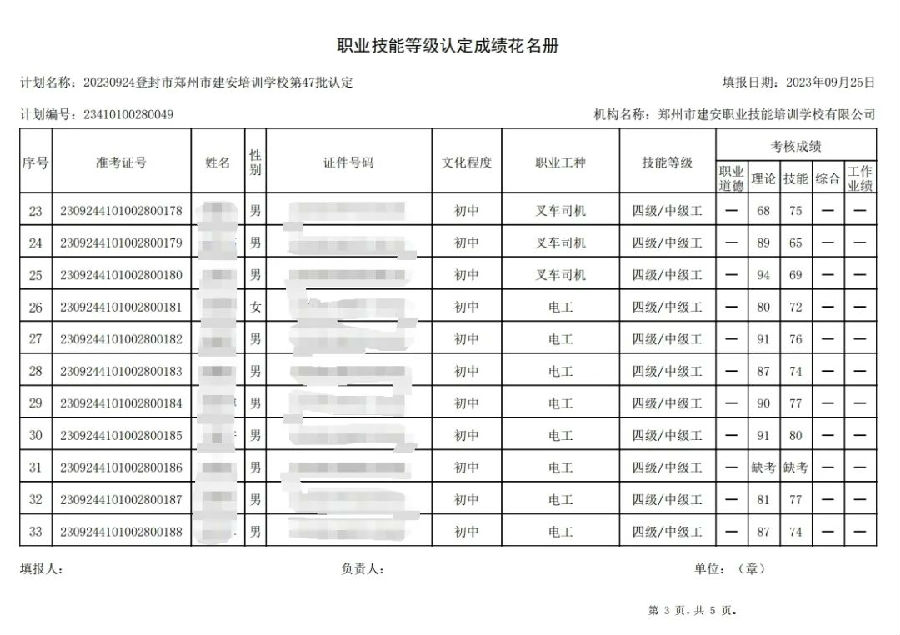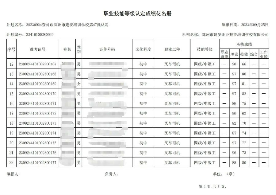 2023年9月24日,在郑州市建安职业技能培训学校进行的第47批次【电工】【叉车司机】职业技能等级认定考试,阅卷工作已结束,现将各位考生成绩予以公示,公示期为3天,公示期限为:2023年9月27日至2023年9月29日。若考生对自己的成绩有异议,请于公示期内(上午8:30至12点,下午13:30到18:00)携带本人身份证,到郑州市高新区玉兰街83号建安职业技能培训学校申请成绩复核。以上,逾期不再受理。