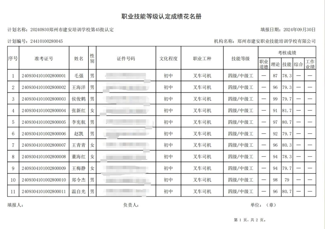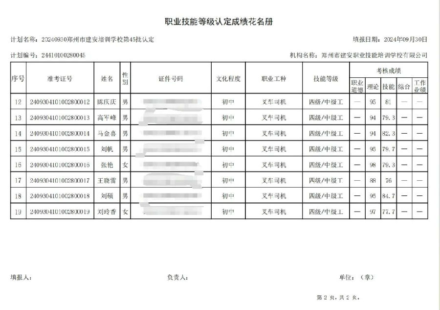 2024年9月30日,在郑州市建安职业技能培训学校进行的第45批次【叉车司机】职业技能等级认定考试,阅卷工作已结束,现将各位考生成绩予以公示,公示期为5天,公示期限为:2024年10月11日至2024年10月15日。