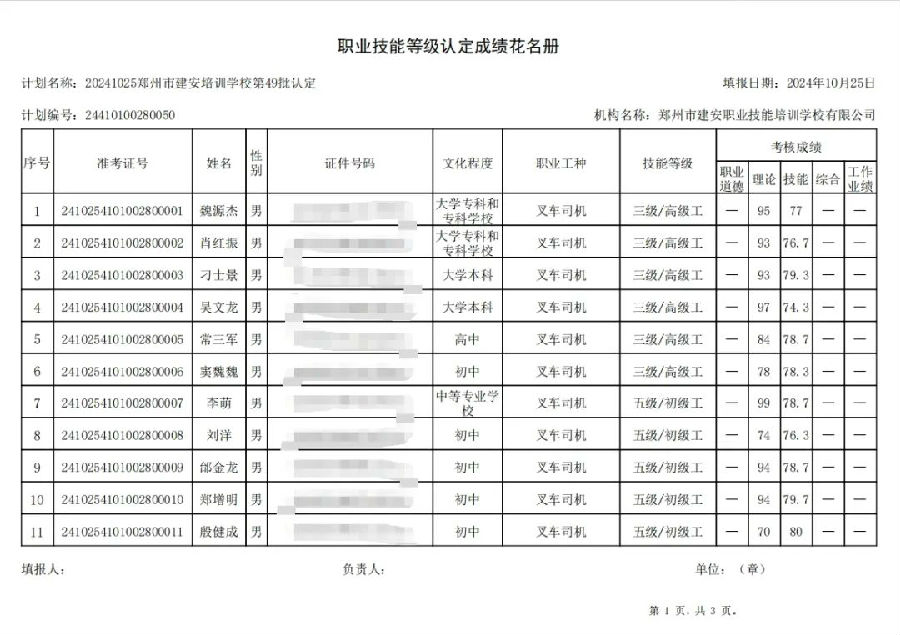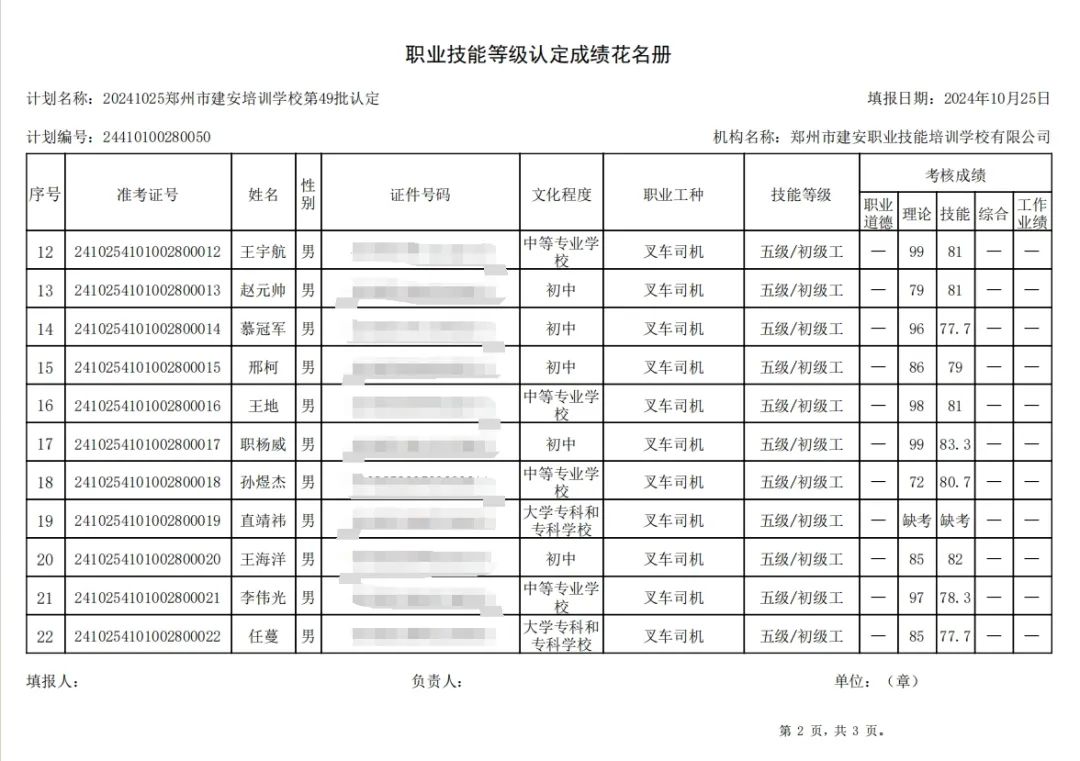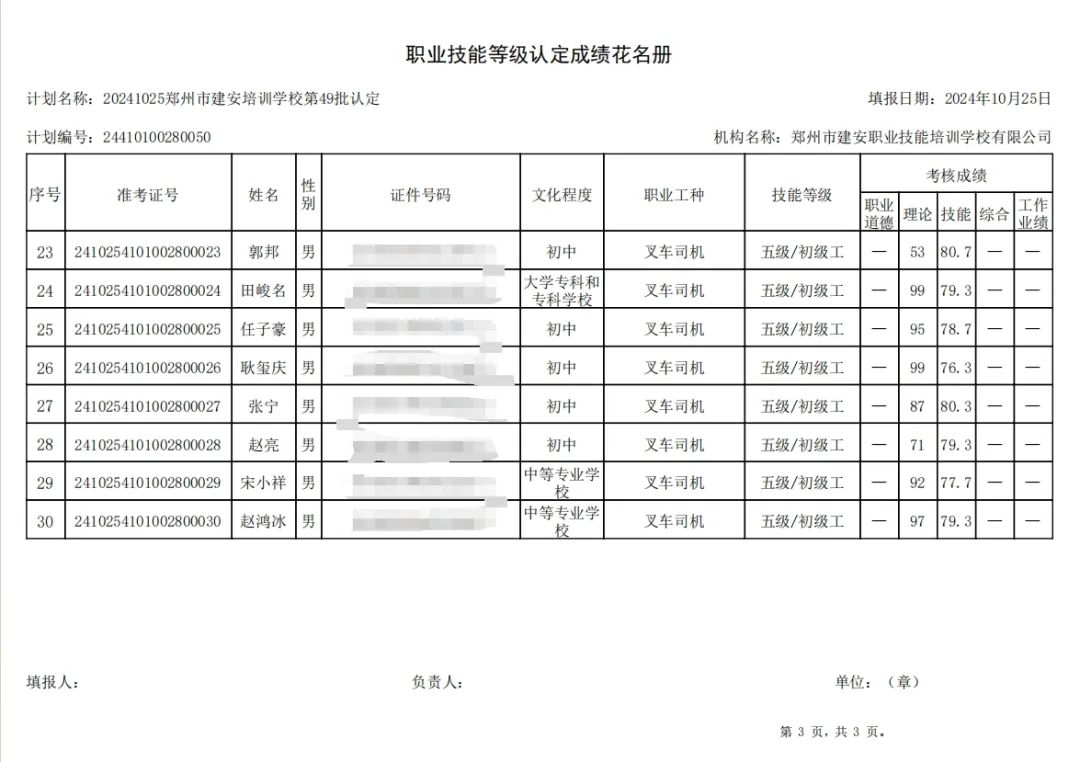 2024年10月25日,在郑州市建安职业技能培训学校进行的第49批次【叉车司机】职业技能等级认定考试,阅卷工作已结束,现将各位考生成绩予以公示,公示期为5天,公示期限为:2024年10月28日至2024年11月1日。