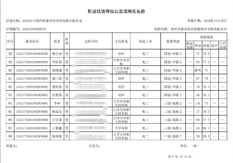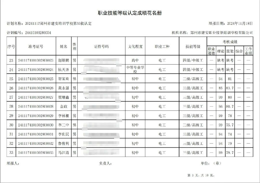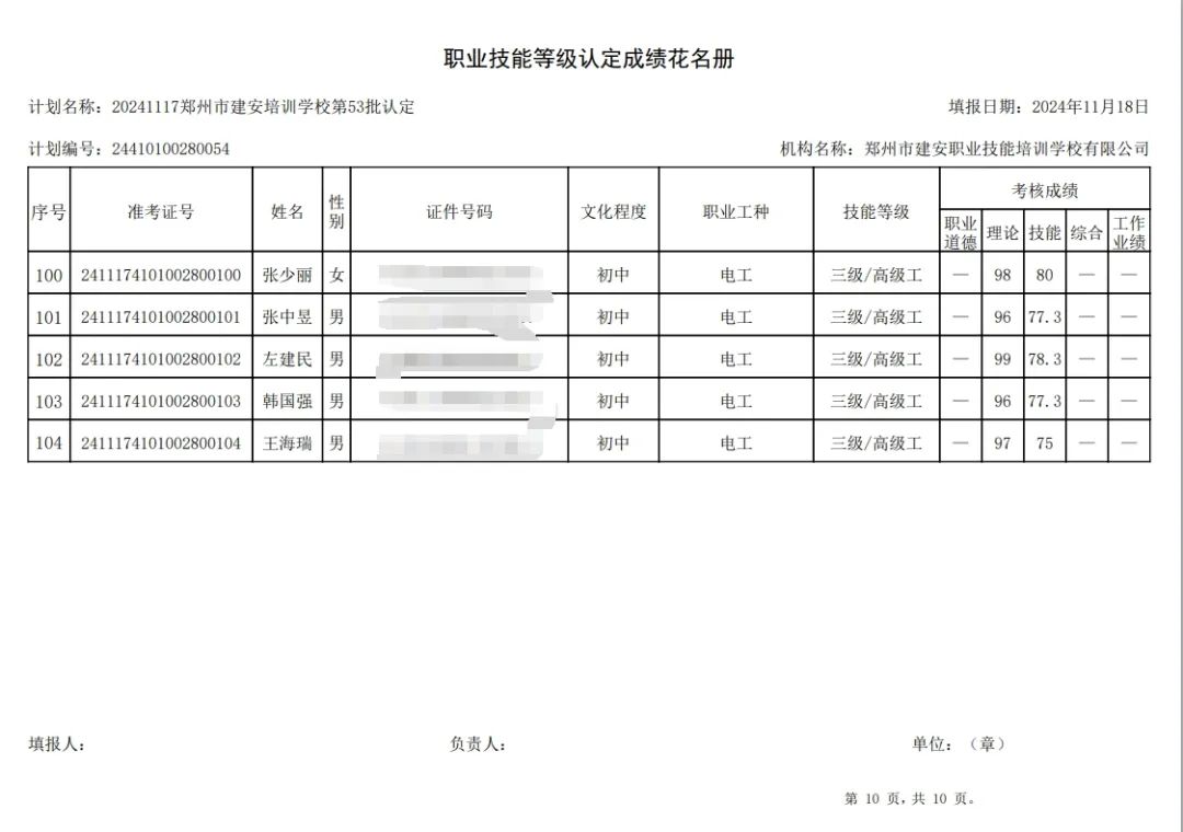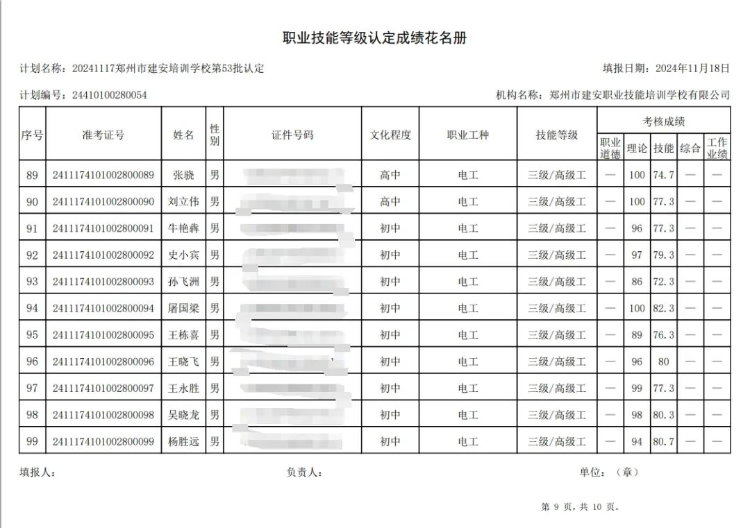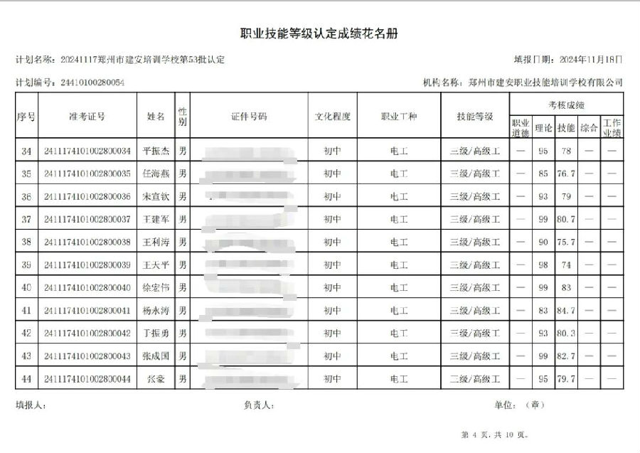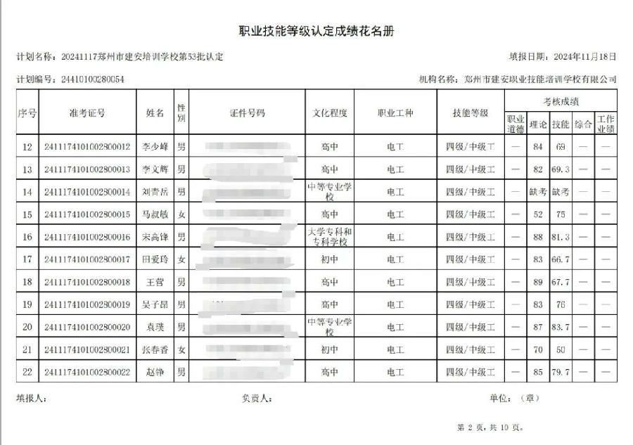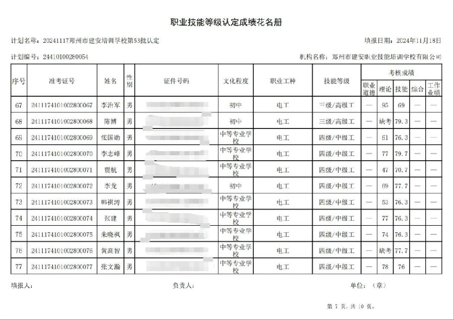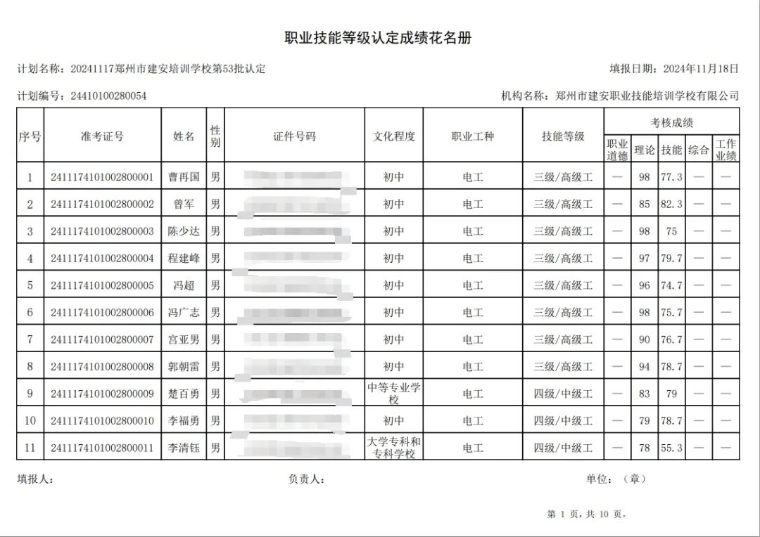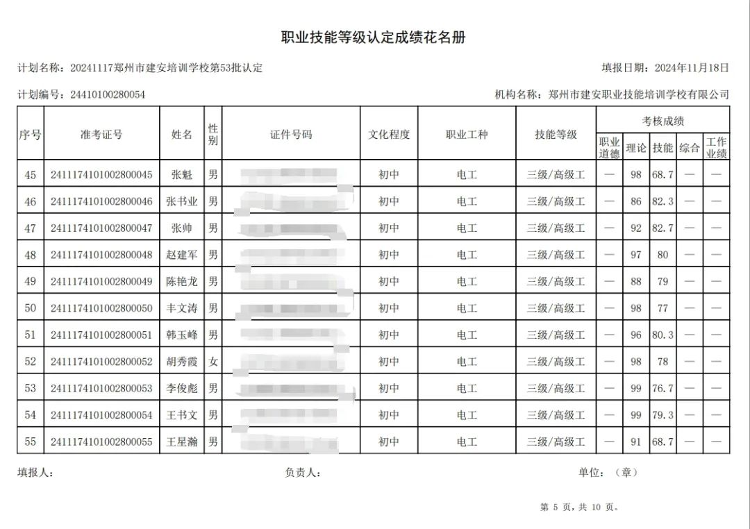 2024年11月17日,在郑州市建安职业技能培训学校进行的第53批次【电工】职业技能等级认定考试,阅卷工作已结束,现将各位考生成绩予以公示,公示期为5天,公示期限为:2024年11月18日至2024年11月22日。