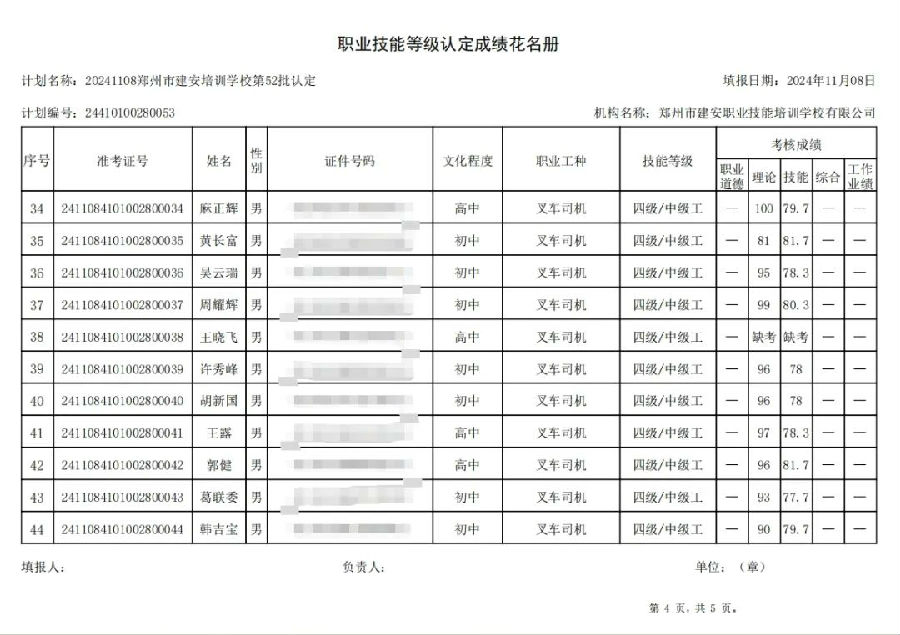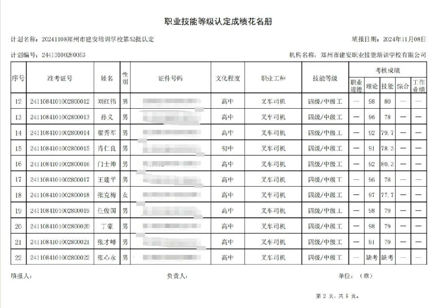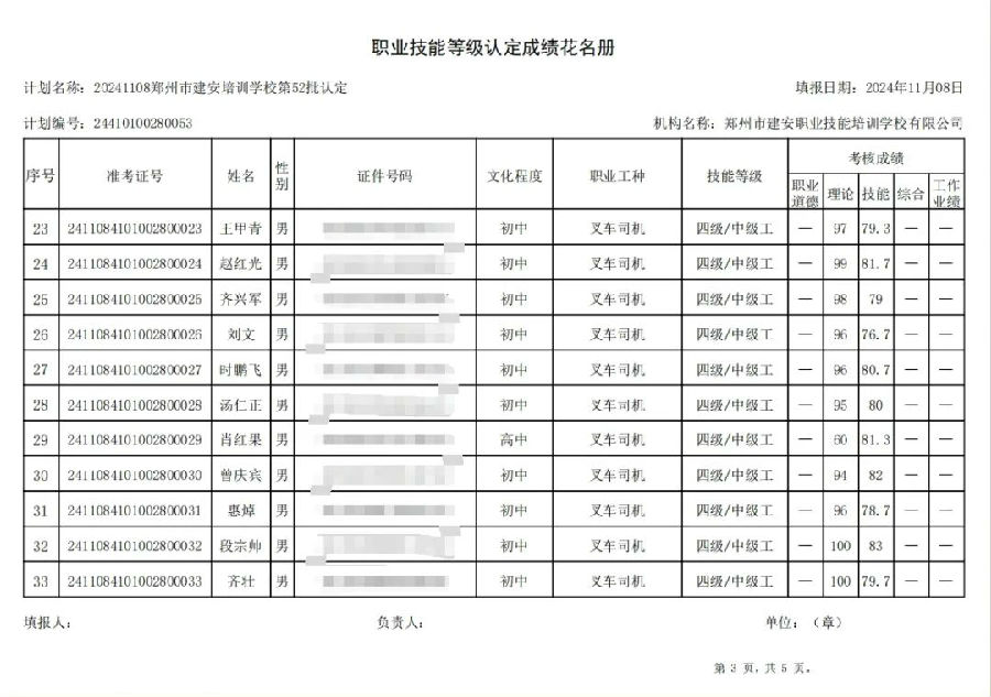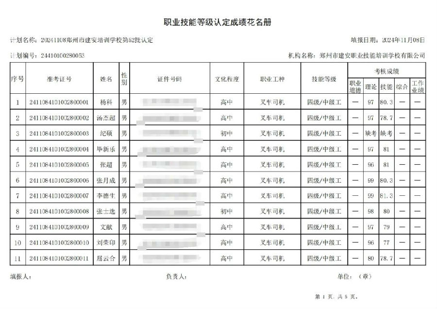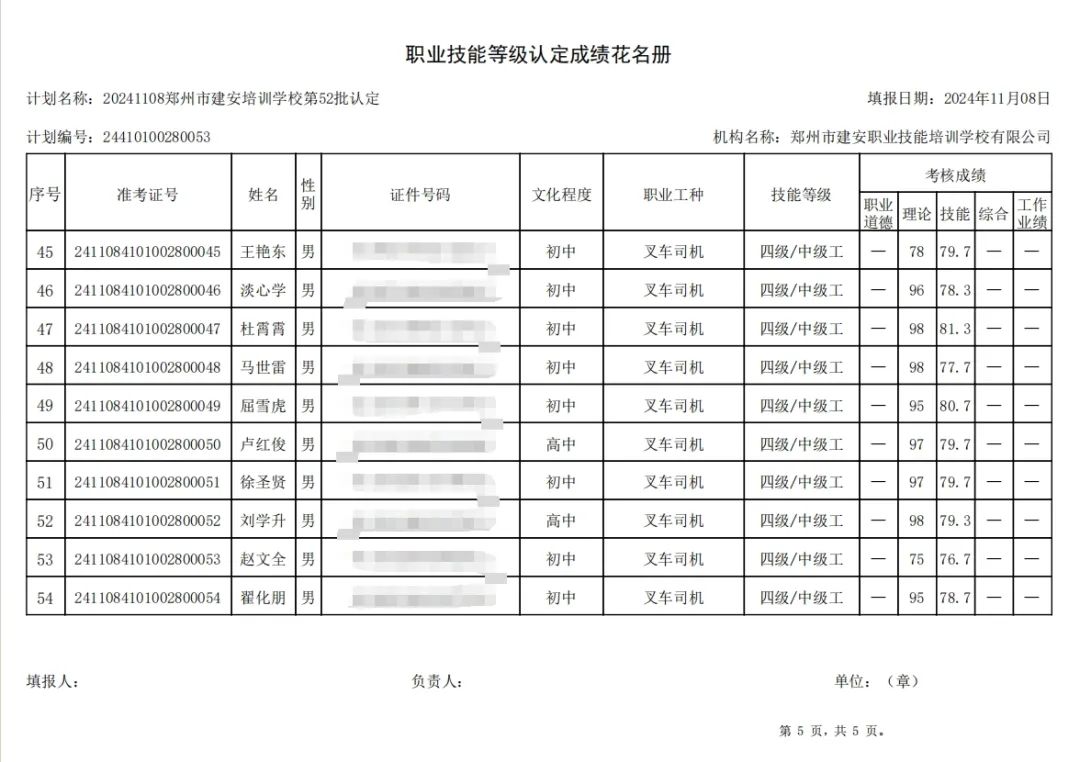 2024年11月8日,在郑州市建安职业技能培训学校进行的第52批次【叉车司机】职业技能等级认定考试,阅卷工作已结束,现将各位考生成绩予以公示,公示期为5天,公示期限为:2024年11月9日至2024年11月13日。