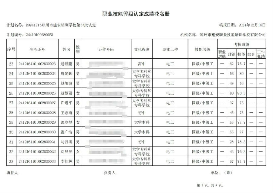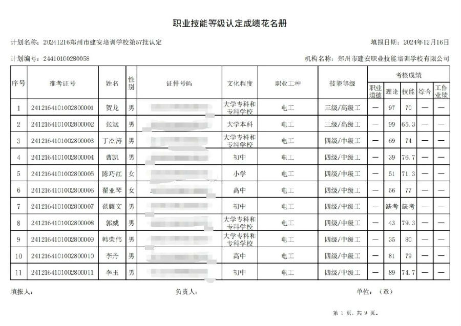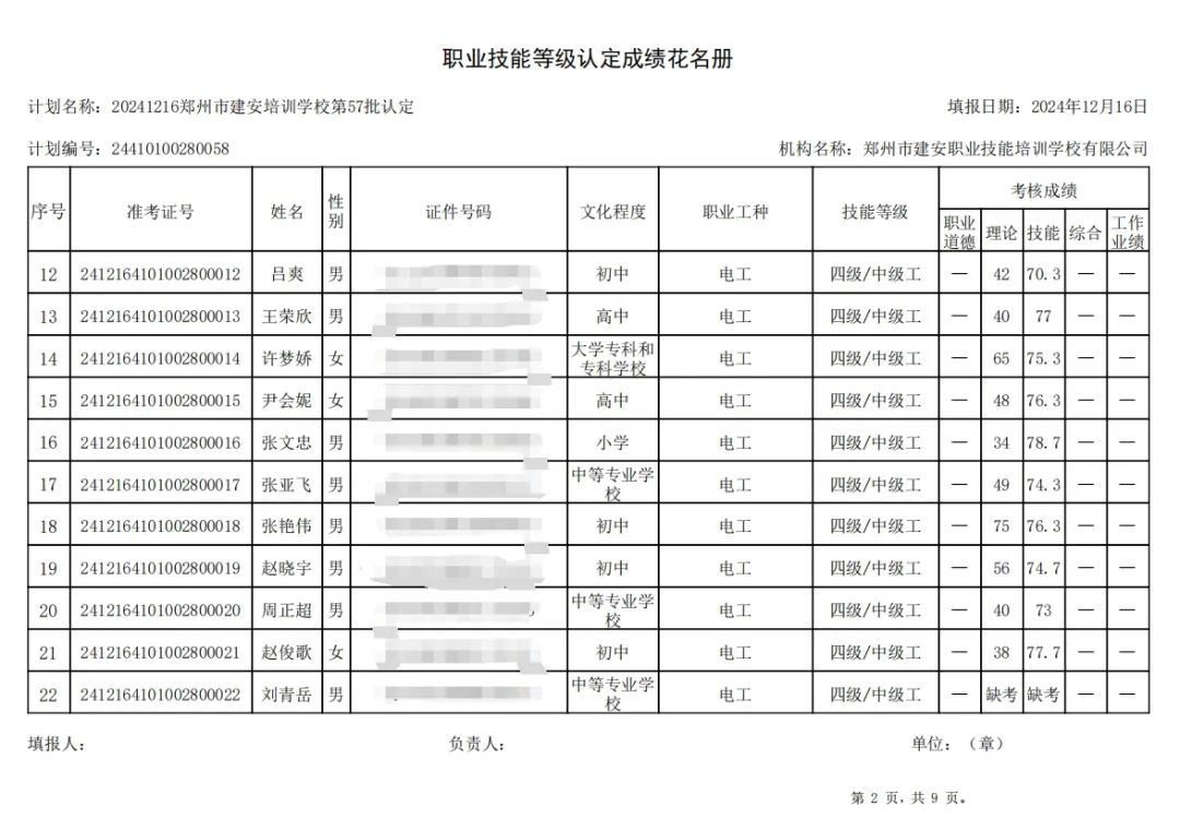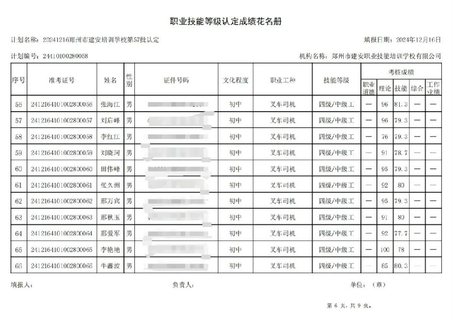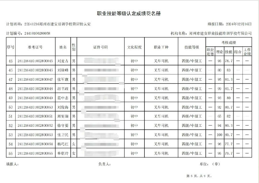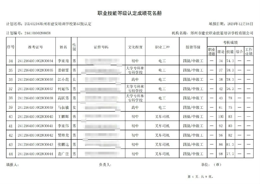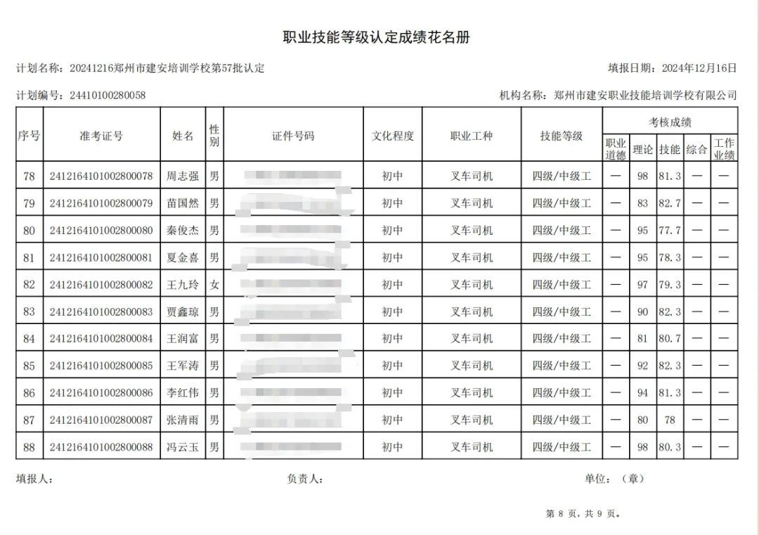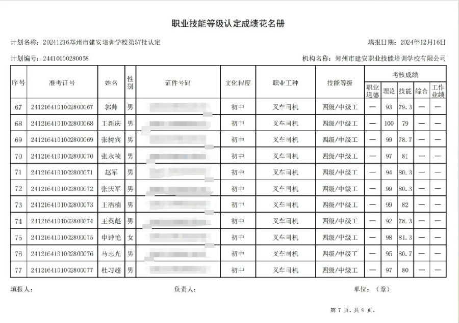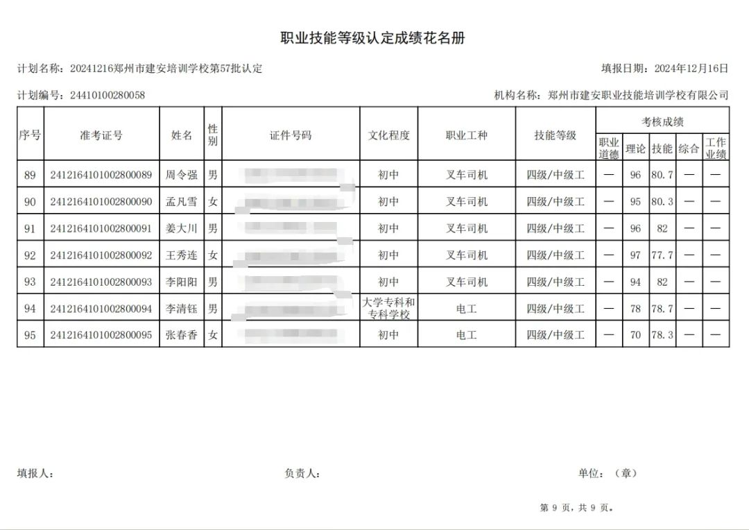 2024年12月16日,在郑州市建安职业技能培训学校进行的第57批次【叉车司机】【电工】职业技能等级认定考试,阅卷工作已结束,现将各位考生成绩予以公示,公示期为5天,公示期限为:2024年12月17日至2024年12月21日。