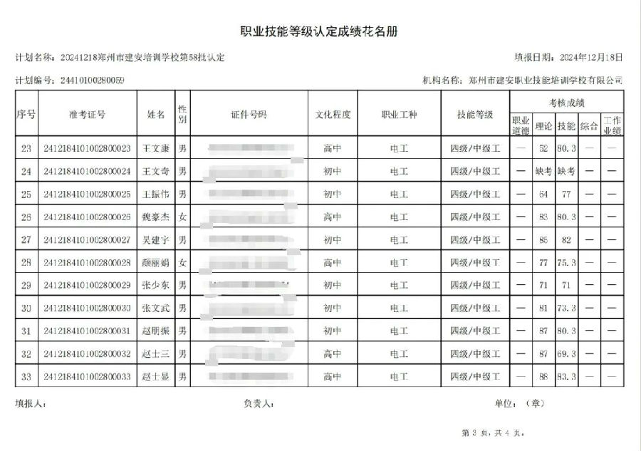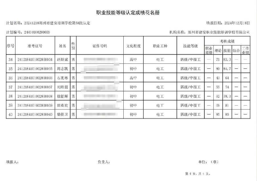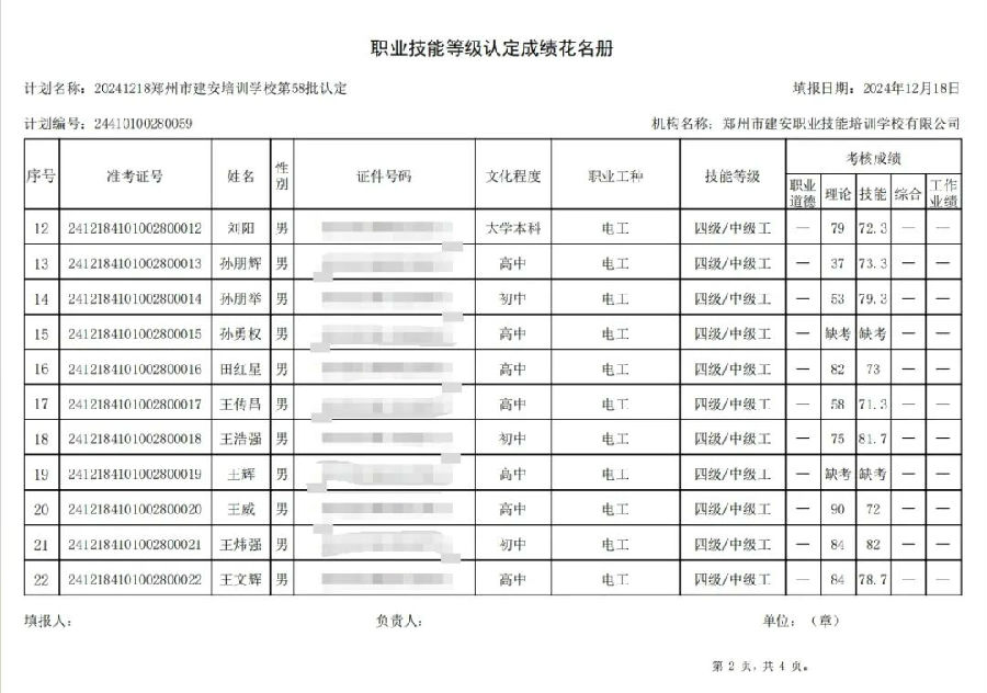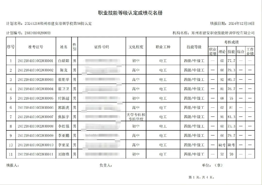 2024年12月18日,在郑州市建安职业技能培训学校进行的第58批次【电工】职业技能等级认定考试,阅卷工作已结束,现将各位考生成绩予以公示,公示期为5天,公示期限为:2024年12月21日至2024年12月25日。