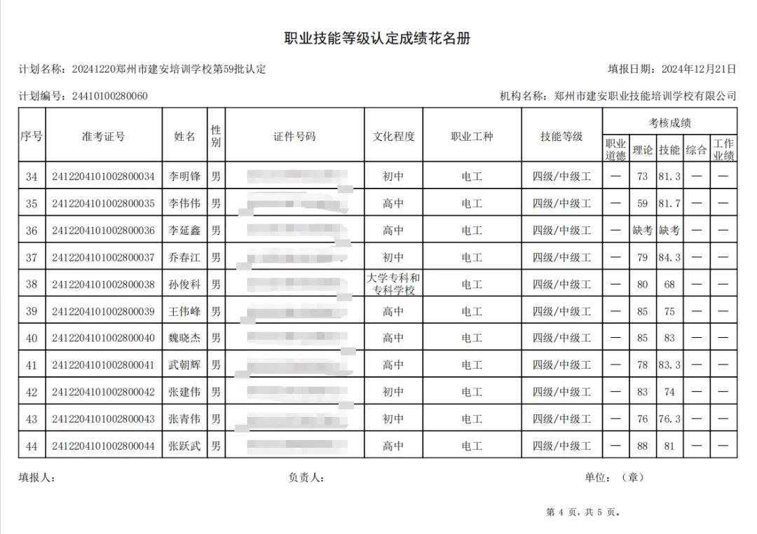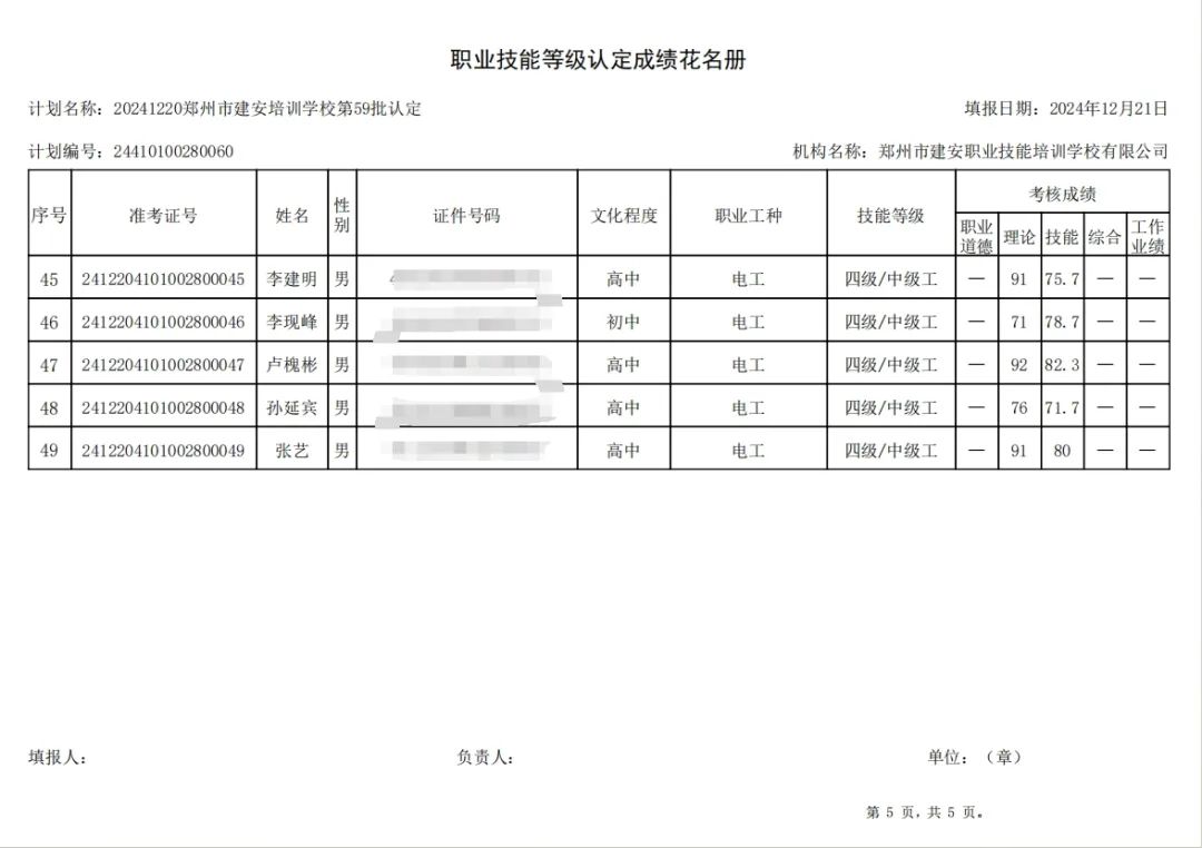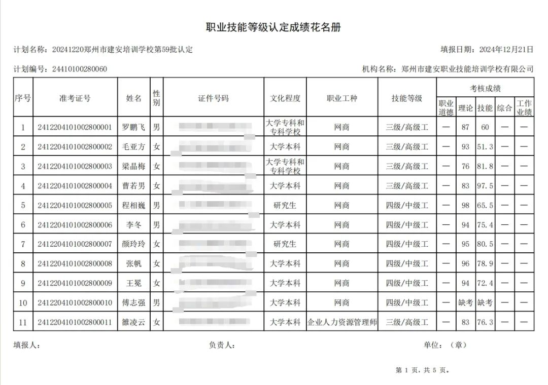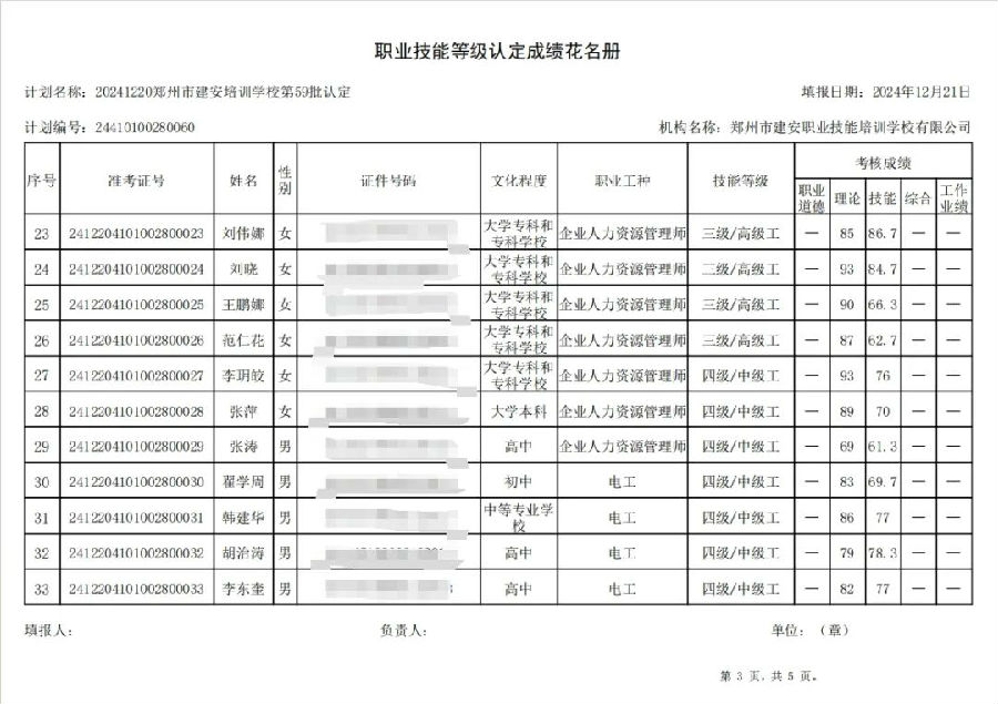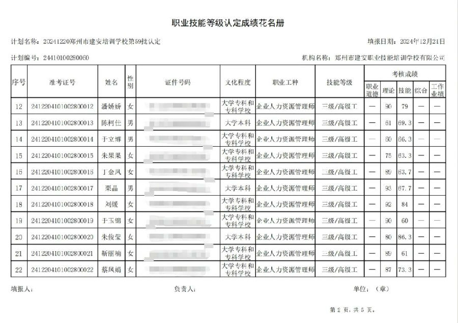 2024年12月20日,在郑州市建安职业技能培训学校进行的第59批次【网商】【企业人力资源管理师】【电工】职业技能等级认定考试,阅卷工作已结束,现将各位考生成绩予以公示,公示期为5天,公示期限为:2024年12月21日至2024年12月25日。